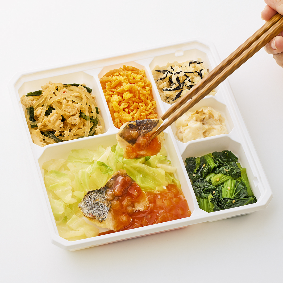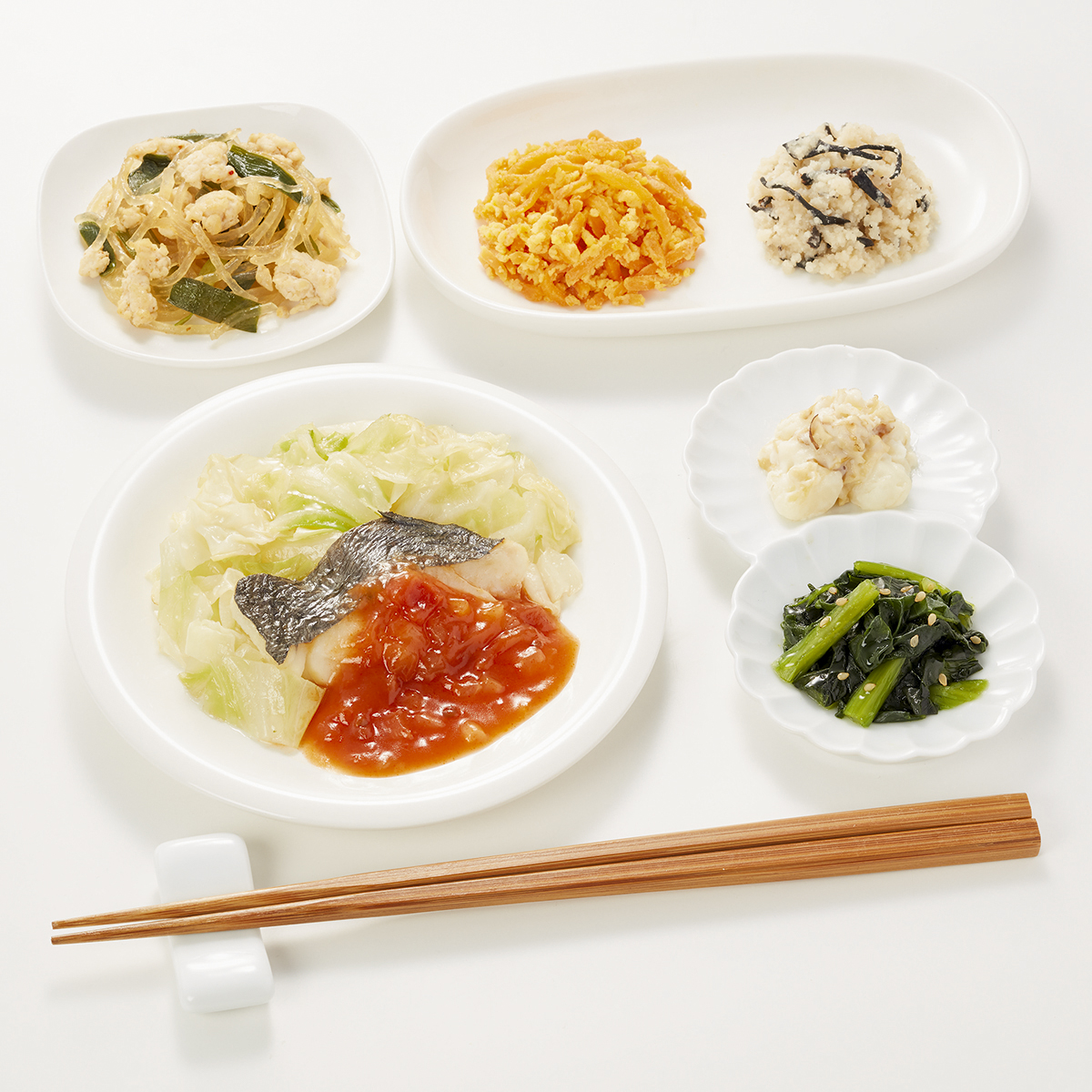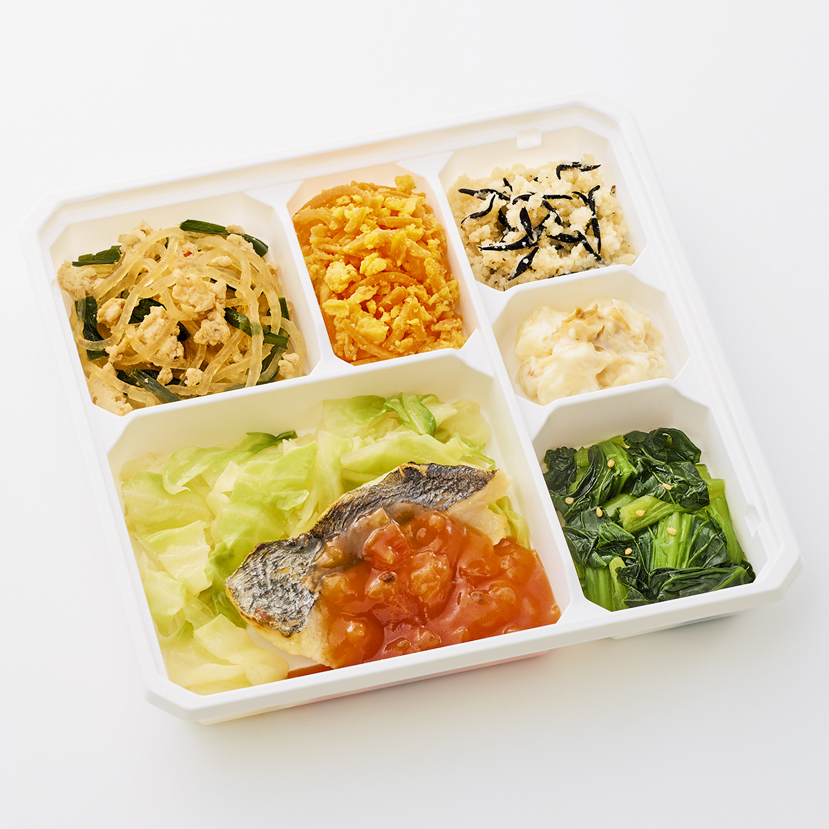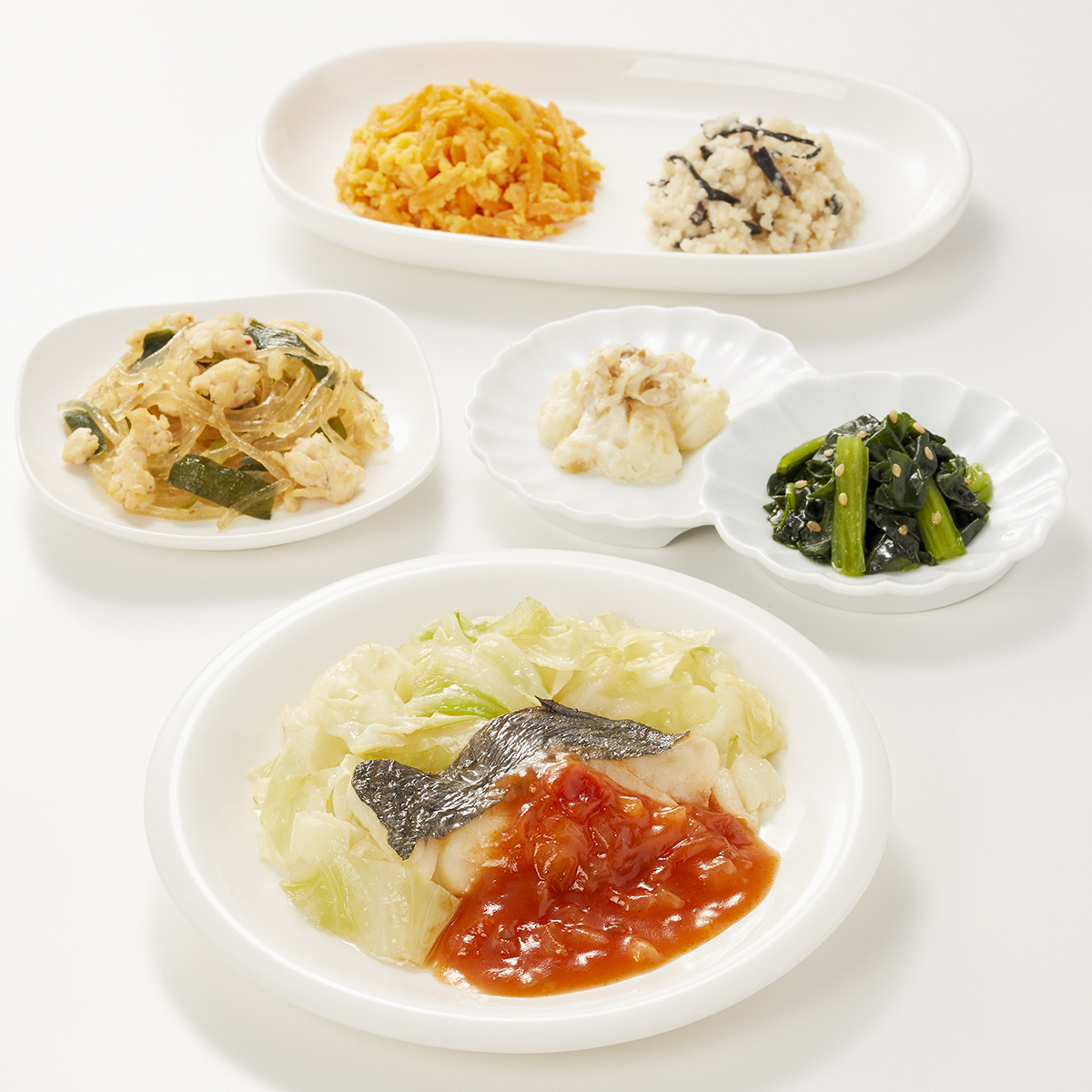 | 原材料名 | キャベツ(日本産)、ホキ(ニュージーランド産)、小松菜(中国産)、ポテトサラダ、はるさめ、鶏ひき肉、人参、卵、発酵調味料、トマト味付ソース、ケチャップ、おから、低カロリー甘味料、玉ねぎ、半固体状ドレッシング、醤油、調合ごま油、にら、植物油、ひじき、粉末調味料、醤油だし、かつお削り節、にんにく、しょうが、食塩、ごま、テンメンジャン、トウバンジャン、還元でん粉加水分解物/糊料(加工でん粉、CMC、増粘多糖類)、調味料(アミノ酸等)、ミョウバン、pH調整剤、甘味料(ラカンカ抽出物)、着色料(カラメル)、塩化Ca、酸化防止剤(V.E、V.C、チャ抽出物)、酸味料、酒精、香辛料、香料、(一部に小麦・卵・乳成分・オレンジ・牛肉・ごま・さば・ゼラチン・大豆・鶏肉・豚肉・りんごを含む) | ||
