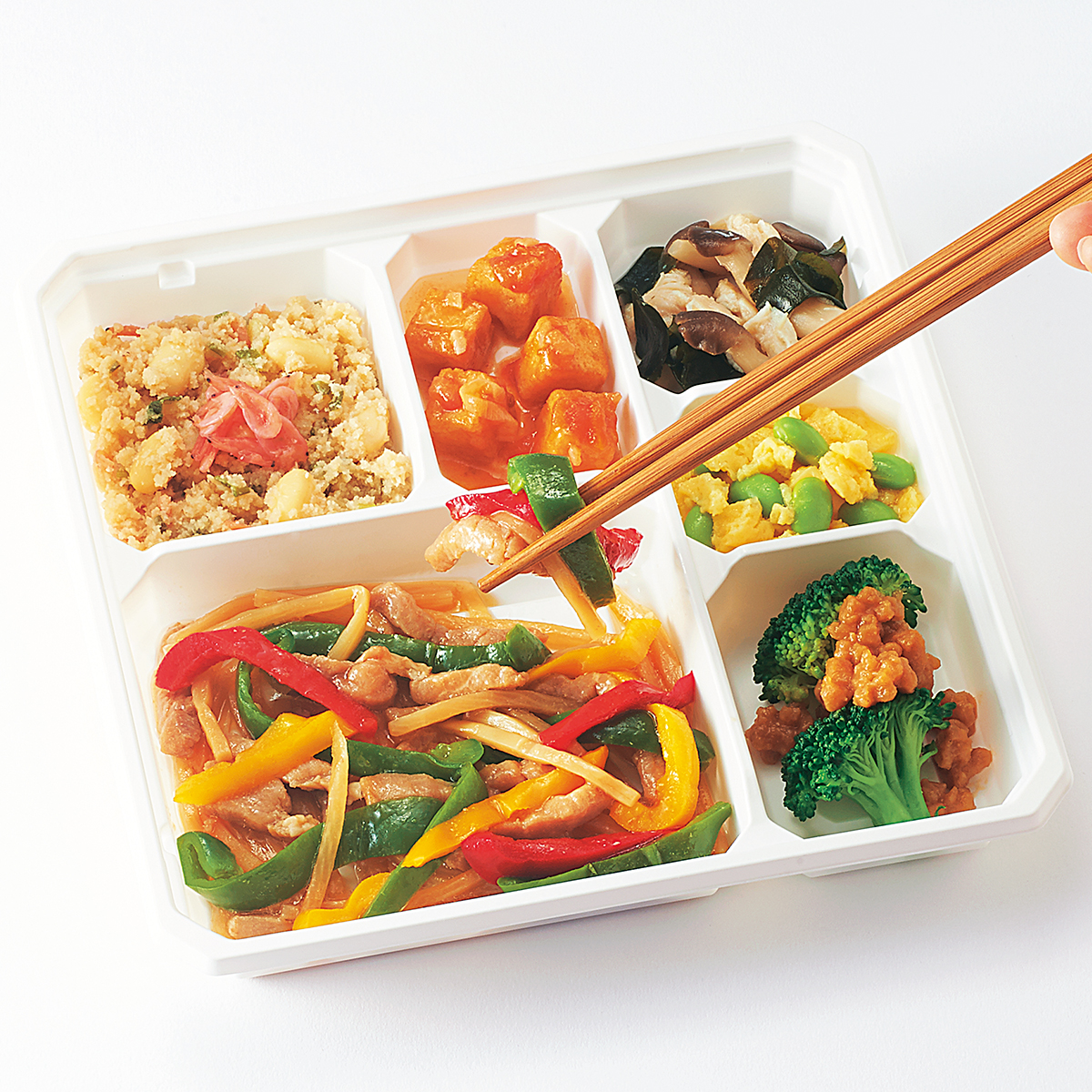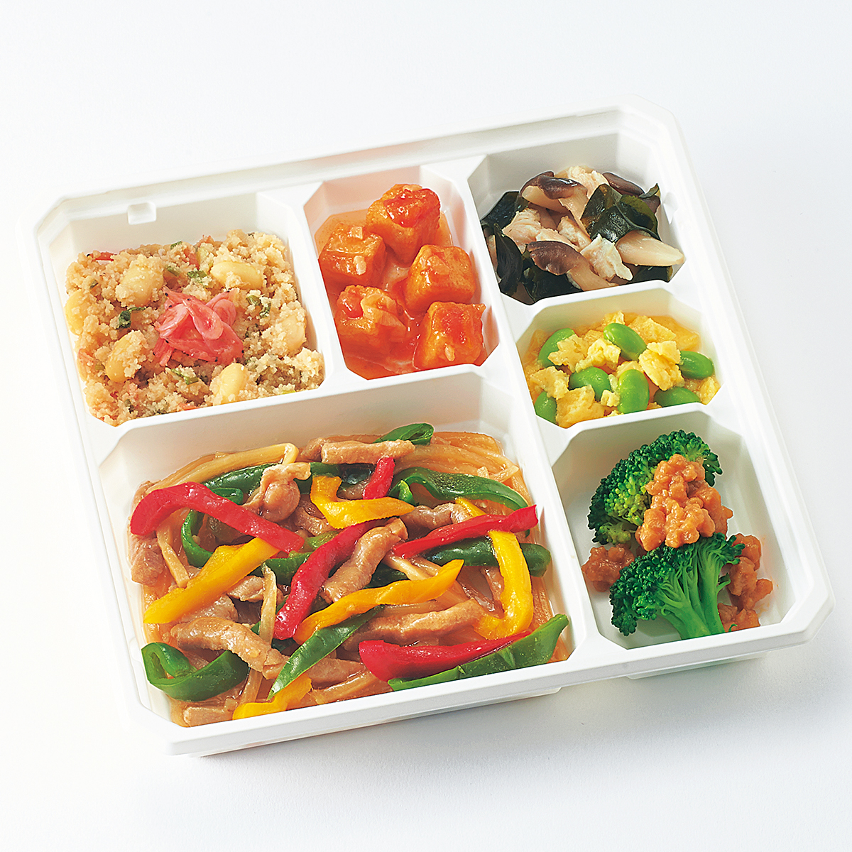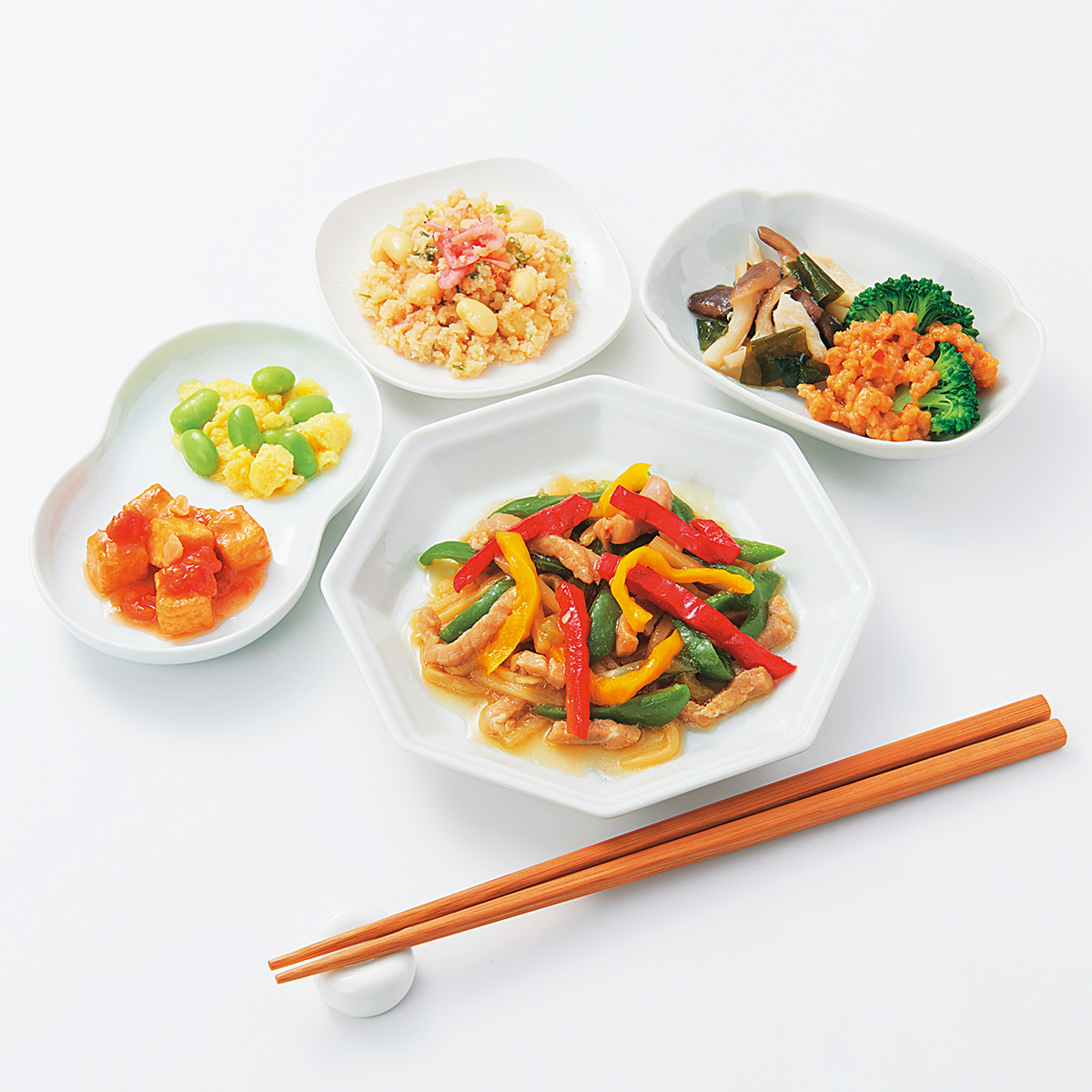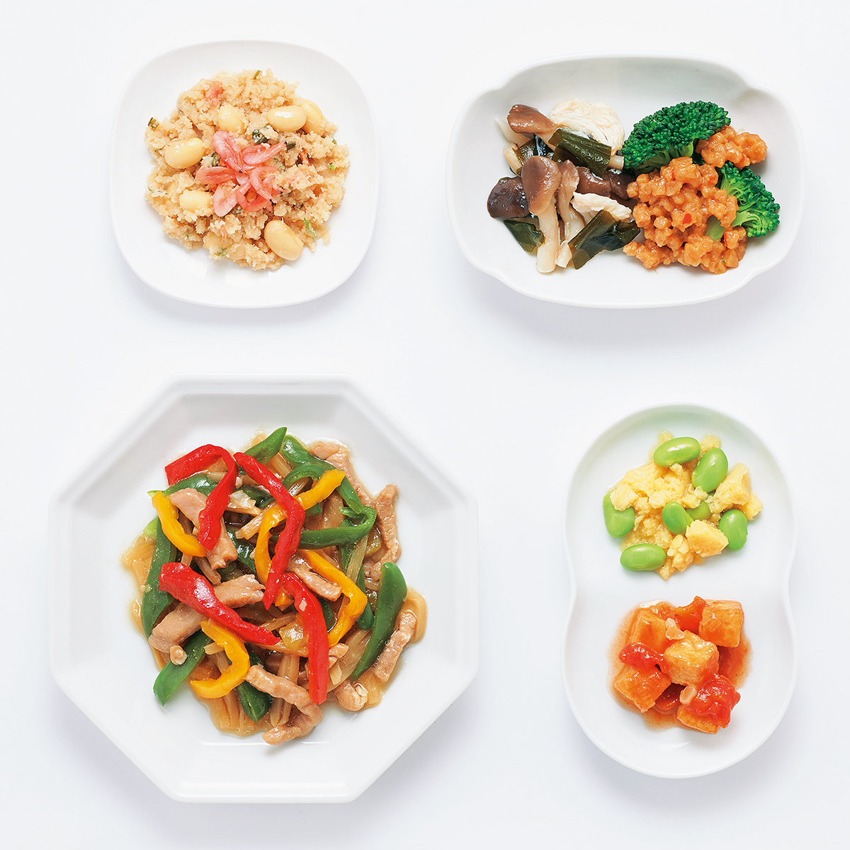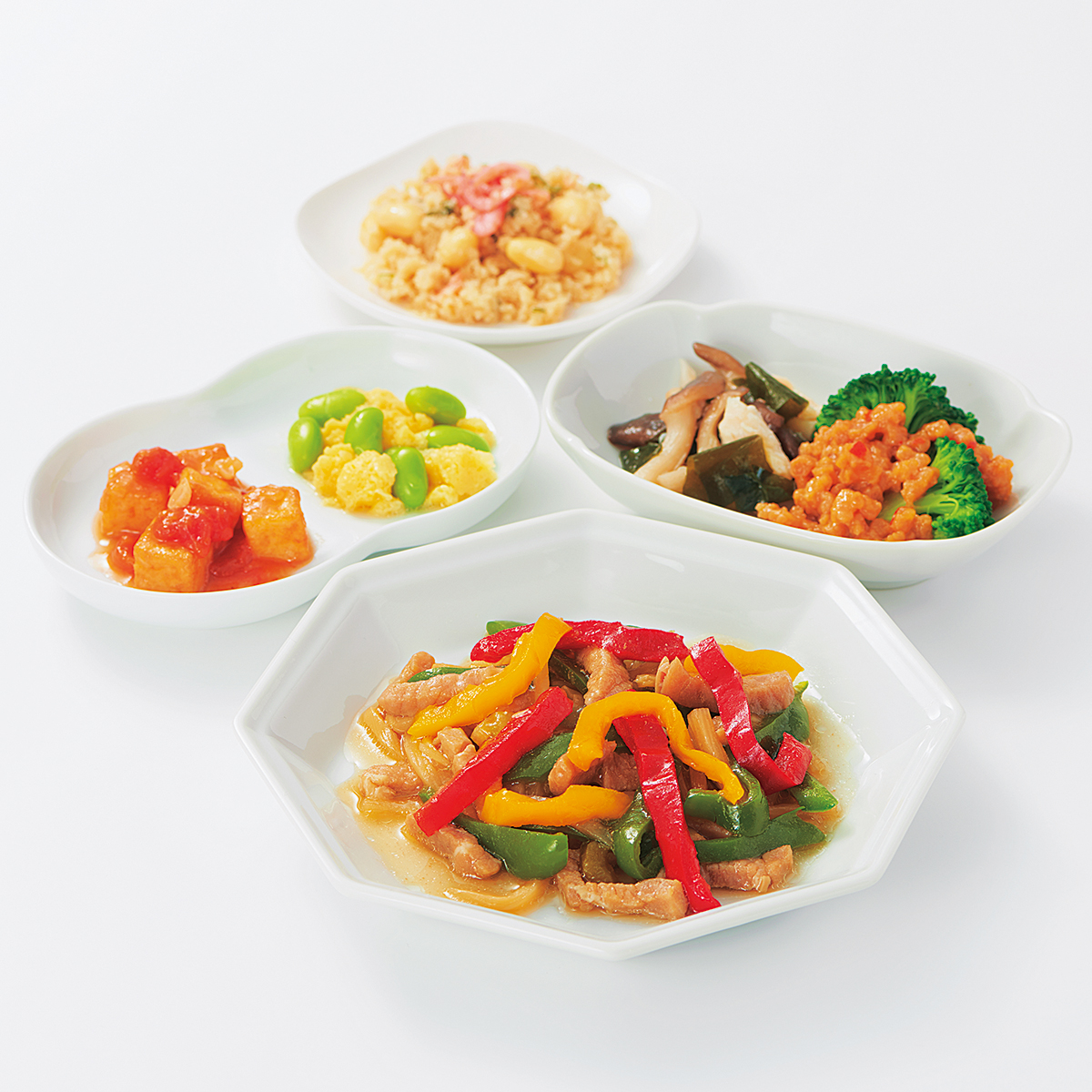 | 原材料名 | 緑ピーマン、ブロッコリー、豚肉、たけのこ水煮、厚揚げ、ひらたけ、赤ピーマン、枝豆、なたね油、黄ピーマン、炒り卵、蒸し鶏ほぐし身、大豆、上白糖、トマト・ピューレー漬、濃口醤油、発酵調味料、乾燥おから、ねぎ、粒状大豆たん白、味噌、乾燥小えび、オイスターソース、清酒、ケチャップ、ナンプラー、食塩、顆粒中華風だし、果実調味料、にんにく、ごま油、醸造酢、ゆず果汁、乾燥わかめ、しょうが、おろししょうが、顆粒和風だし、三温糖、豆板醤、おろしゆず皮、黒こしょう、白こしょう/増粘剤(加工デンプン、キサンタン)、調味料(アミノ酸等)、トレハロース、加工デンプン、凝固剤、pH調整剤、着色料(紅麹、カラメル)、酸化防止剤(V.C)、ポリリン酸Na、酸味料、(一部に小麦・卵・えび・牛肉・ごま・大豆・鶏肉・豚肉・ゼラチンを含む) | ||