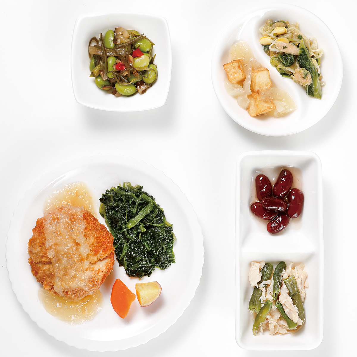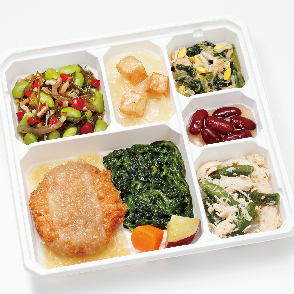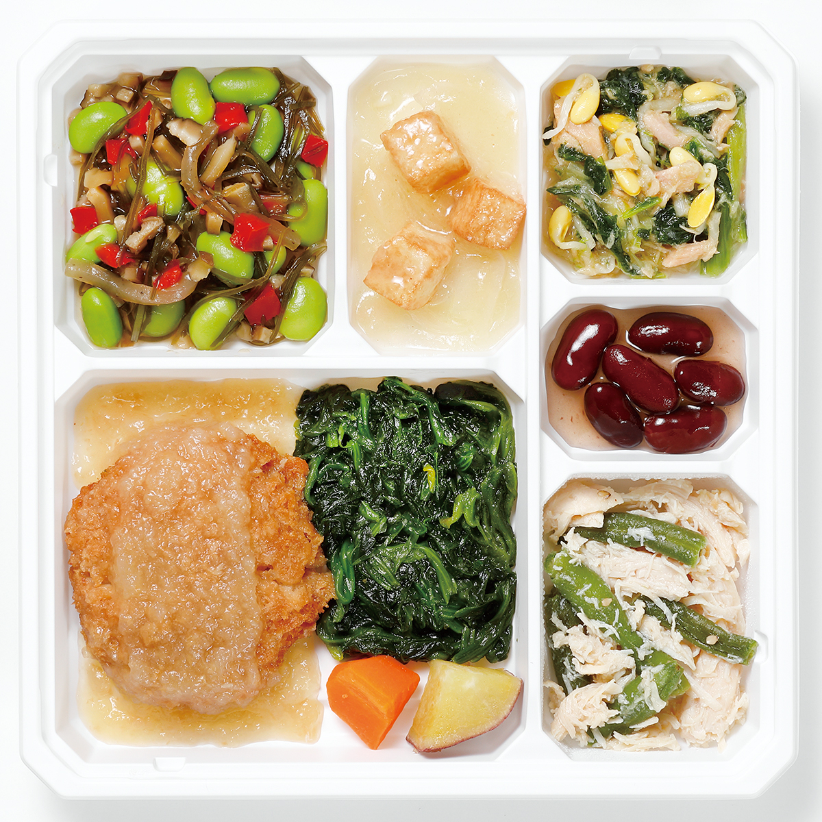 | 原材料名 | トンカツ、ほうれん草、大豆もやし、蒸し鶏ほぐし身、大根おろし、玉ねぎ、枝豆、小松菜、厚揚げ、なたね油、赤インゲン豆、サヤインゲン、人参、さつまいも、ツナフレーク、砂糖、こんにゃく、赤ピーマン、和風調味液、乾燥切り昆布、味噌、かつお・昆布だし、濃口醤油、発酵調味料、淡口醤油、乾燥しいたけ、はちみつ、おろししょうが、顆粒和風だし、清酒、本みりん、食塩、煎り白ごま、白こしょう/加工デンプン、糊料(加工デンプン、増粘多糖類)、調味料(アミノ酸等)、トレハロース、凝固剤、酸化防止剤(V.C)、ポリリン酸Na、カゼインNa、酸味料、水酸化Ca、乳化剤、(一部に小麦・卵・乳成分・ごま・さば・大豆・鶏肉・豚肉・魚醤(魚介類)を含む) | ||