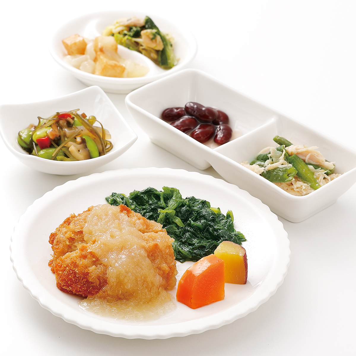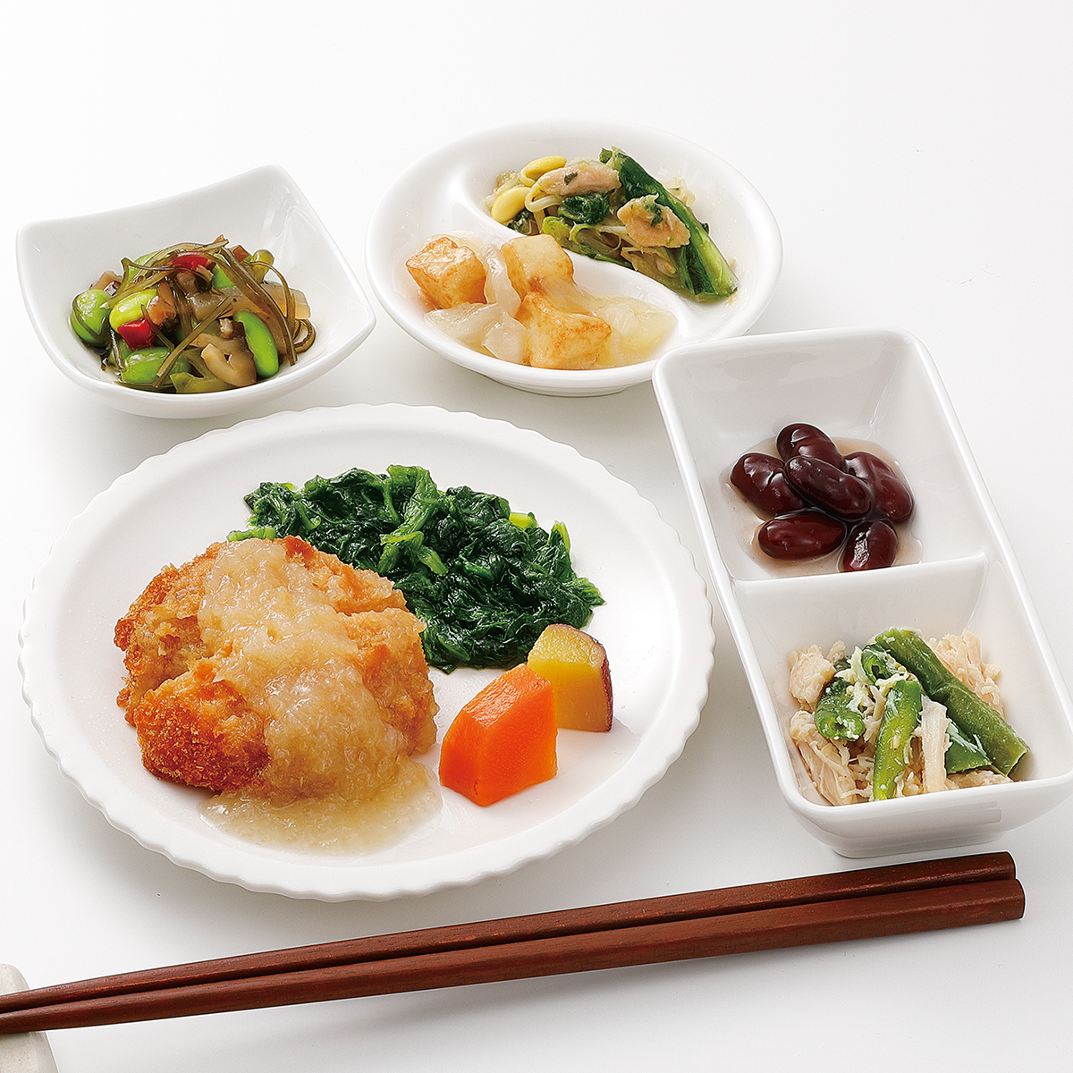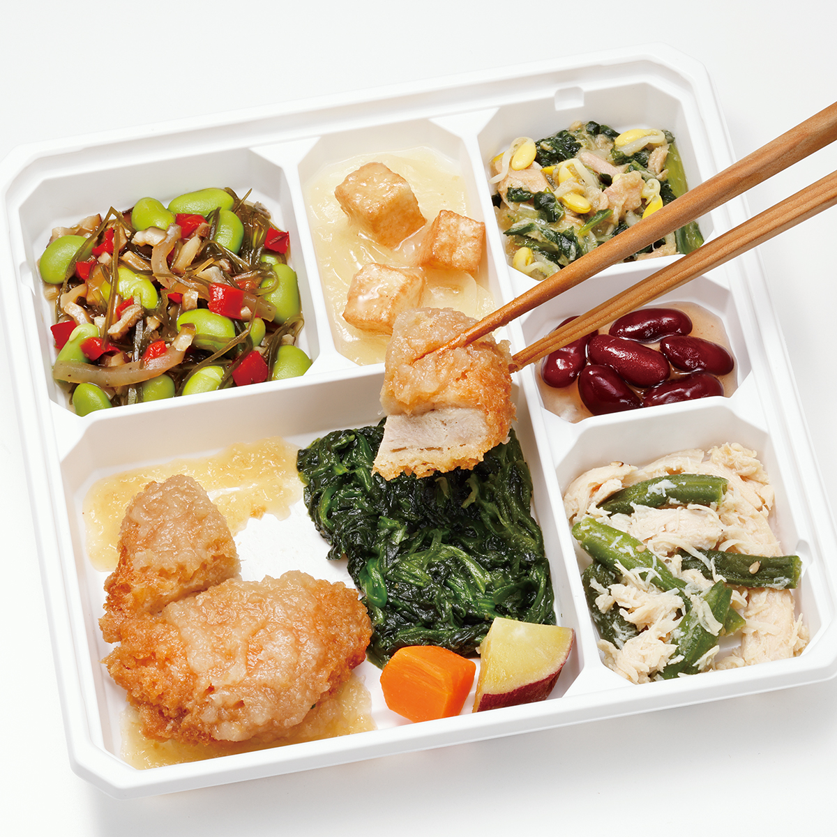 | 原材料名 | トンカツ、ほうれん草、大豆もやし、蒸し鶏ほぐし身、大根おろし、玉ねぎ、枝豆、小松菜、厚揚げ、なたね油、赤インゲン豆、サヤインゲン、人参、さつまいも、ツナフレーク、砂糖、こんにゃく、赤ピーマン、和風調味液、乾燥切り昆布、味噌、かつお・昆布だし、濃口醤油、発酵調味料、淡口醤油、乾燥しいたけ、はちみつ、おろししょうが、顆粒和風だし、清酒、本みりん、食塩、煎り白ごま、白こしょう/加工デンプン、糊料(加工デンプン、増粘多糖類)、調味料(アミノ酸等)、トレハロース、凝固剤、酸化防止剤(V.C)、ポリリン酸Na、カゼインNa、酸味料、水酸化Ca、乳化剤、(一部に小麦・卵・乳成分・ごま・さば・大豆・鶏肉・豚肉・魚醤(魚介類)を含む) | ||