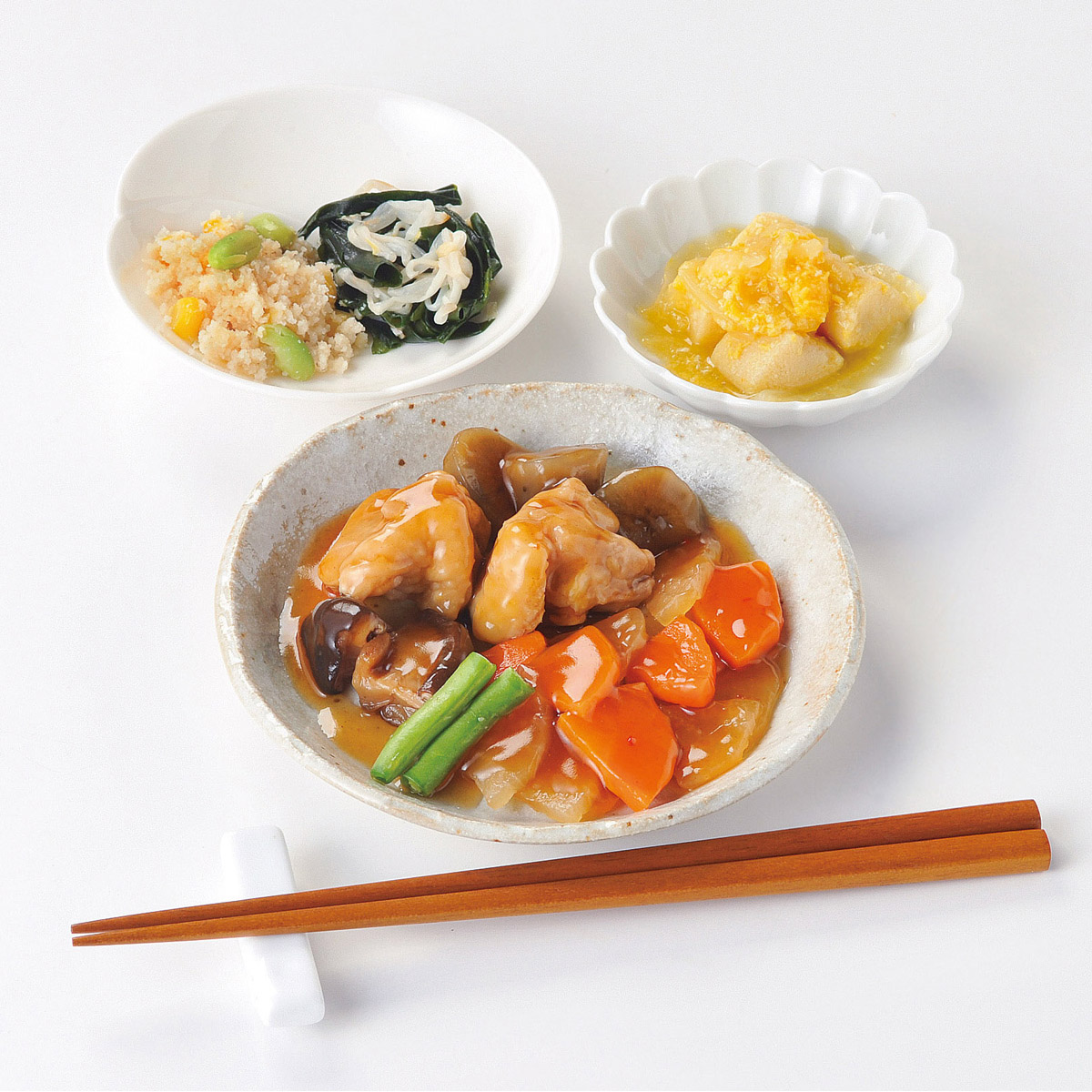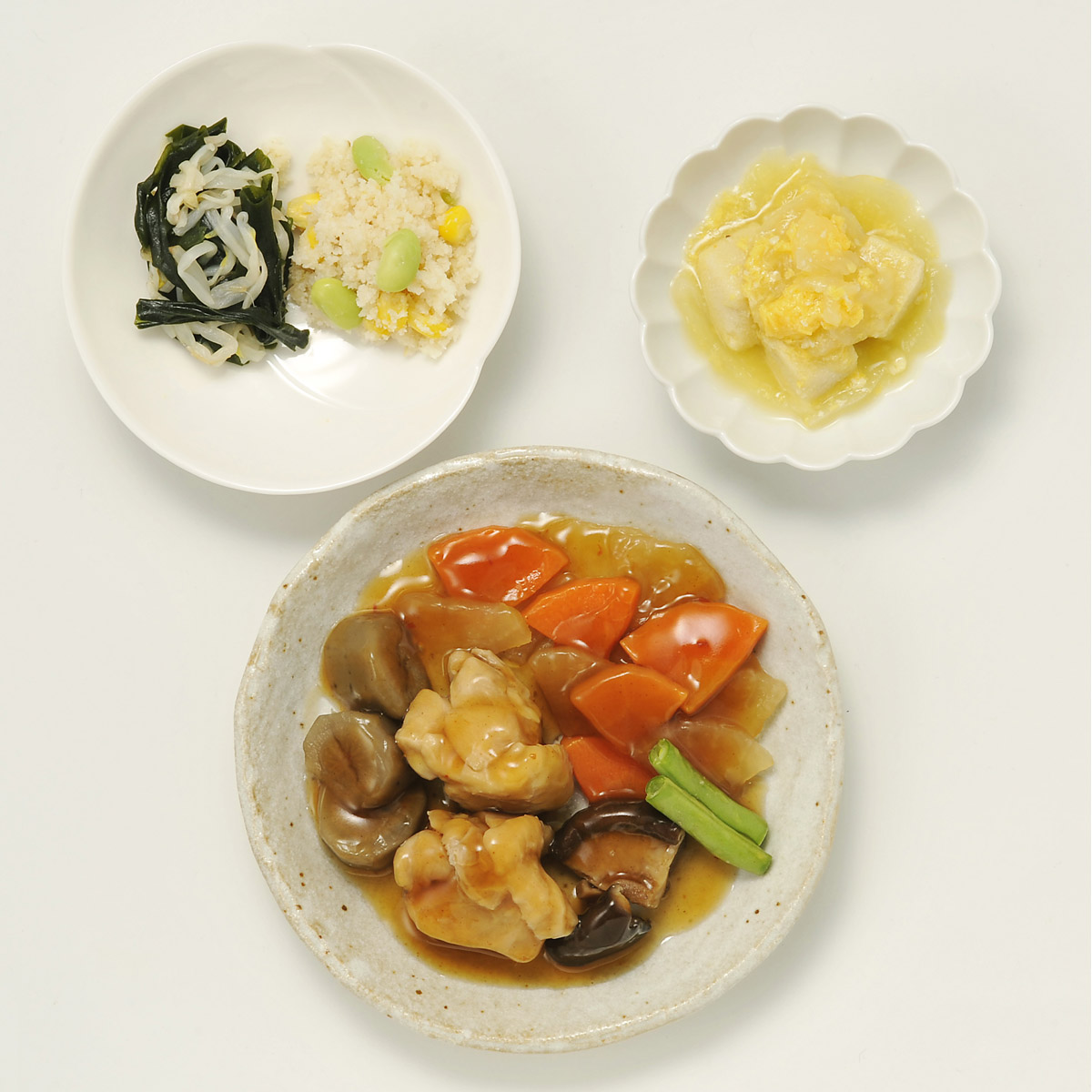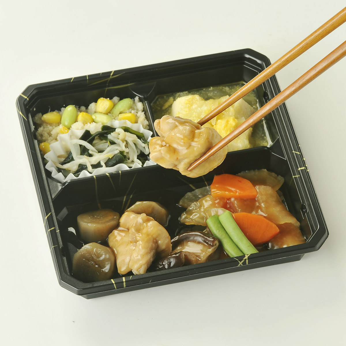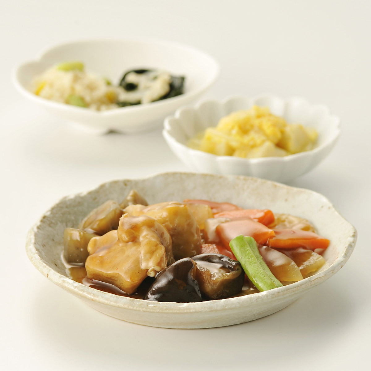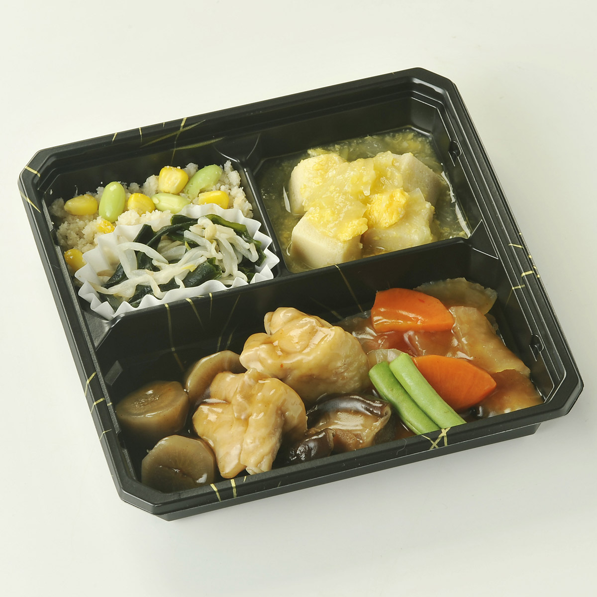 | 原材料名 | 鶏肉、大根、もやし、玉ねぎ、和風調味液[醤油、糖類(砂糖、果糖ぶどう糖液糖)、その他]、ごぼう、人参、スクランブルエッグ、濃口醤油、上白糖、コーン、枝豆、清酒、減塩醤油、高野豆腐、サヤインゲン、乾燥おから、本みりん、顆粒和風だし、乾燥しいたけ、発酵調味料、ごま油、大豆油、淡口醤油、食塩、乾燥わかめ、豆板醤、顆粒中華風だし/増粘剤(加工デンプン、キサンタン)、調味料(アミノ酸等)、加工デンプン、グリシン、酢酸Na、凝固剤、重曹、酸味料、pH調整剤、甘味料(カンゾウ、ステビア)、(一部に小麦・卵・乳成分・牛肉・ごま・さば・大豆・鶏肉・豚肉・ゼラチン・魚醤(魚介類)を含む) | ||