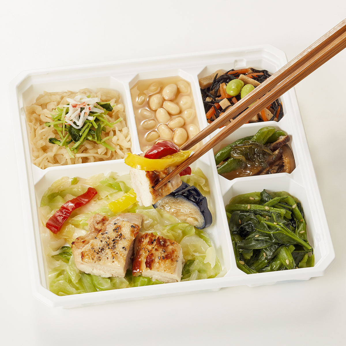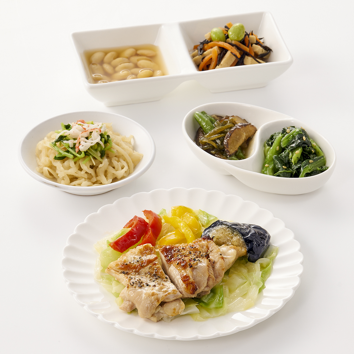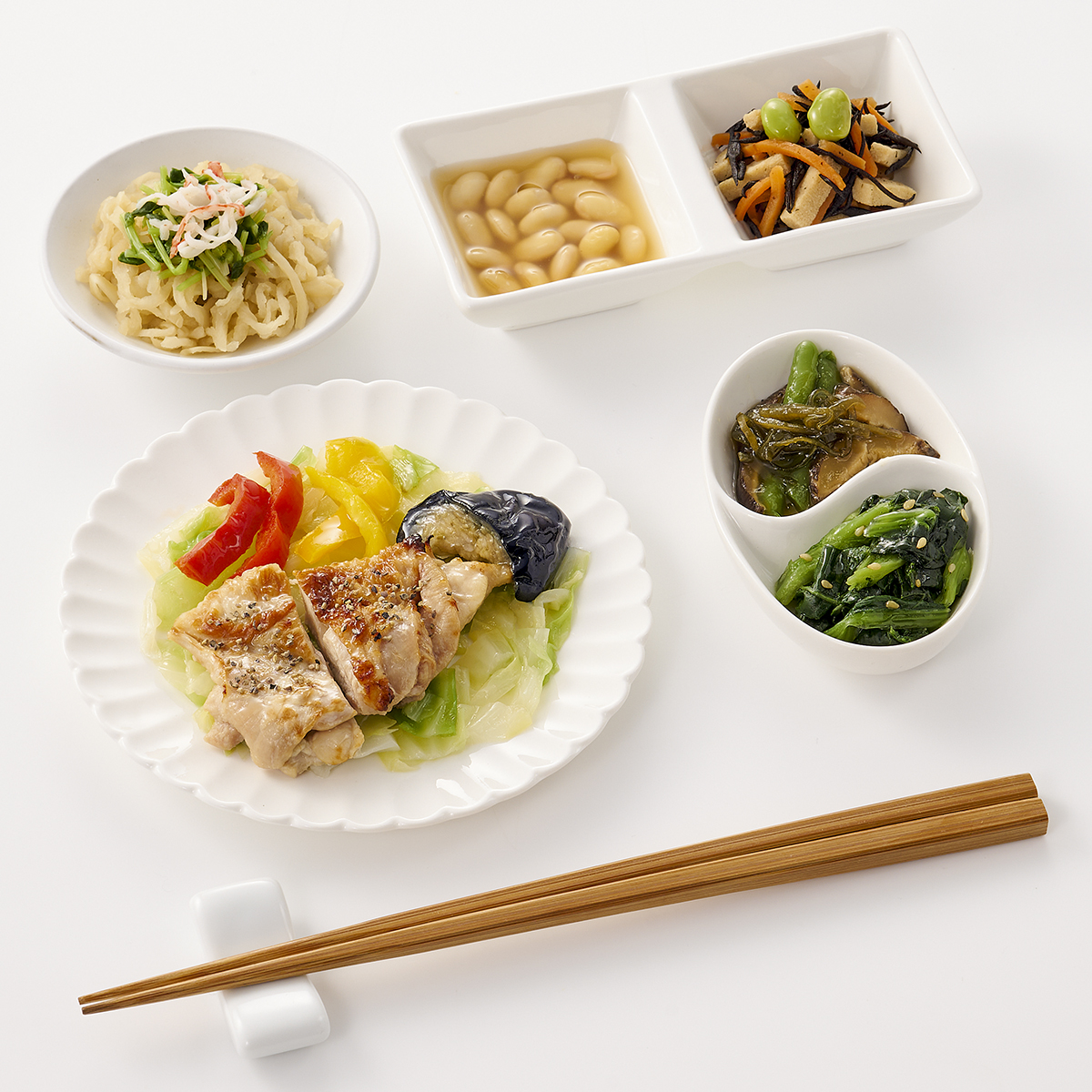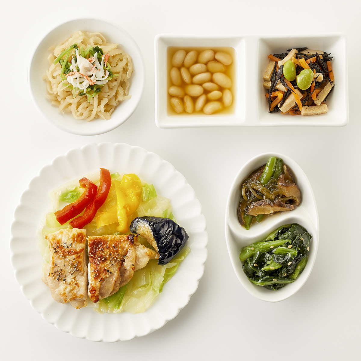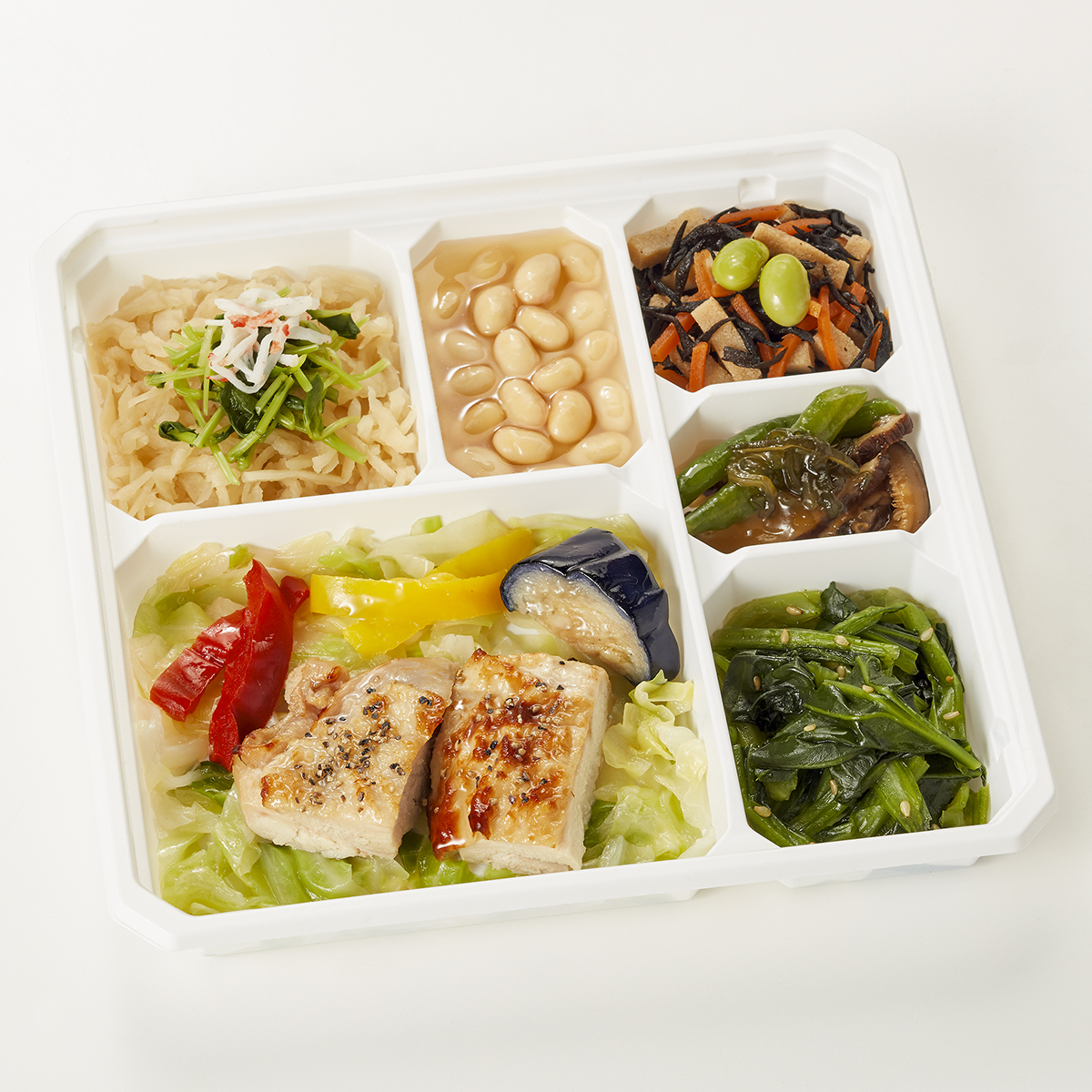 | 原材料名 | 鶏肉(ブラジル産)、キャベツ(日本産)、小松菜(中国産)、水煮大豆、人参、ピーマン、揚げなす、ひじき、しいたけ、いんげん豆、豆苗、切干大根、みりん風調味料、醤油、醤油だし、高野豆腐、発酵調味料、枝豆、砂糖、魚肉ねり製品、植物油、ごま、塩こんぶ、黒胡椒、にんにく、食塩、デキストリン、白キクラゲ抽出物/増粘剤(加工でん粉、増粘多糖類)、調味料(アミノ酸等)、甘味料(ソルビット、カンゾウ)、加工でん粉、pH調整剤、凝固剤、重曹、炭酸Ca、ミョウバン、着色料(トマト色素)、香料、酸味料、乳化剤、酒精、(一部に小麦・かに・オレンジ・ごま・さば・大豆・鶏肉を含む) | ||