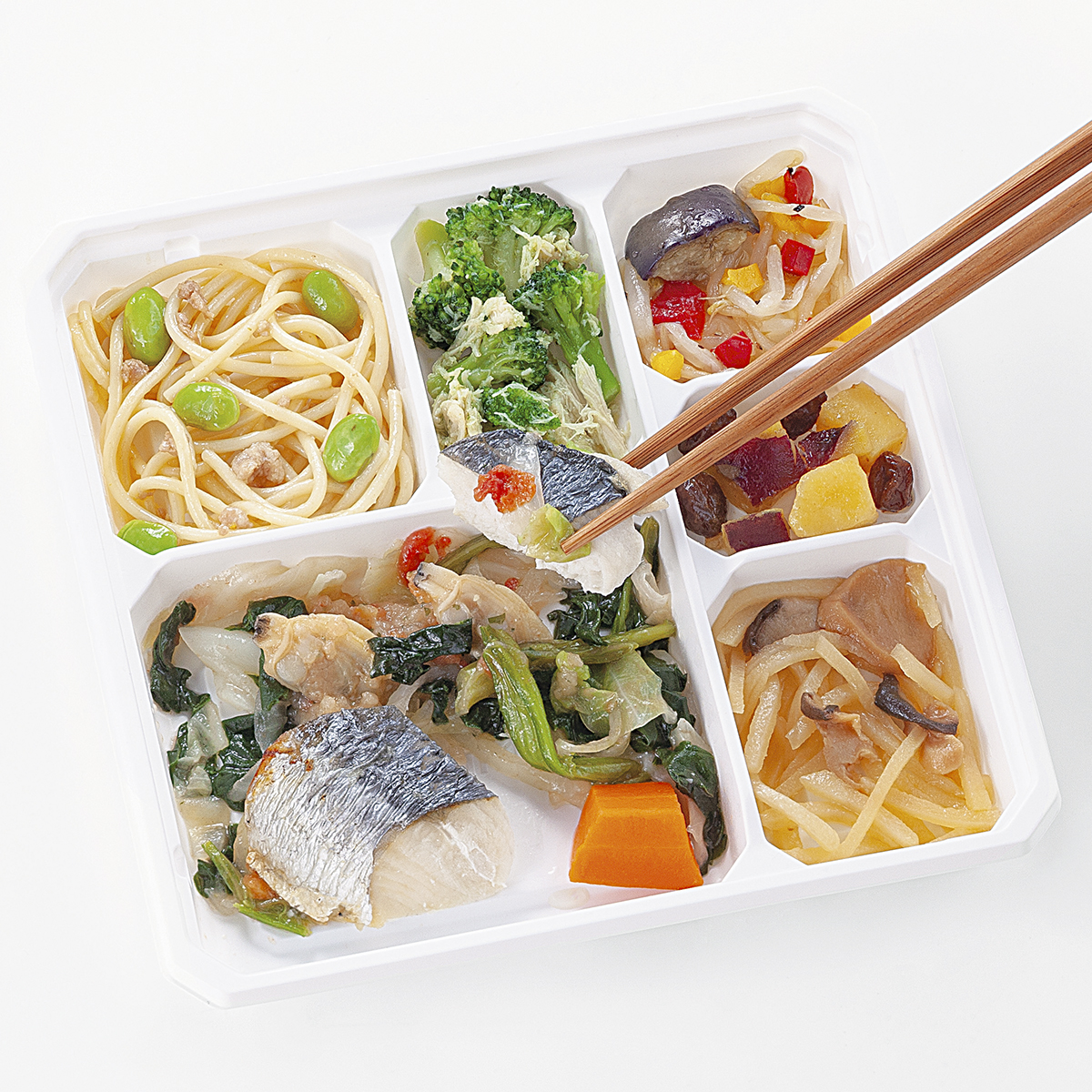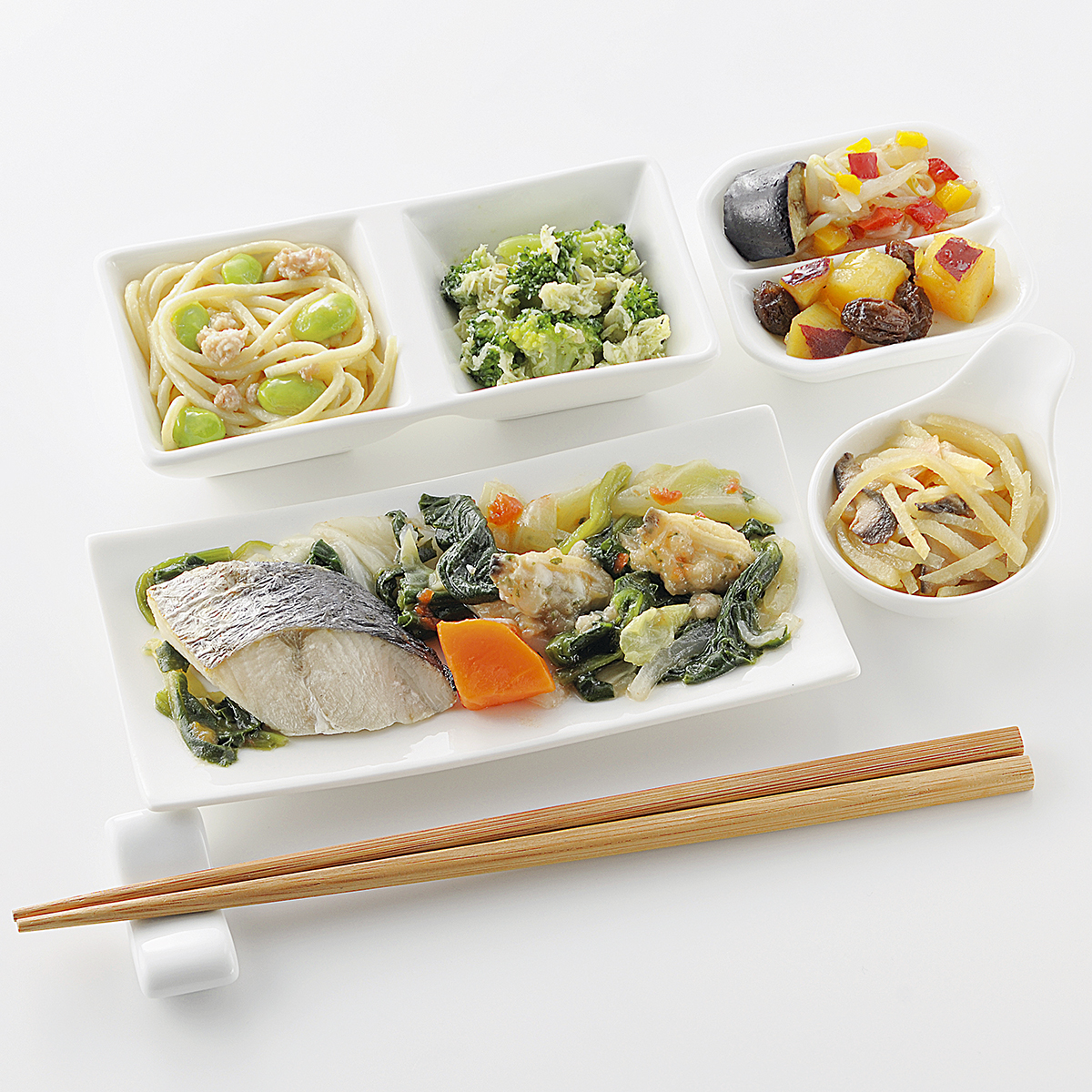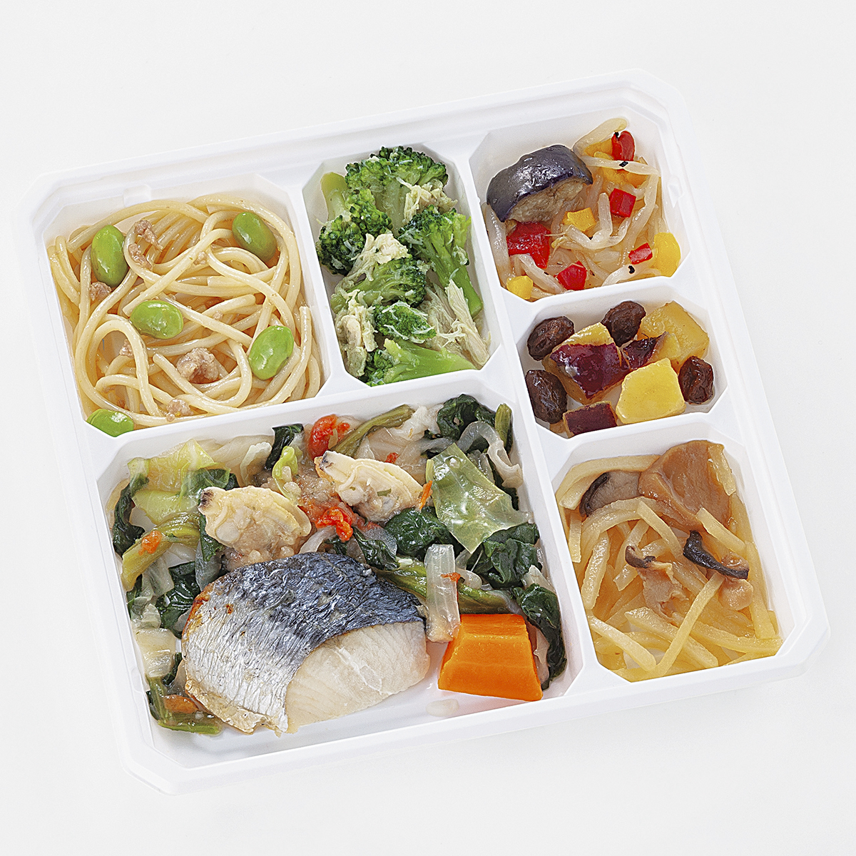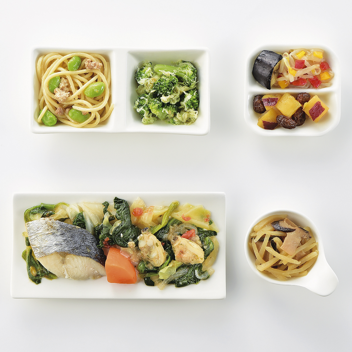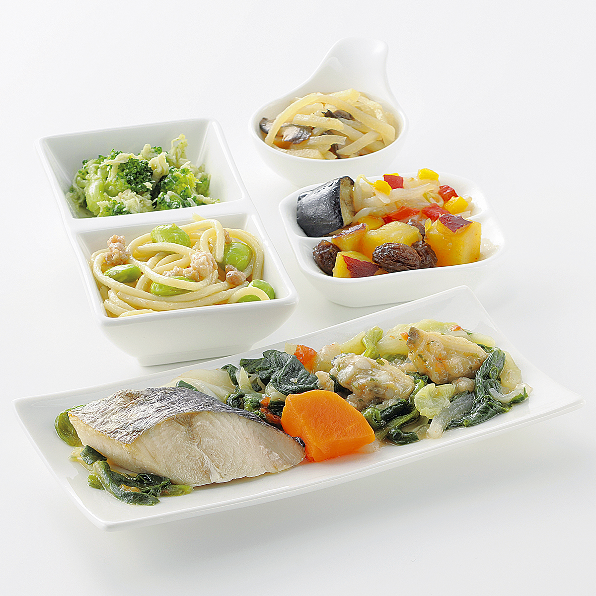 | 原材料名 | サワラ、ブロッコリー、キャベツ、じゃがいも、ほうれん草、玉ねぎ、もやし、さつまいも、スパゲティ、素揚げなす、あさり、枝豆、蒸し鶏ほぐし身、人参、トマト・トマトジュース漬、なたね油、エリンギ水煮、レーズン、三温糖、豚肉、黄ピーマン、赤ピーマン、濃口醤油、食塩、白ワイン、バジルソース、バターフレーバーオイル、本みりん、はちみつ、おろしにんにく、ほうれん草ピューレー、オリーブオイル、調合油(なたね油、ごま油)、顆粒洋風だし、ホタテエキスパウダー、ゆずごしょう、ゼラチン、白こしょう、パセリ粉、黒こしょう/増粘剤(加工デンプン)、調味料(アミノ酸等)、酸化防止剤(V.C)、ポリリン酸Na、香料、pH調整剤、乳化剤、酸味料、香辛料、着色料(クチナシ、カロテン)、(一部に小麦・乳成分・牛肉・ごま・大豆・鶏肉・豚肉・ゼラチンを含む) | ||