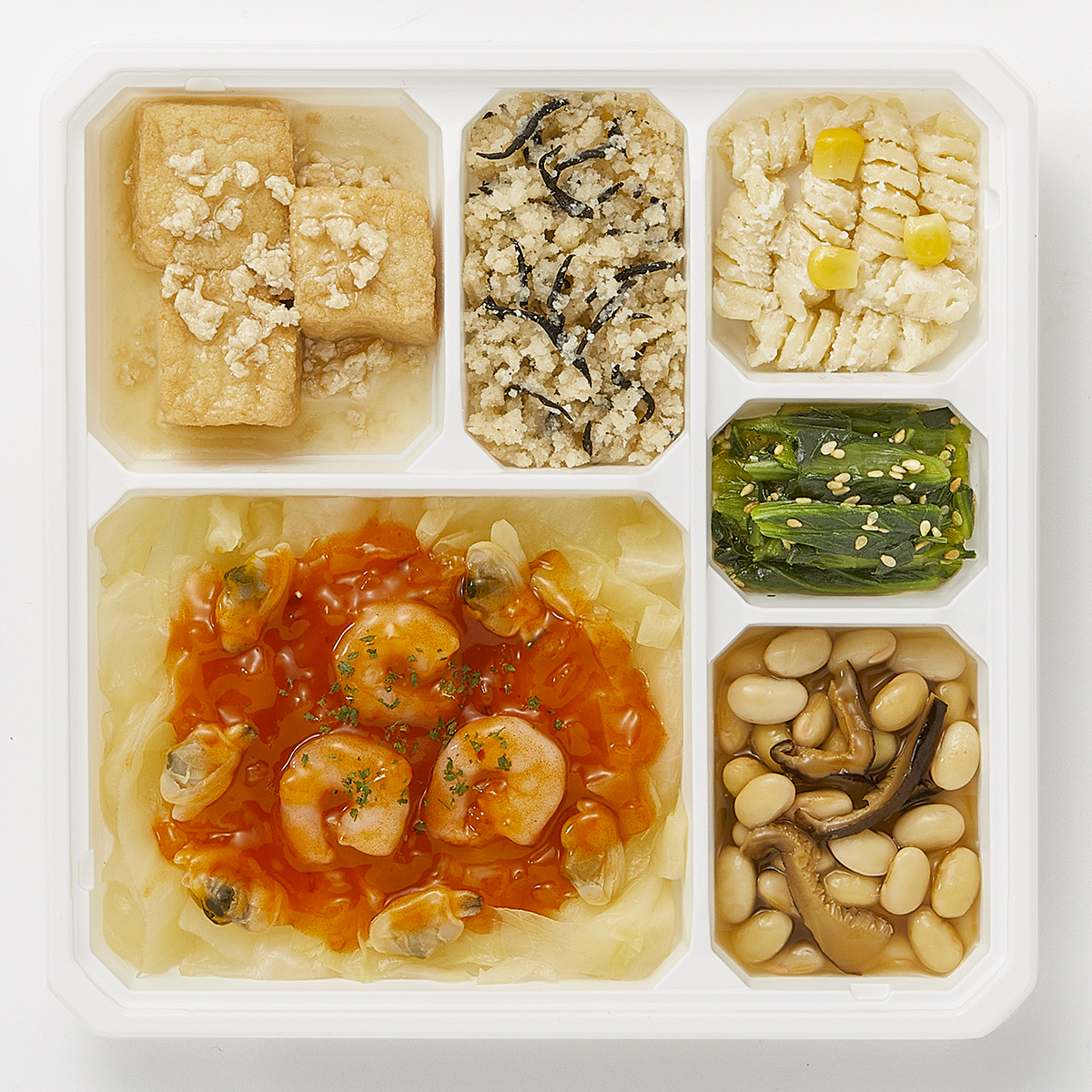 | 原材料名 | キャベツ(日本産)、厚揚げ、水煮大豆、小松菜、マカロニ、唐辛子入りソース、えび(タイ産)、半固体状ドレッシング、玉ねぎ、ボイルアサリ(中国産)、しいたけ、発酵調味料、砂糖、醤油、おから、鶏ひき肉、ひじき、とうもろこし、植物油、みりん風調味料、醤油だし、ごま、粉末調味料、パセリ、塩こしょう、食塩、還元澱粉加水分解物/糊料(加工でん粉、増粘多糖類、寒天)、トレハロース、加工でん粉、凝固剤、調味料(アミノ酸等)、pH調整剤、着色料(パプリカ色素)、レシチン、酒精、香辛料、酸味料、香料、(一部に小麦・卵・乳成分・えび・オレンジ・牛肉・ごま・さば・ゼラチン・大豆・鶏肉・豚肉・りんごを含む) | ||