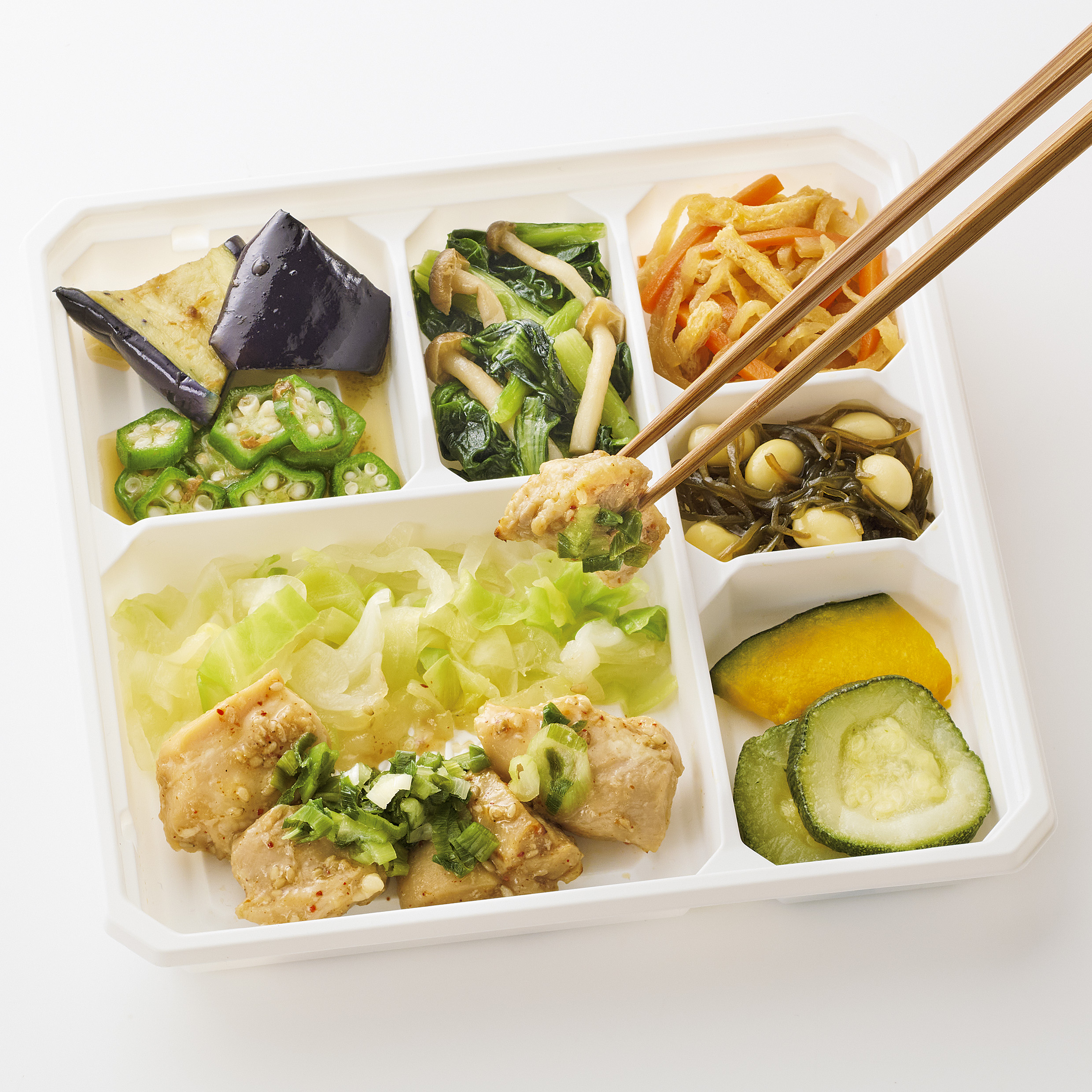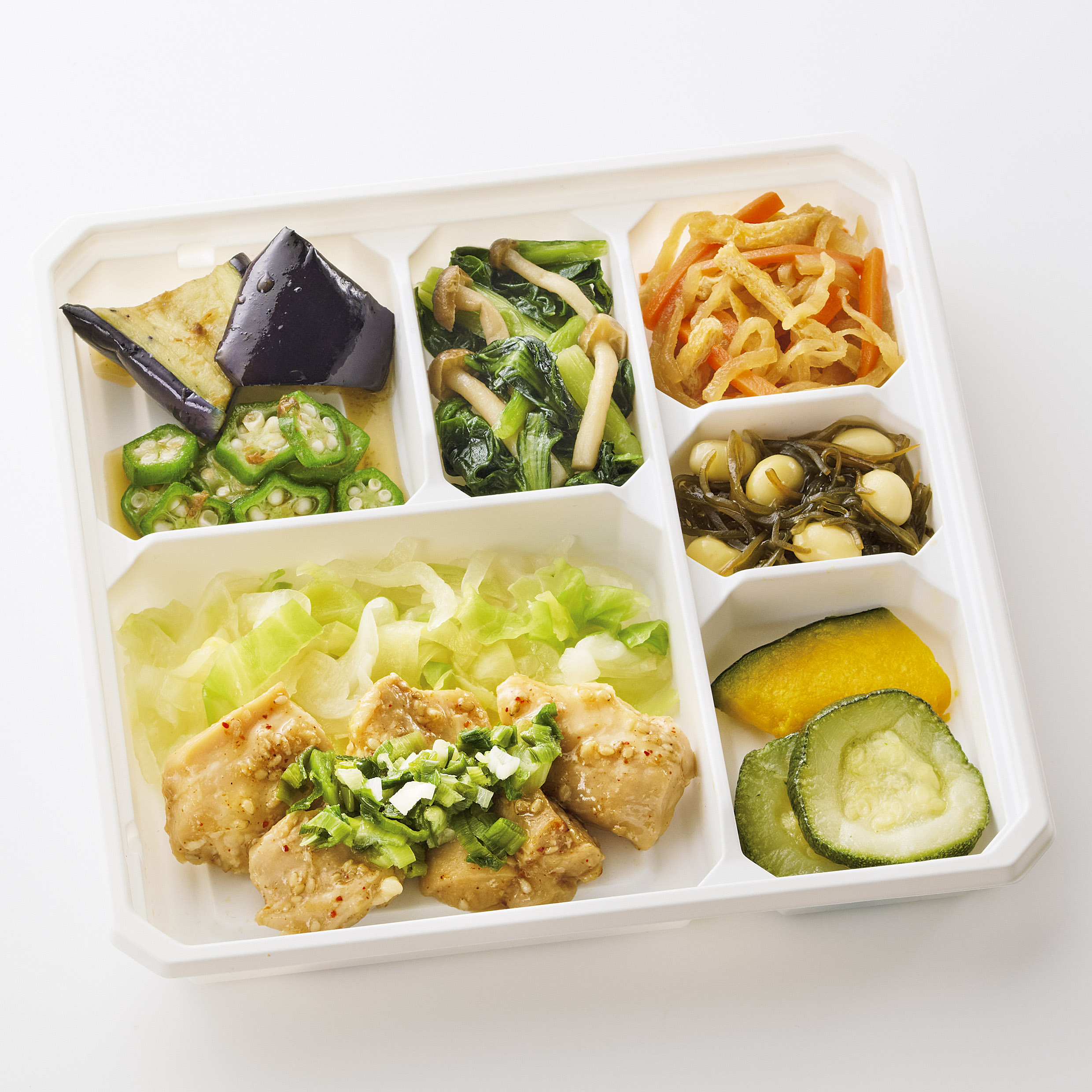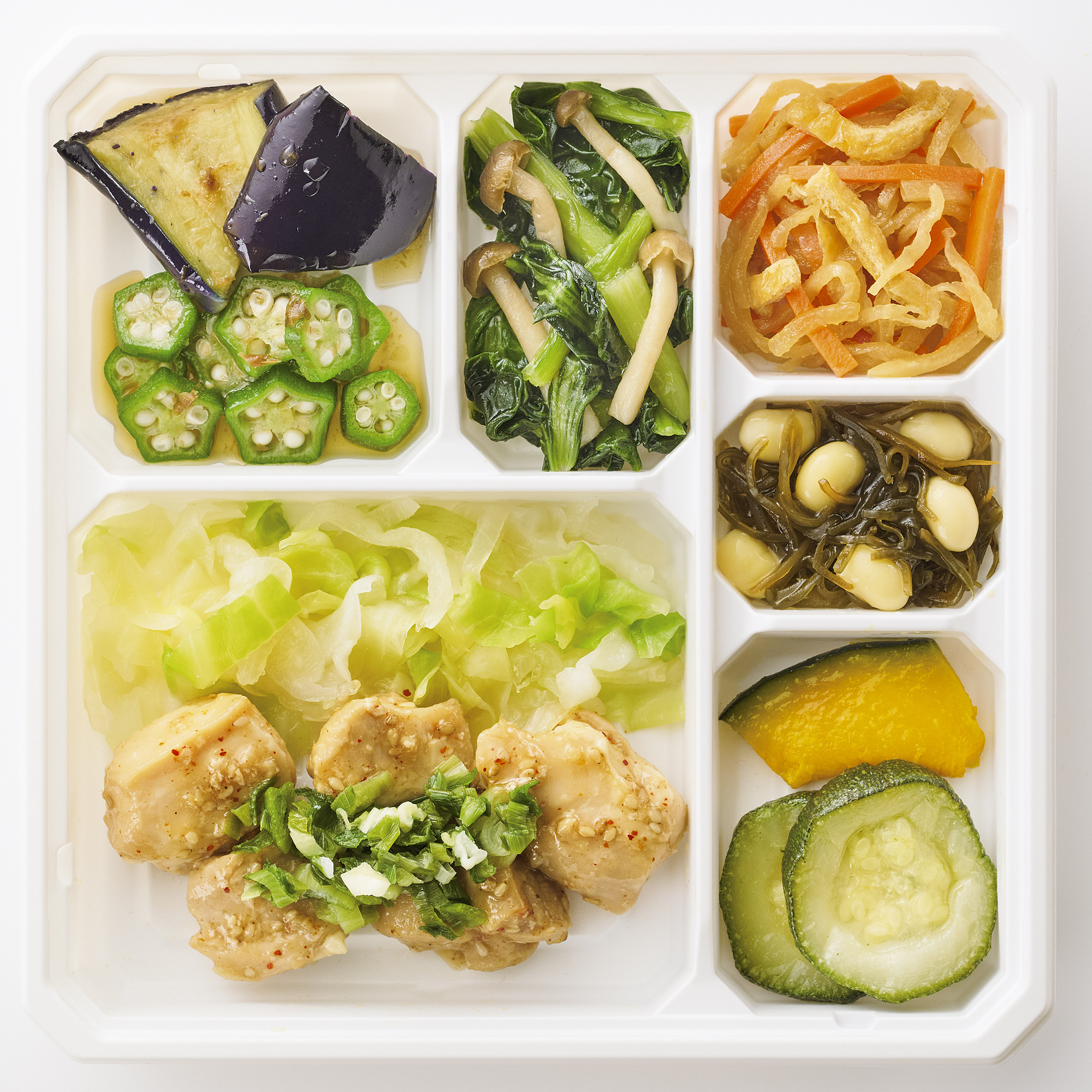 | 原材料名 | 鶏肉(ブラジル)、 焼ズッキーニ、 揚げなす、 キャベッ、 小松菜、 玉ねぎ、 かぼちゃ、 オクラ、ねぎ、 人参、 蒸し大豆、 ぶなしめじ、 濃口醤油、大豆油、 油揚げ、 発酵調味料、 なたね 油、 塩こうじ、 清酒、 本みりん、 切干大根、 砂糖、 オリーブ油、 ごま、 おろしにんにく、 乾燥昆布、 食塩、 おろし生姜、 顆粒中華風だし、 顆粒和風だし、 かつぉ節、 和風調味液、 ごま油、中華スープの素、 七味唐辛子/増粘剤(加工でん粉)、 調味料(アミノ酸等)、 酢酸Na、 酸化防止剤(V.C)、 貝Ca、 酸味料、pH調整剤、(原料の一部に小麦乳成分・牛肉・ごま・さば・大豆 ・ 鶏肉・豚肉・ゼラチン ・ 魚醤(魚介類)を含む) | ||