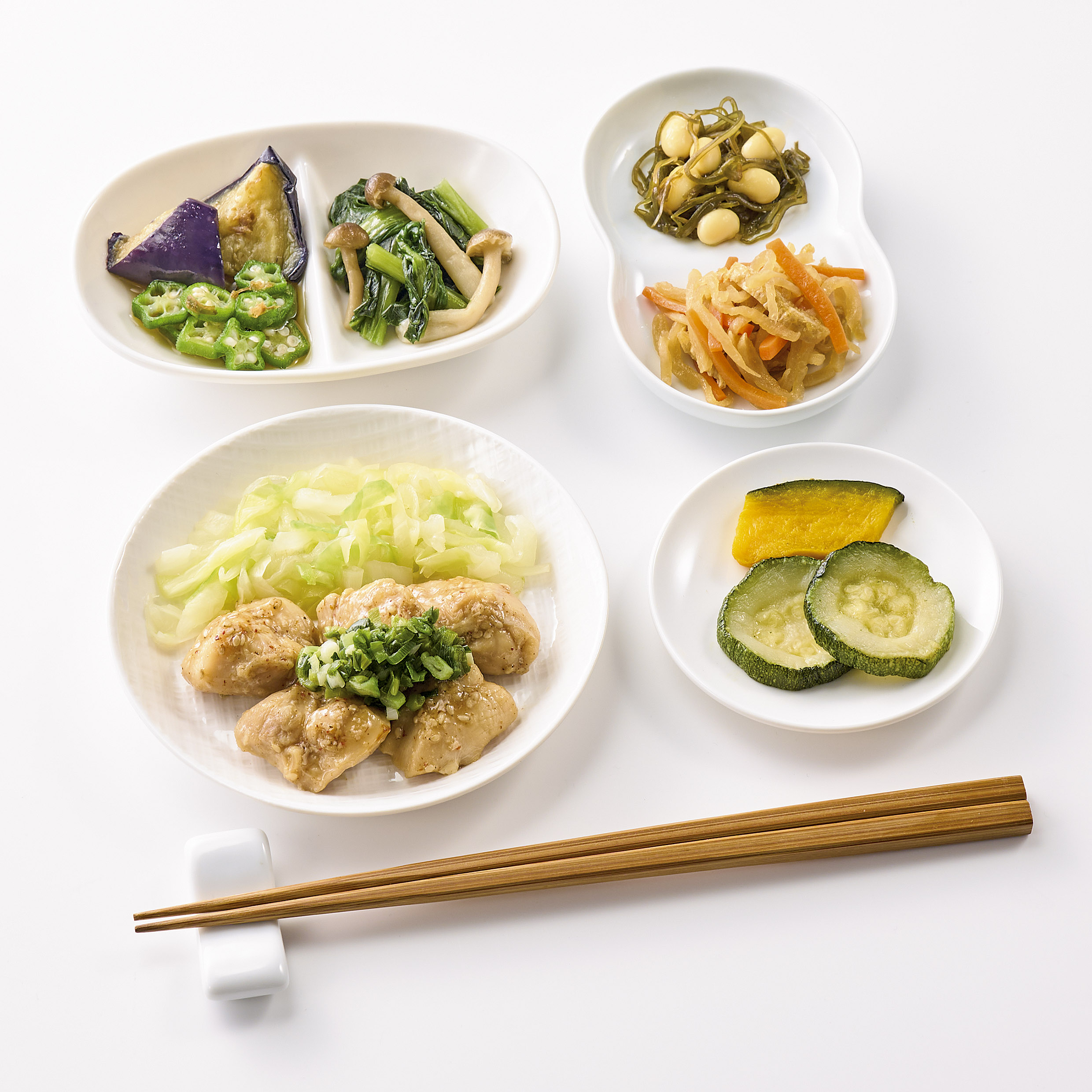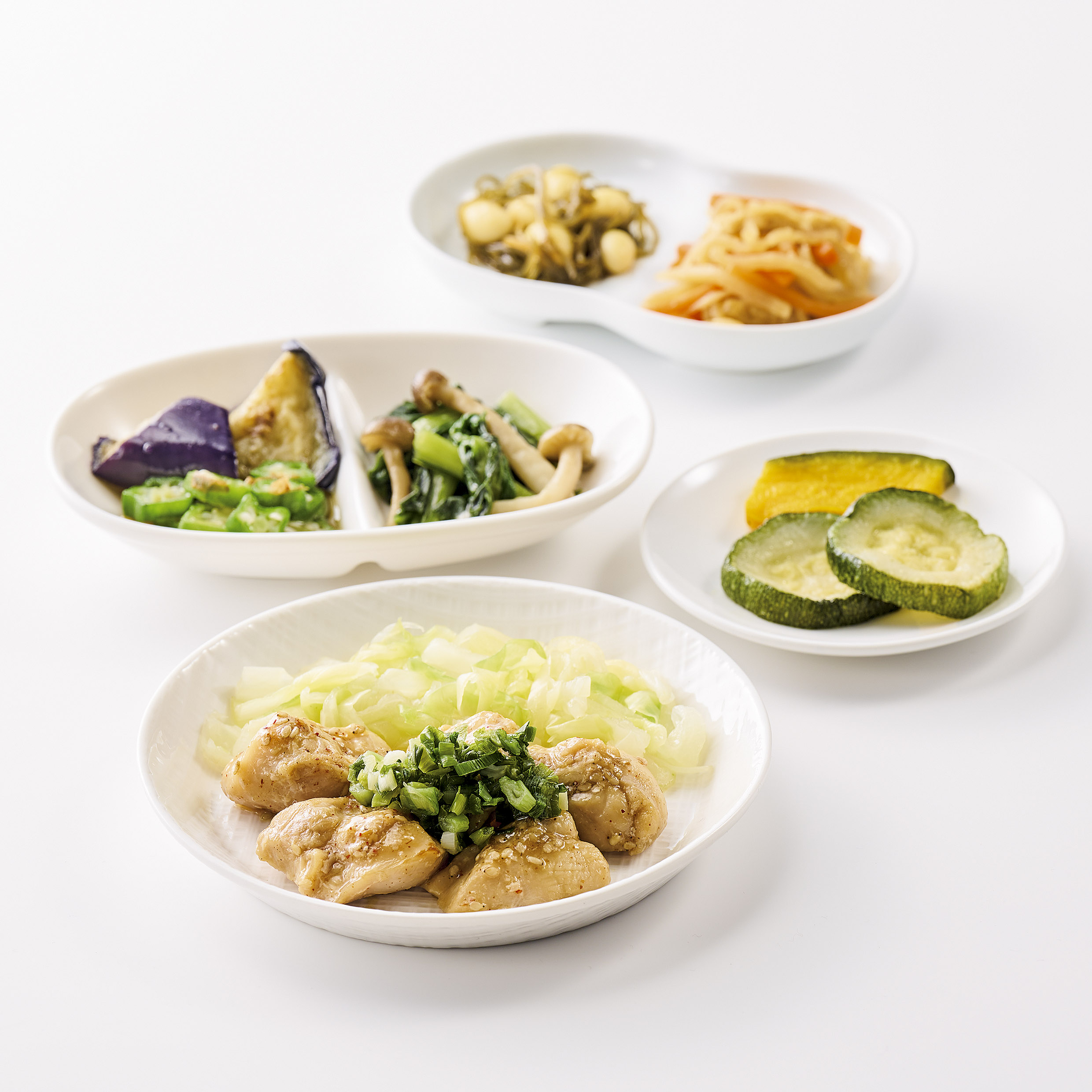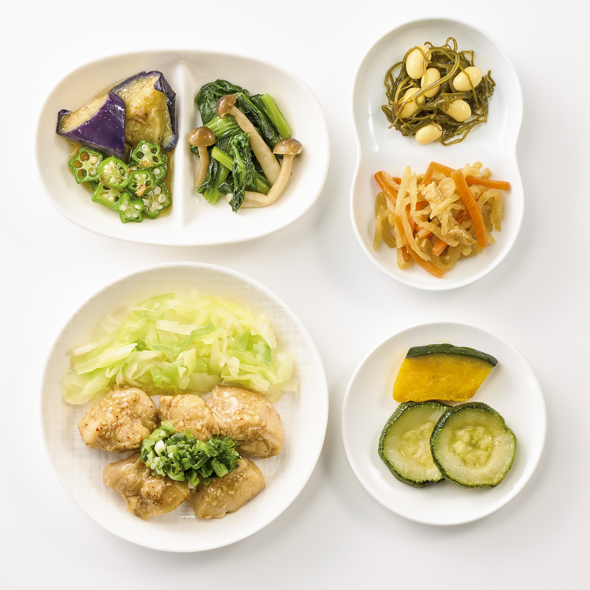 | 原材料名 | 鶏肉(ブラジル)、 焼ズッキーニ、 揚げなす、 キャベッ、 小松菜、 玉ねぎ、 かぼちゃ、 オクラ、ねぎ、 人参、 蒸し大豆、 ぶなしめじ、 濃口醤油、大豆油、 油揚げ、 発酵調味料、 なたね 油、 塩こうじ、 清酒、 本みりん、 切干大根、 砂糖、 オリーブ油、 ごま、 おろしにんにく、 乾燥昆布、 食塩、 おろし生姜、 顆粒中華風だし、 顆粒和風だし、 かつぉ節、 和風調味液、 ごま油、中華スープの素、 七味唐辛子/増粘剤(加工でん粉)、 調味料(アミノ酸等)、 酢酸Na、 酸化防止剤(V.C)、 貝Ca、 酸味料、pH調整剤、(原料の一部に小麦乳成分・牛肉・ごま・さば・大豆 ・ 鶏肉・豚肉・ゼラチン ・ 魚醤(魚介類)を含む) | ||