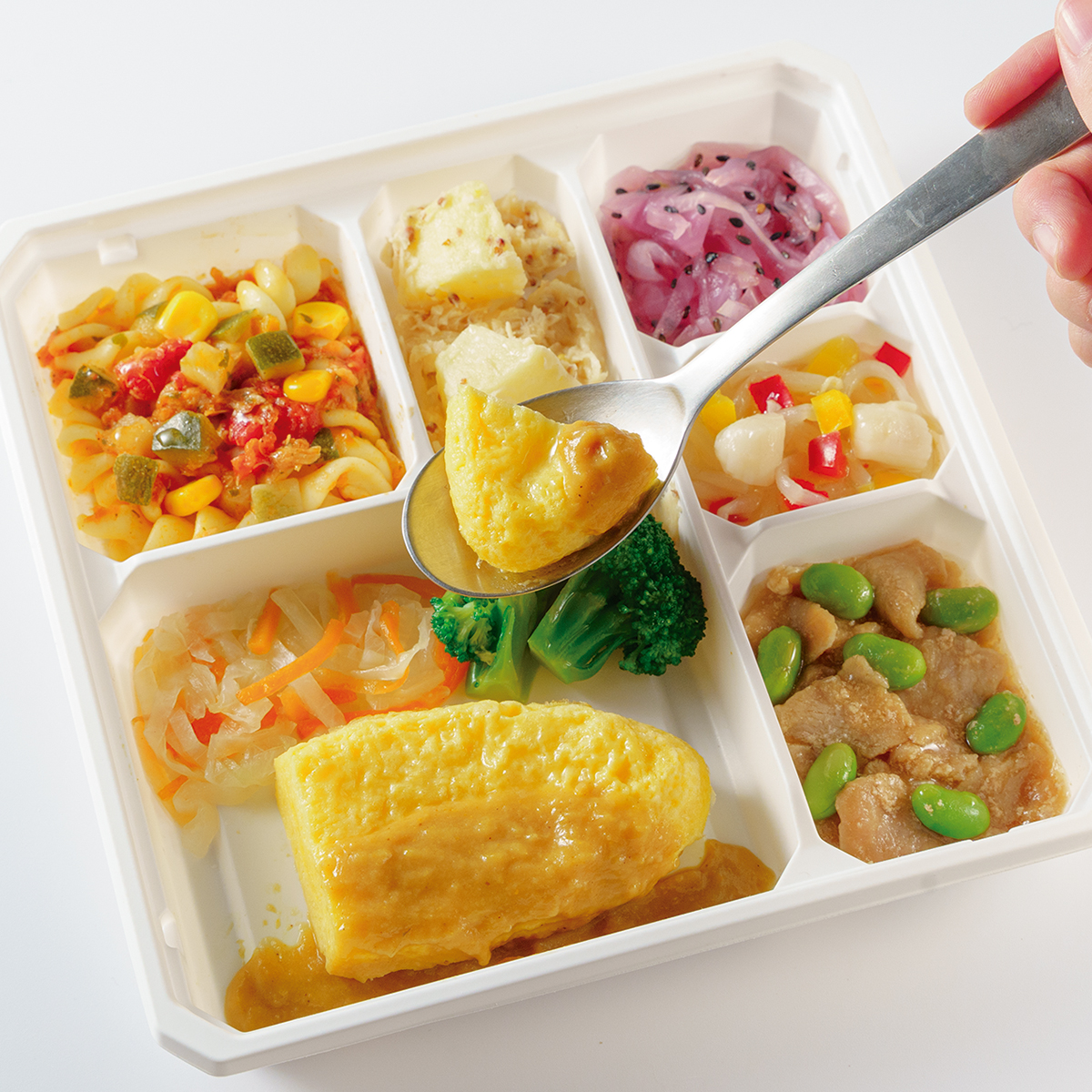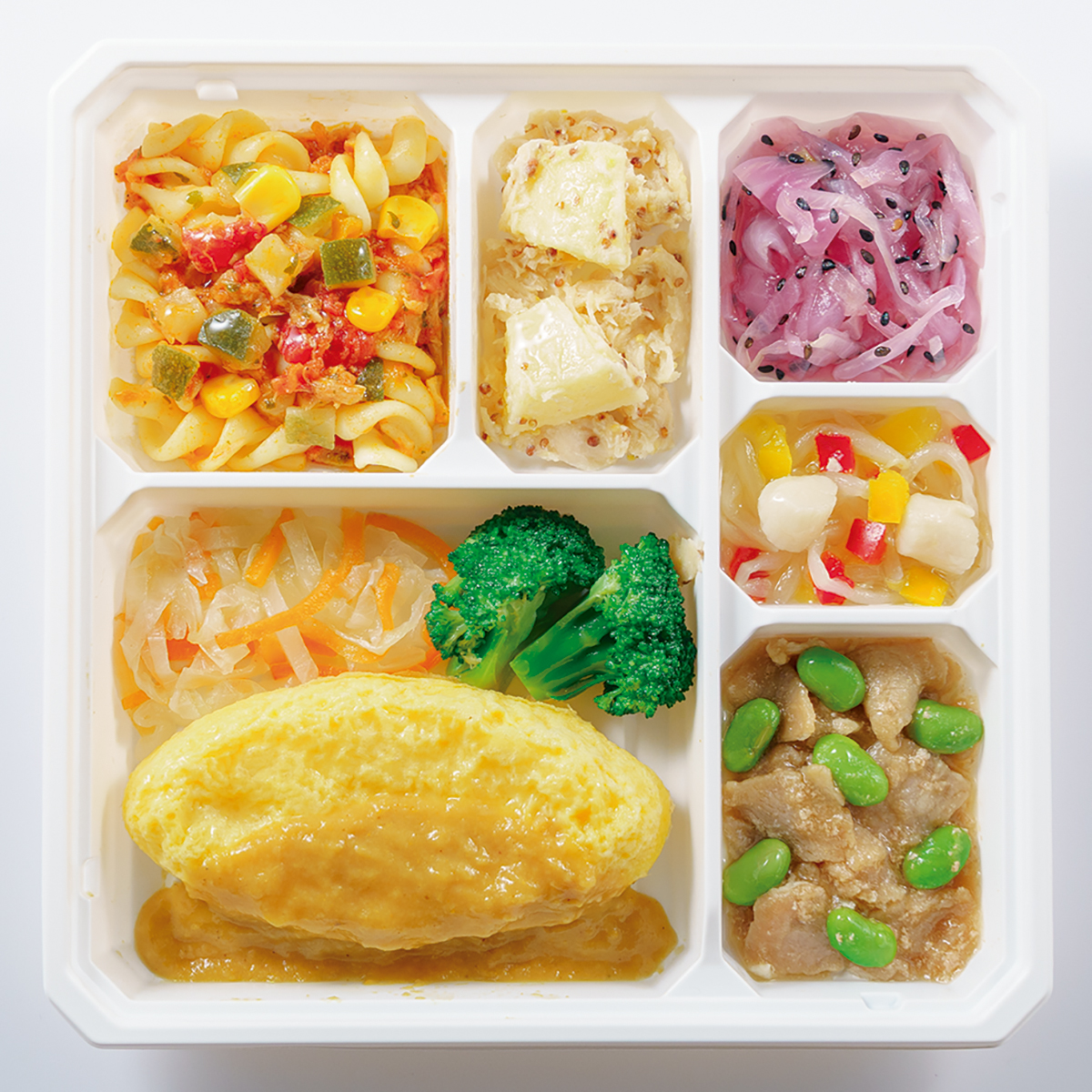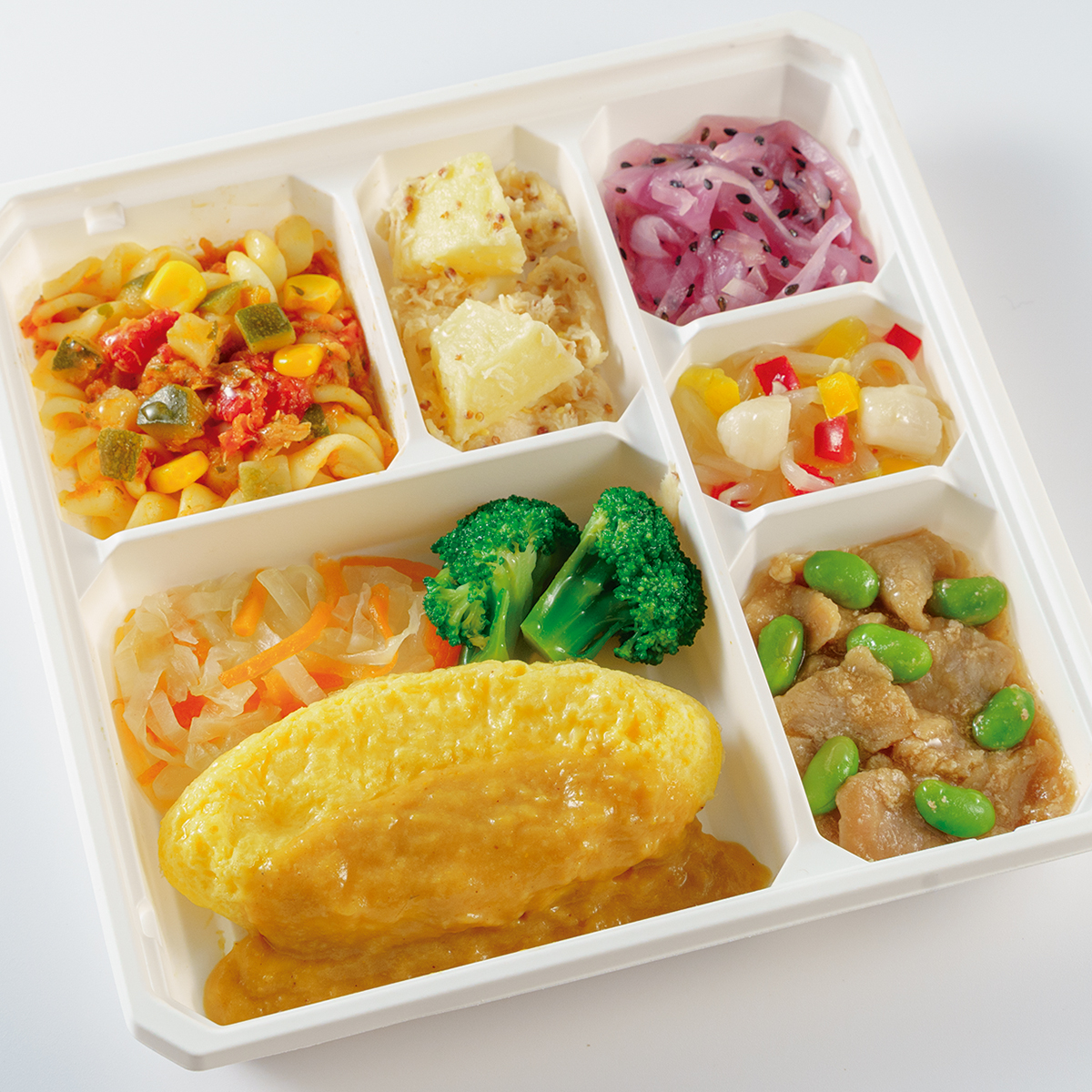 | 原材料名 | オムレツ(国内製造)、ブロッコリー、じゃがいも、玉ねぎ、豚肉、もやし、ゆでイタヤ貝柱、マカロニ、キャベツ、紫キャベツ、トマト・ピューレー漬、枝豆、蒸し鶏、人参、ツナフレーク、なたね油、ズッキーニ、コーン、濃口醤油、黄ピーマン、赤ピーマン、はちみつ入り粒マスタードソース、砂糖、醸造酢、カレールウ、ケチャップ、チーズソース、食塩、バター風味油、顆粒洋風だし、ごま、大豆油、本みりん、果実調味料、ゼラチン、にんにく、こしょう、パセリ、唐辛子/増粘剤(加工でん粉、増粘多糖類)、調味料(アミノ酸等)、乳化剤、カゼインNa、ポリリン酸Na、酸化防止剤(V.C)、pH調整剤、香料、酢酸(Na)、酸味料、安定剤(キサンタン)、香辛料、着色料(カラメル、カロチン)、(一部に小麦・卵・乳成分・牛肉・ごま・大豆・鶏肉・豚肉・りんご・ゼラチンを含む) | ||