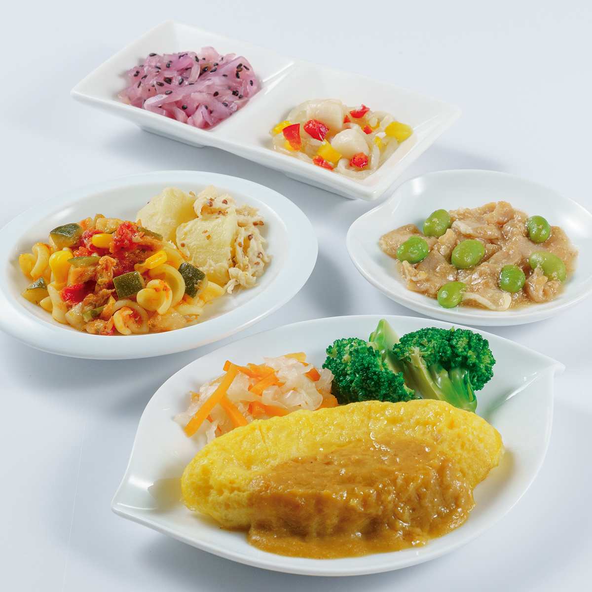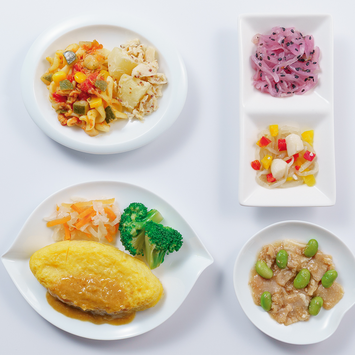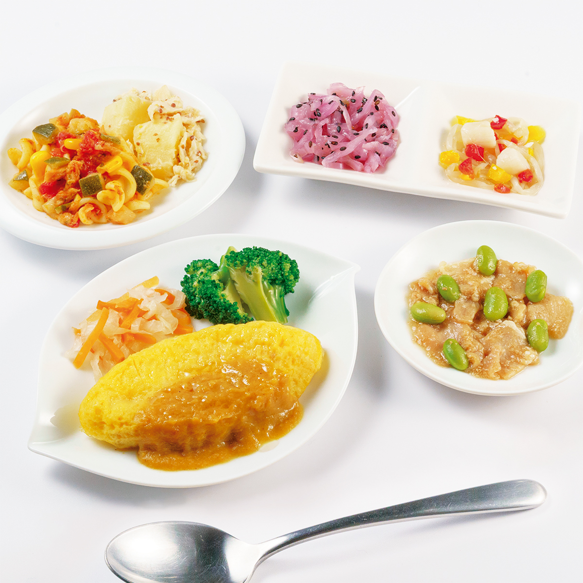 | 原材料名 | オムレツ(国内製造)、ブロッコリー、じゃがいも、玉ねぎ、豚肉、もやし、ゆでイタヤ貝柱、マカロニ、キャベツ、紫キャベツ、トマト・ピューレー漬、枝豆、蒸し鶏、人参、ツナフレーク、なたね油、ズッキーニ、コーン、濃口醤油、黄ピーマン、赤ピーマン、はちみつ入り粒マスタードソース、砂糖、醸造酢、カレールウ、ケチャップ、チーズソース、食塩、バター風味油、顆粒洋風だし、ごま、大豆油、本みりん、果実調味料、ゼラチン、にんにく、こしょう、パセリ、唐辛子/増粘剤(加工でん粉、増粘多糖類)、調味料(アミノ酸等)、乳化剤、カゼインNa、ポリリン酸Na、酸化防止剤(V.C)、pH調整剤、香料、酢酸(Na)、酸味料、安定剤(キサンタン)、香辛料、着色料(カラメル、カロチン)、(一部に小麦・卵・乳成分・牛肉・ごま・大豆・鶏肉・豚肉・りんご・ゼラチンを含む) | ||