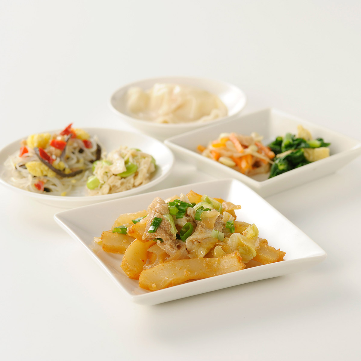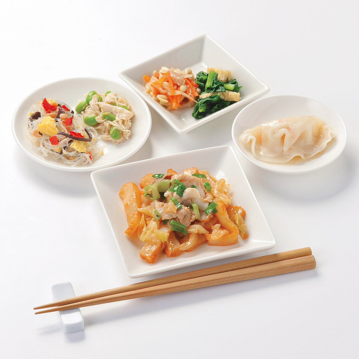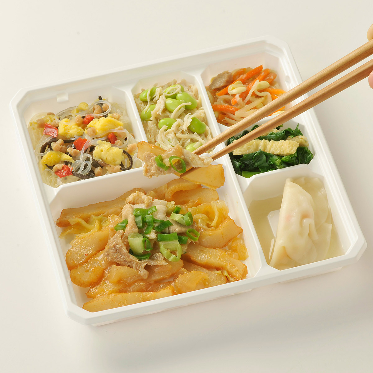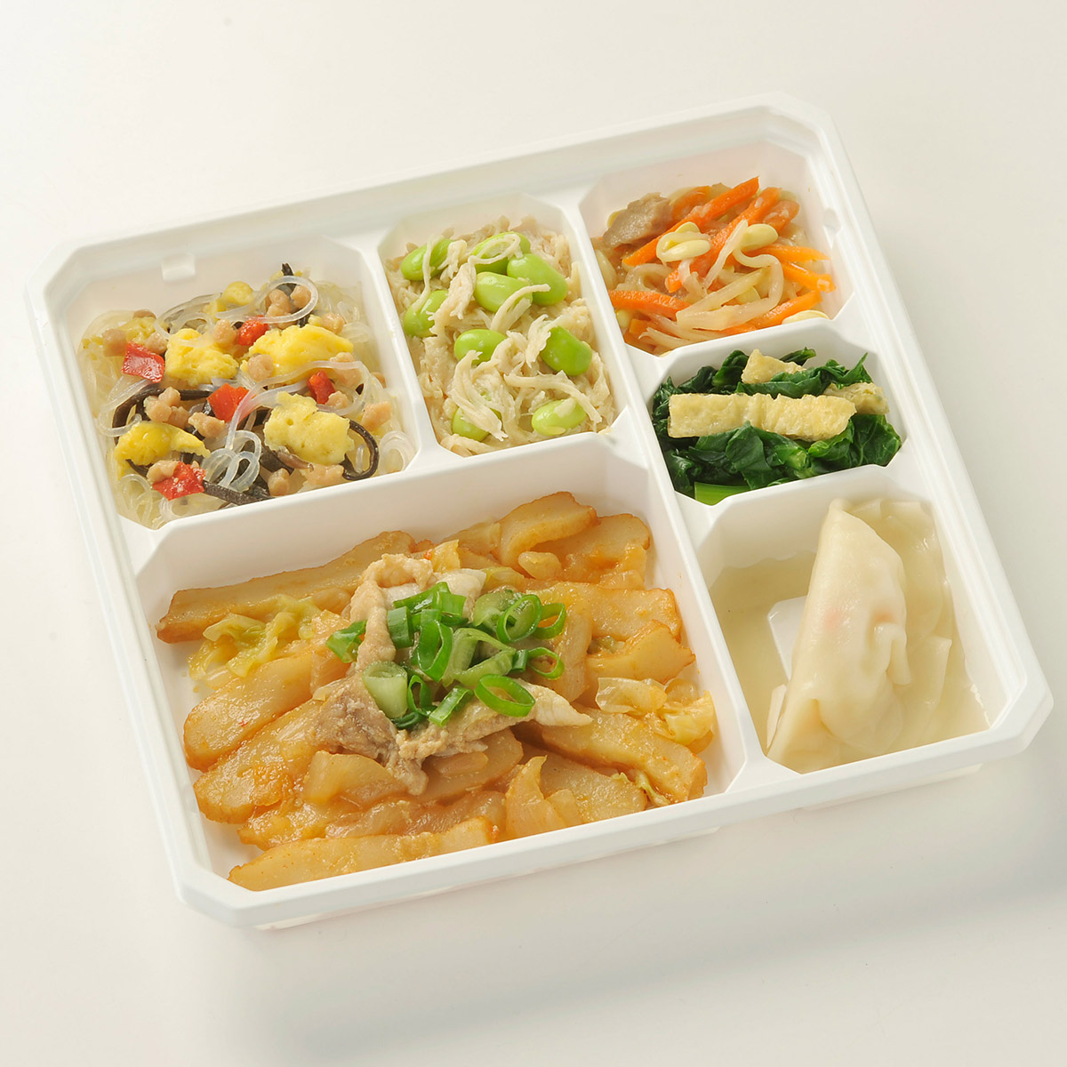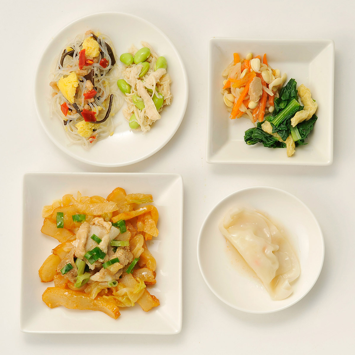 | 原材料名 | さつま揚げ、キャベツ、餃子(小麦粉、キャベツ、魚肉すり身、玉ねぎ、豚脂、豆腐、卵白、その他)、玉ねぎ、豚肉、大豆もやし、ほうれん草、枝豆、蒸し鶏ほぐし身、人参、ねぎ、炒り卵、春雨、減塩醤油、ツナフレーク、なたね油、油揚げ、赤ピーマン、コチジャン、粒状大豆たん白、砂糖、ごま油、りんごソース、乾燥きくらげ、顆粒中華風だし、淡口醤油、食塩、おろしにんにく、発酵調味料、清酒、濃口醤油、本みりん、豆板醤、おろししょうが、中華スープの素、顆粒和風だし、白こしょう/増粘剤(加工デンプン、増粘多糖類)、加工デンプン、調味料(アミノ酸等)、酸化防止剤(V.C)、ポリリン酸Na、着色料(カラメル、紅麹)、マンニット、pH調整剤、酸味料、凝固剤、(一部に小麦・卵・乳成分・牛肉・ごま・大豆・鶏肉・豚肉・りんご・ゼラチンを含む) | ||