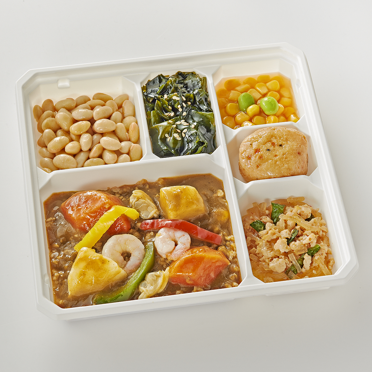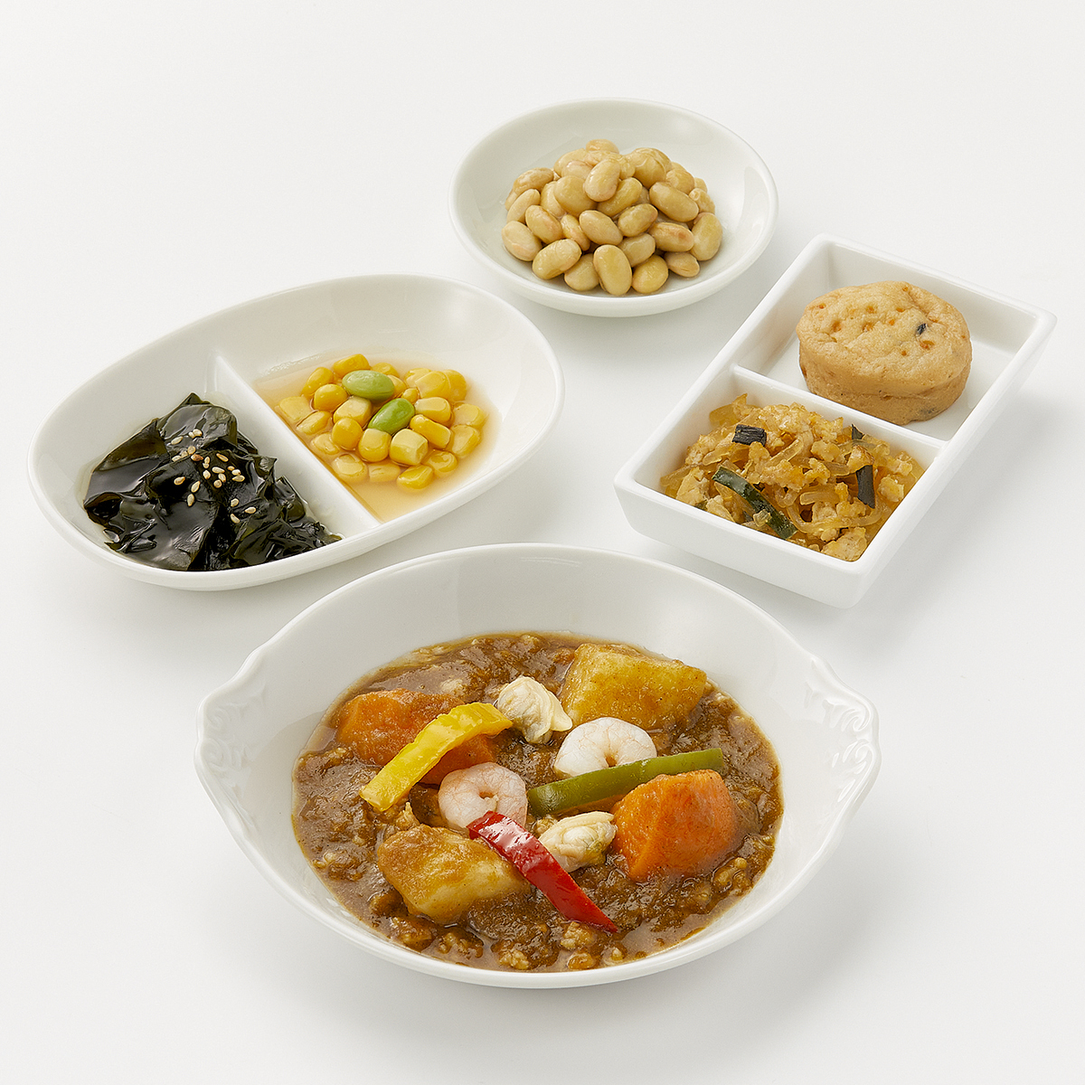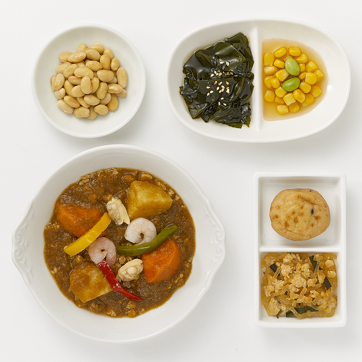 | 原材料名 | 水煮大豆(カナダ産)、大豆加工品、がんも、人参、じゃがいも、ピーマン、とうもろこし、わかめ、はるさめ、鶏ひき肉、えび、カレーフレーク、バターソース、砂糖、醤油だし、醤油、ボイルアサリ、発酵調味料、枝豆、みりん風調味料、ニラ、植物油、調合ごま油、ケチャップ、粉末調味料、ごま、にんにく、しょうが、テンメンジャン、トウバンジャン、還元澱粉加水分解物/糊料(加工でん粉、CMC、増粘多糖類)、調味料(アミノ酸等)、着色料(カラメル、クチナシ)、pH調整剤、ミョウバン、酸味料、乳化剤、乳酸Ca、香料、酸化防止剤(V.E、V.C、チャ抽出物)、(一部に小麦・乳成分・えび・オレンジ・牛肉・ごま・さば・ゼラチン・大豆・鶏肉・豚肉・やまいもを含む) 原材料配合割合(仕込み時):わかめ4%えび2%アサリ0.9% | ||