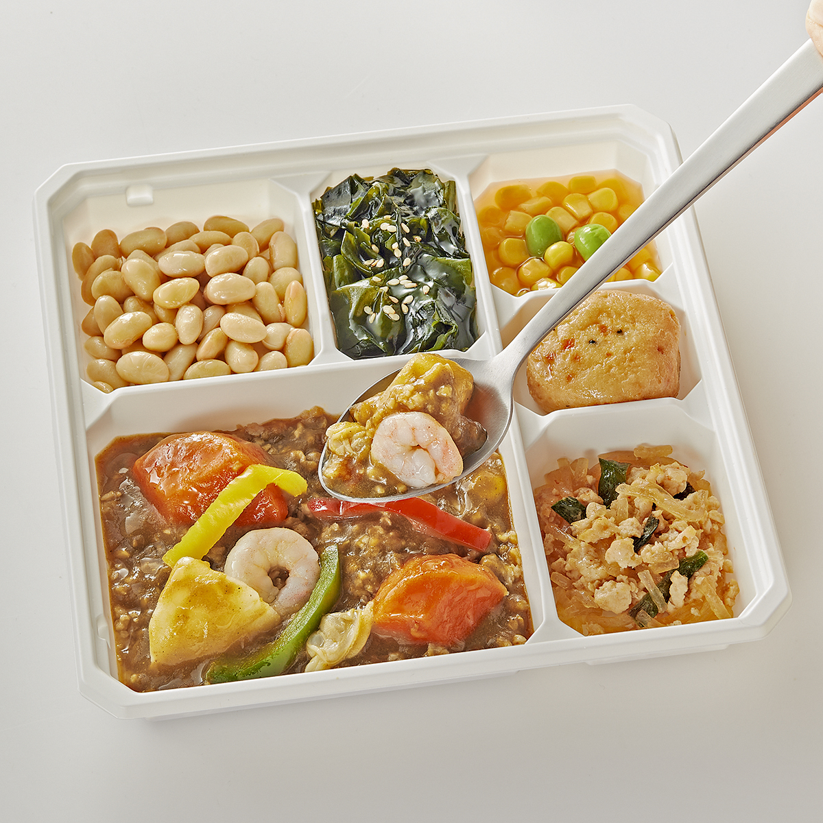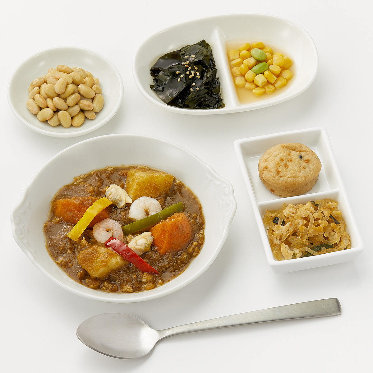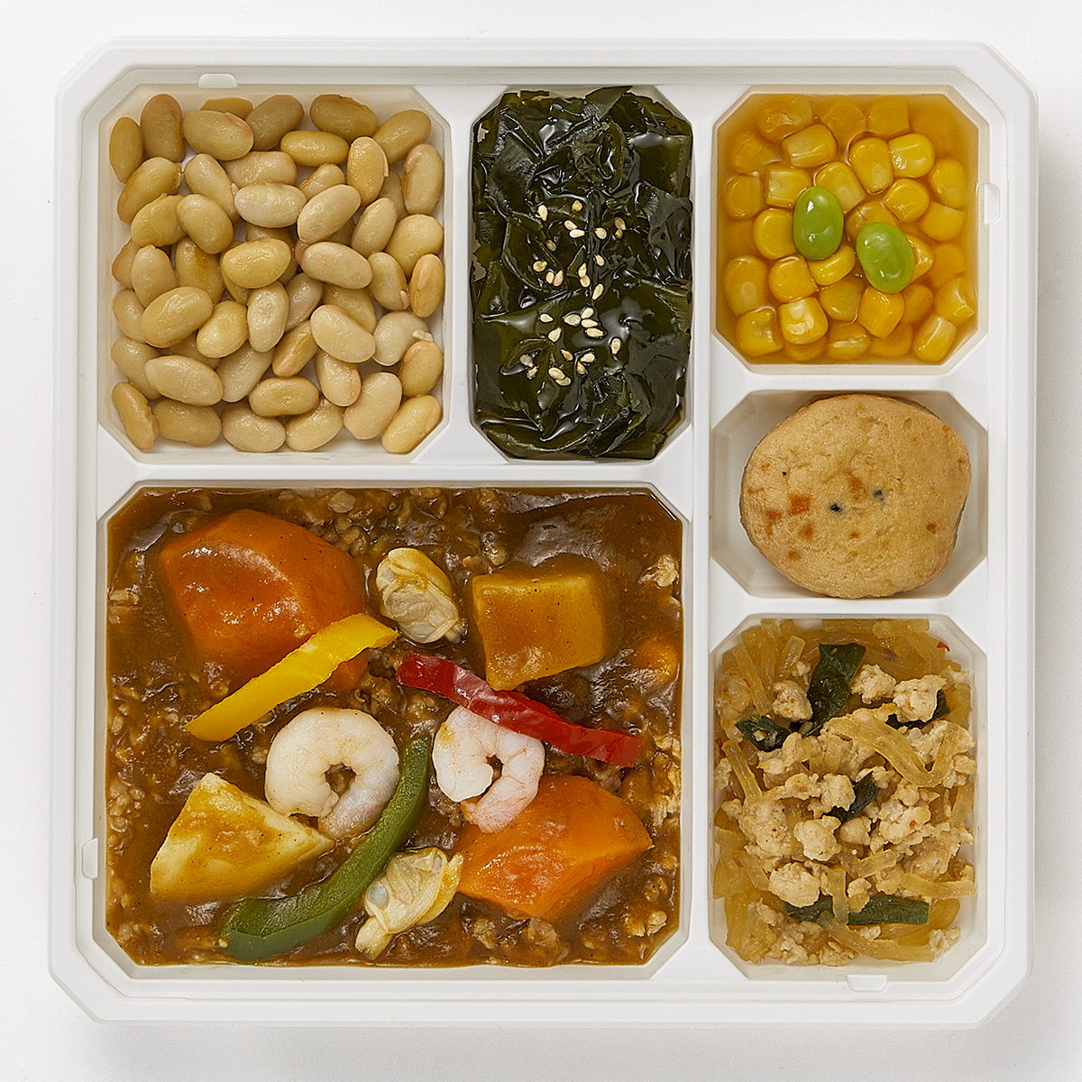 | 原材料名 | 水煮大豆(カナダ産)、大豆加工品、がんも、人参、じゃがいも、ピーマン、とうもろこし、わかめ、はるさめ、鶏ひき肉、えび、カレーフレーク、バターソース、砂糖、醤油だし、醤油、ボイルアサリ、発酵調味料、枝豆、みりん風調味料、ニラ、植物油、調合ごま油、ケチャップ、粉末調味料、ごま、にんにく、しょうが、テンメンジャン、トウバンジャン、還元澱粉加水分解物/糊料(加工でん粉、CMC、増粘多糖類)、調味料(アミノ酸等)、着色料(カラメル、クチナシ)、pH調整剤、ミョウバン、酸味料、乳化剤、乳酸Ca、香料、酸化防止剤(V.E、V.C、チャ抽出物)、(一部に小麦・乳成分・えび・オレンジ・牛肉・ごま・さば・ゼラチン・大豆・鶏肉・豚肉・やまいもを含む) 原材料配合割合(仕込み時):わかめ4%えび2%アサリ0.9% | ||