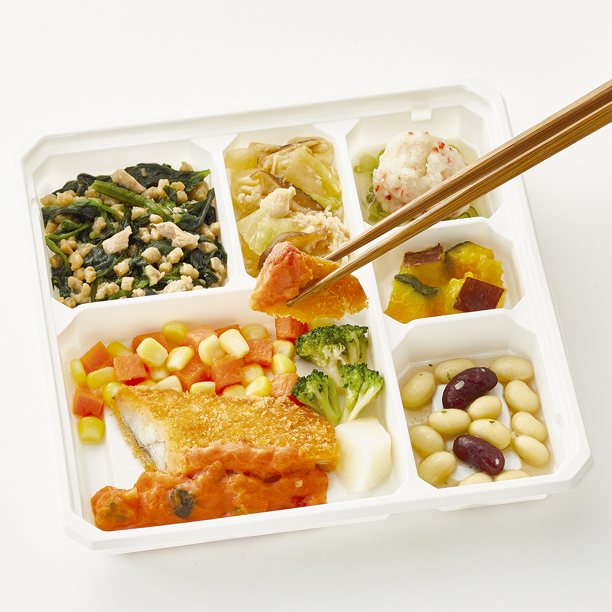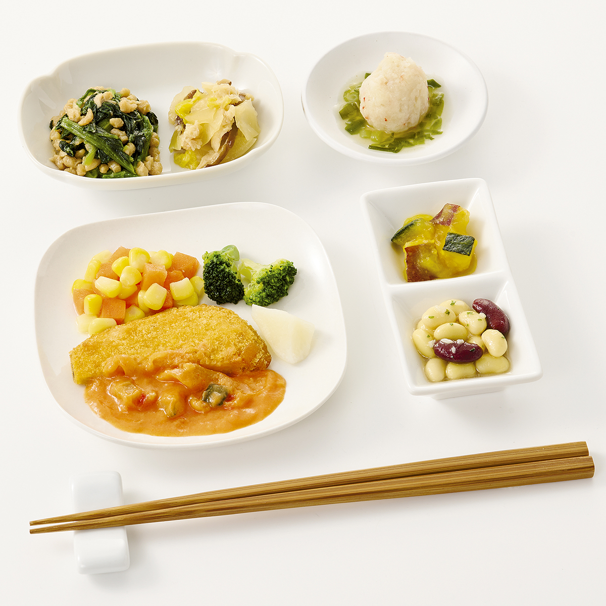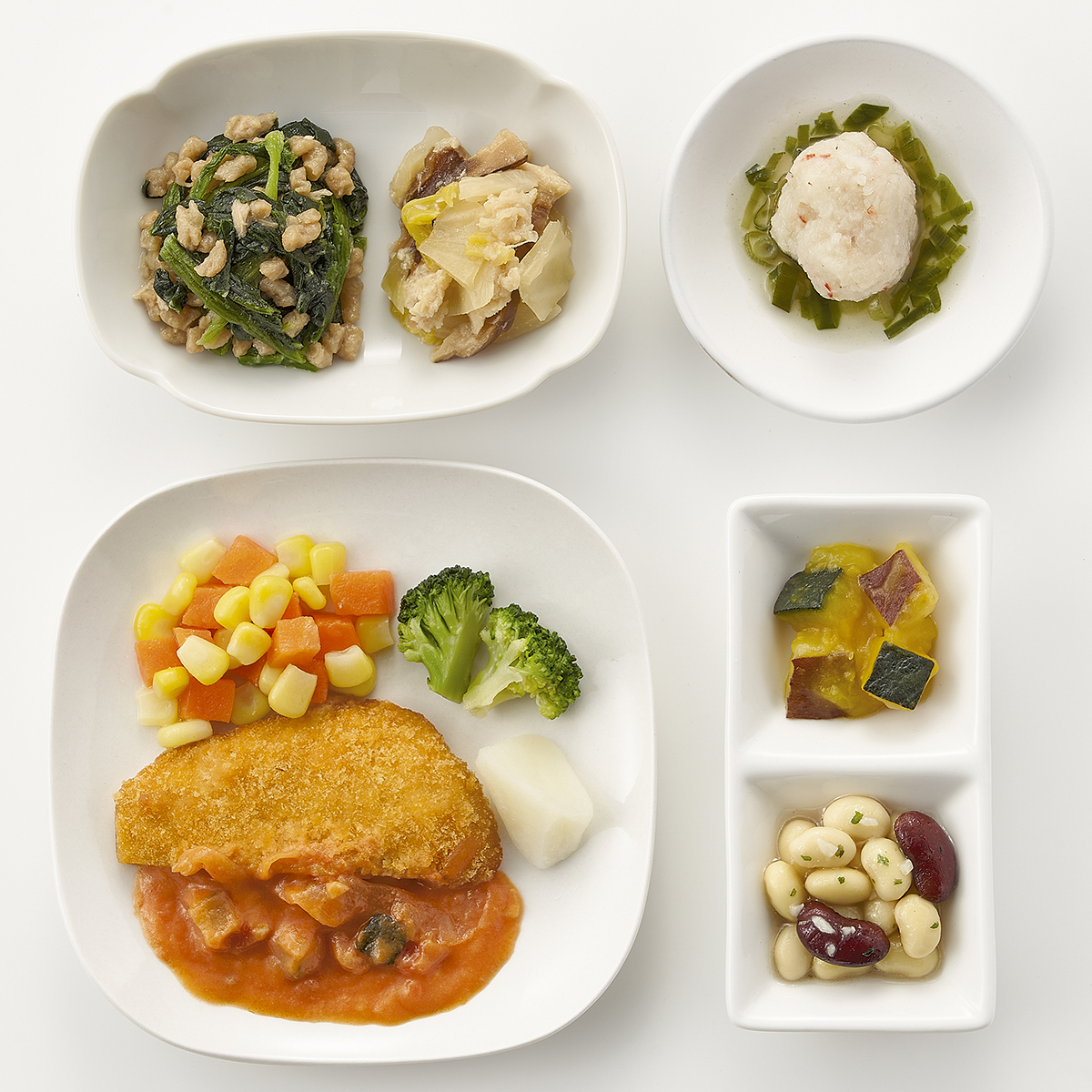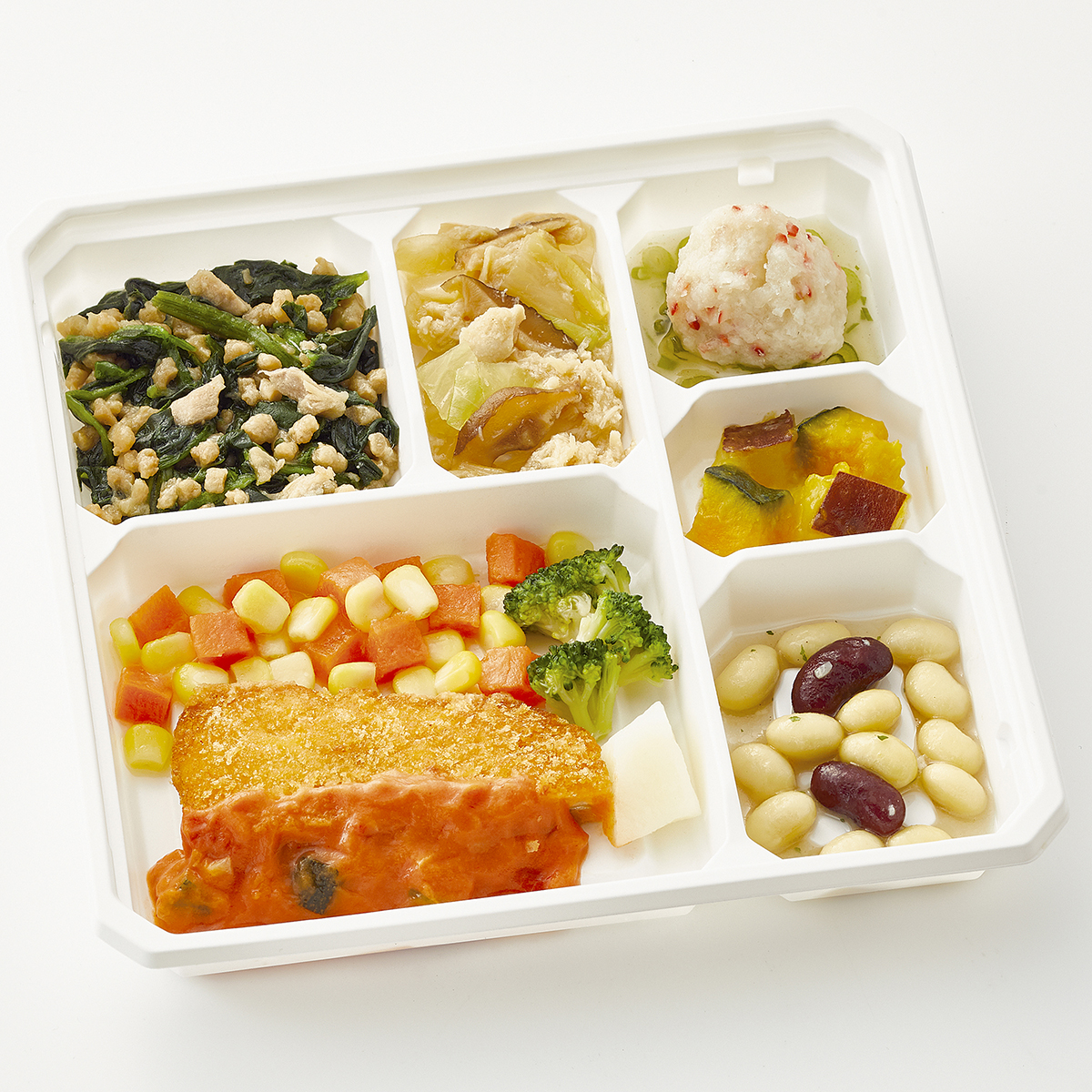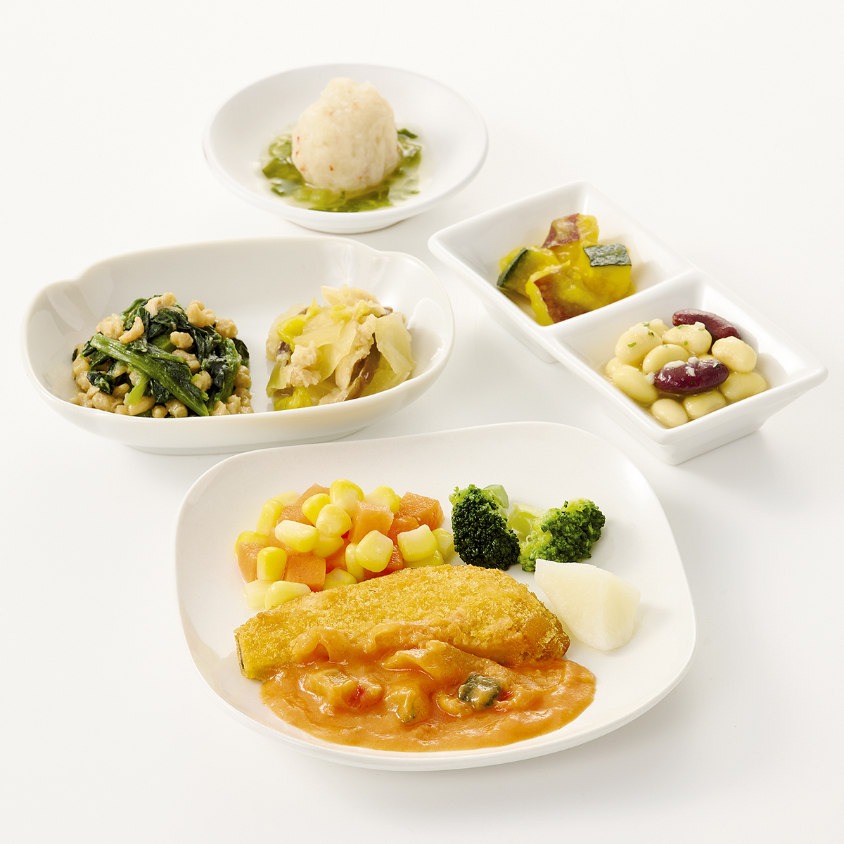 | 原材料名 | アジフライ、ほうれん草、かに風味つみれ、蒸し大豆、ブロッコリー、コーン、人参、白菜、なたね油、キャベツ、さつまいも、じゃがいも、かぼちゃ、牛乳、りんごジュース、ゆで赤インゲン豆、蒸し鶏ほぐし身、玉ねぎ、トマト・ピューレー漬、ホワイトソース、ズッキーニ、ツナフレーク、トマトペースト、ねぎ、粒状大豆たん白、砂糖、バターフレーバーオイル、濃口醤油、顆粒洋風だし、乾燥しいたけ、食塩、にんにく、クリーム、淡口醤油、発酵調味料、顆粒和風だし、白こしょう、パセリ粉/増粘剤(加工デンプン、増粘多糖類)、調味料(アミノ酸等)、pH調整剤、着色料(カラメル、カロチノイド、紅麹)、乳化剤、香料、酸化防止剤(V.C)、ポリリン酸Na、酸味料、香辛料、(一部に小麦・卵・乳成分・かに・大豆・鶏肉・豚肉・りんごを含む) | ||