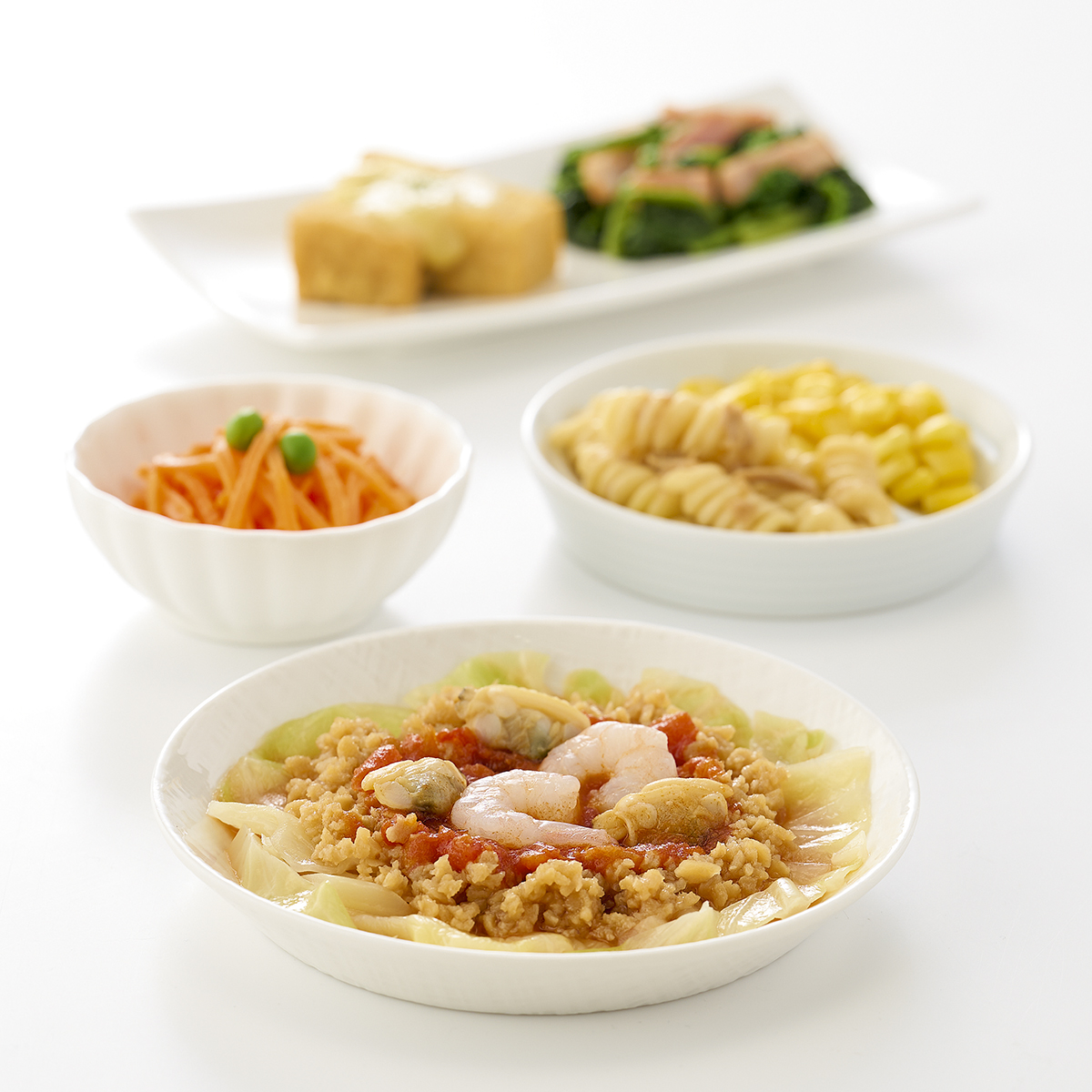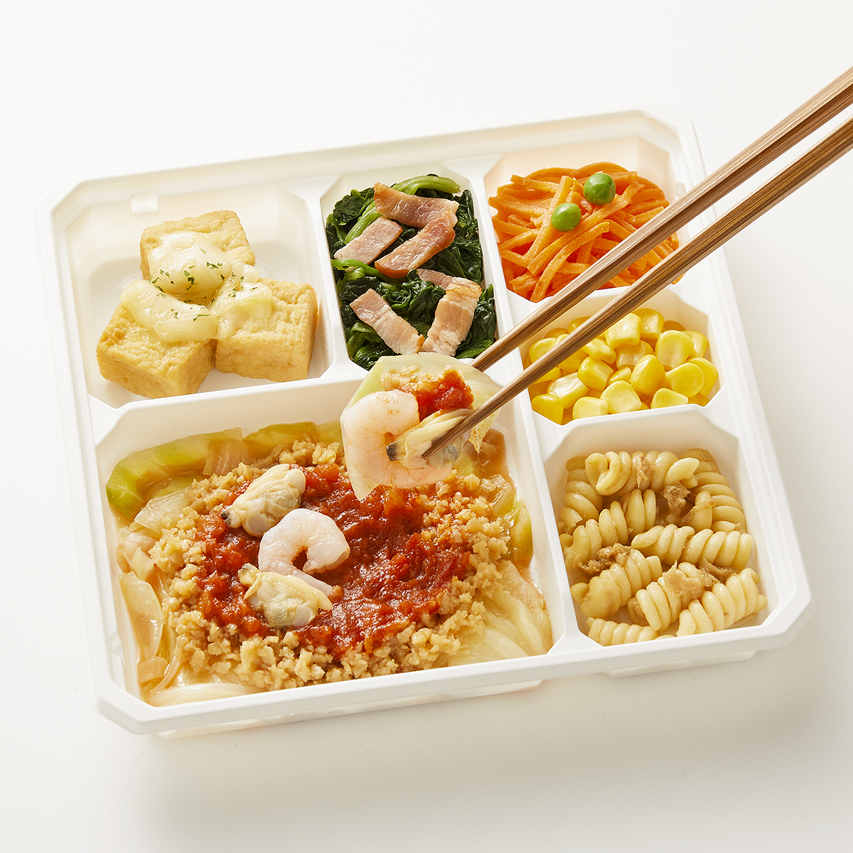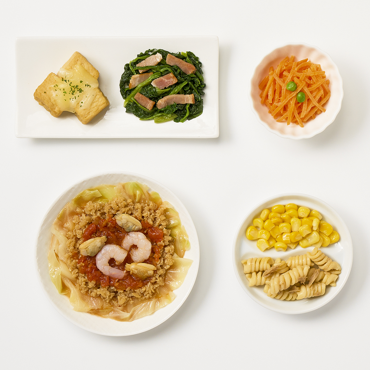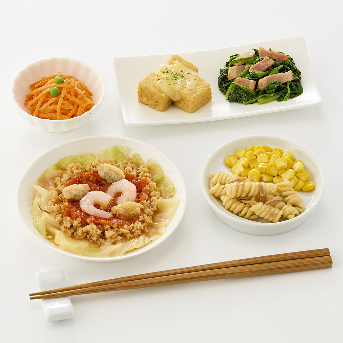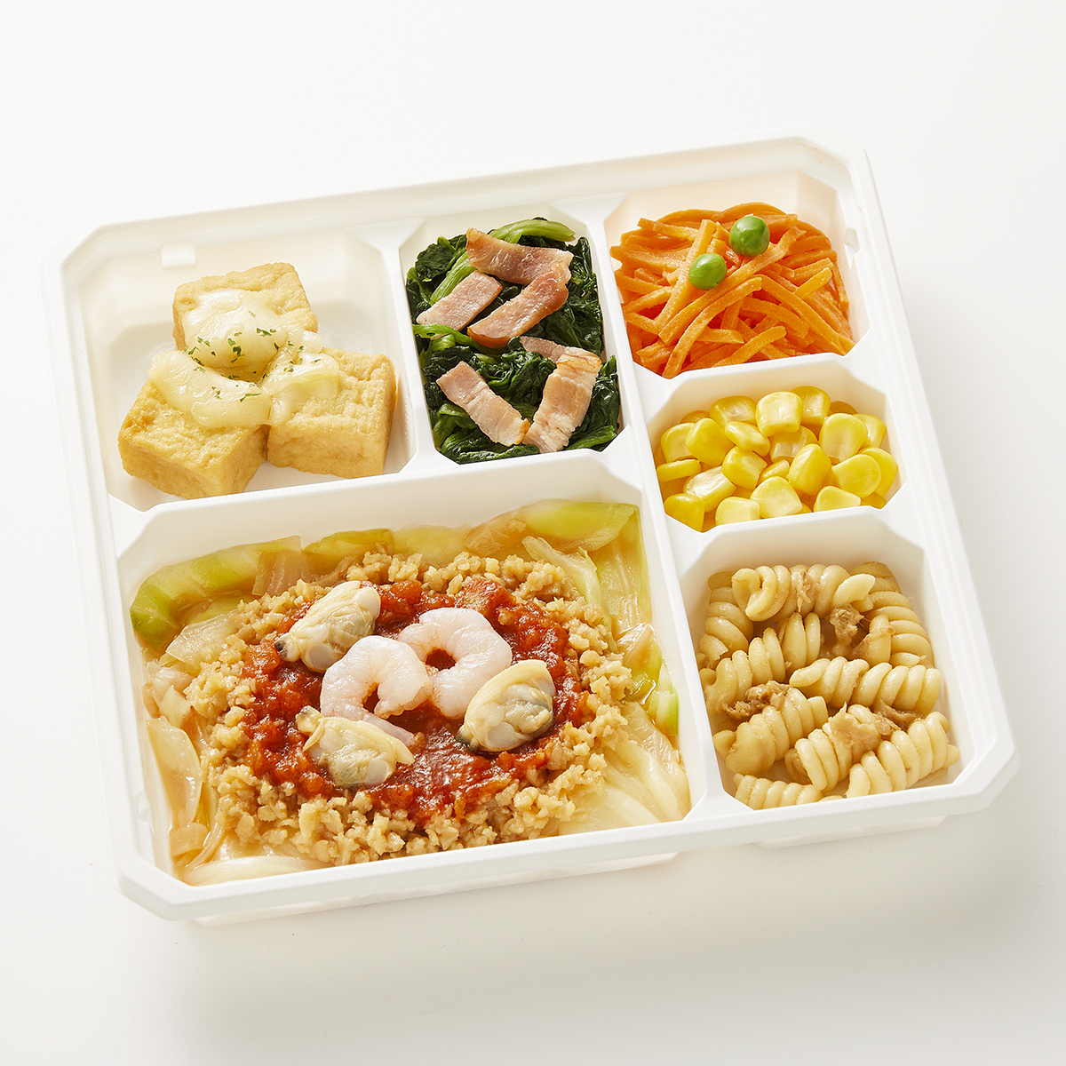 | 原材料名 | 厚揚げ(国内製造)、大豆加工品、人参(日本産)、ほうれん草、マカロニ、キャベツ、とうもろこし、トマトソース、ケチャップ、えび(タイ産)、チーズ、ベーコン、玉葱、あさり(中国産)、砂糖、植物油、ツナ、醤油、みりん風調味料、バターソース、半固体状ドレッシング、加工酢、発酵調味料、グリーンピース、粉末調味料、調合ごま油、パセリ、食塩、還元澱粉加水分解物/糊料(加工澱粉、増粘多糖類)、加工澱粉、トレハロース、凝固剤、調味料(アミノ酸等)、セルロース、pH調整剤、カゼインNa、リン酸塩(Na)、酸化防止剤(V.C、V.E、チャ抽出物)、くん液、塩化Ca、酒精、香料、酸味料、クチナシ色素、乳化剤、発色剤(亜硝酸Na)、香辛料、(一部に小麦・卵・乳成分・えび・牛肉・ごま・ゼラチン・大豆・鶏肉・豚肉・りんごを含む) | ||