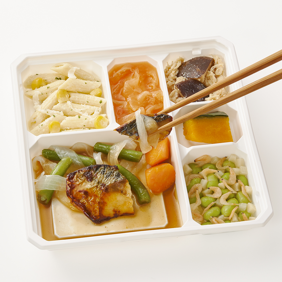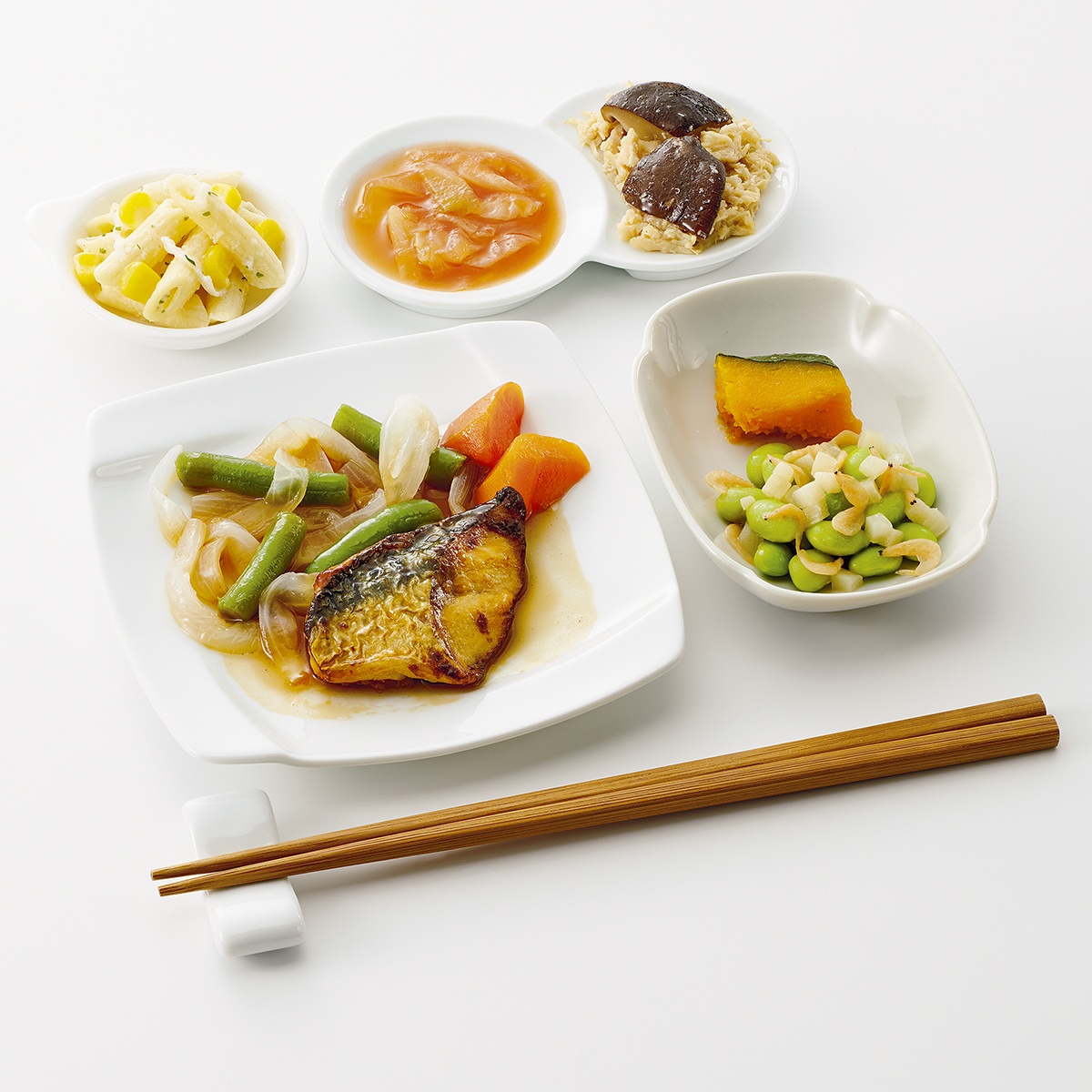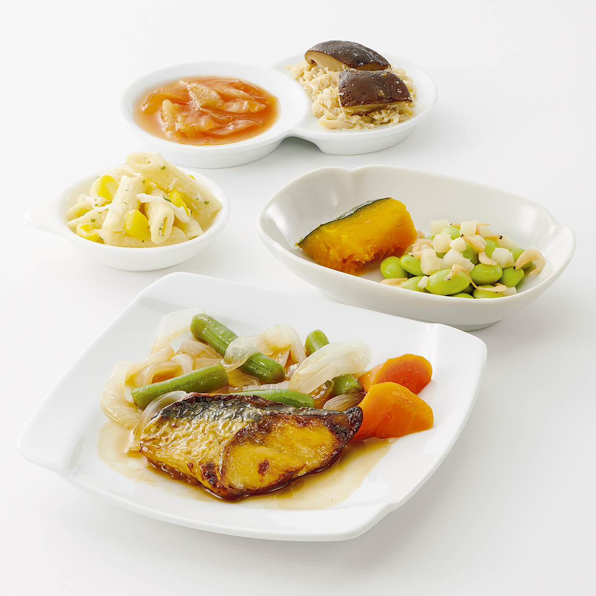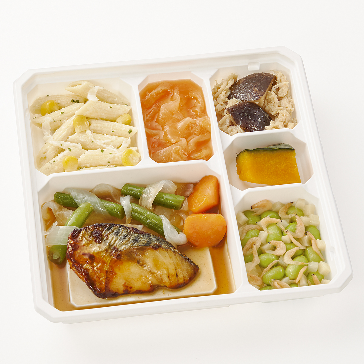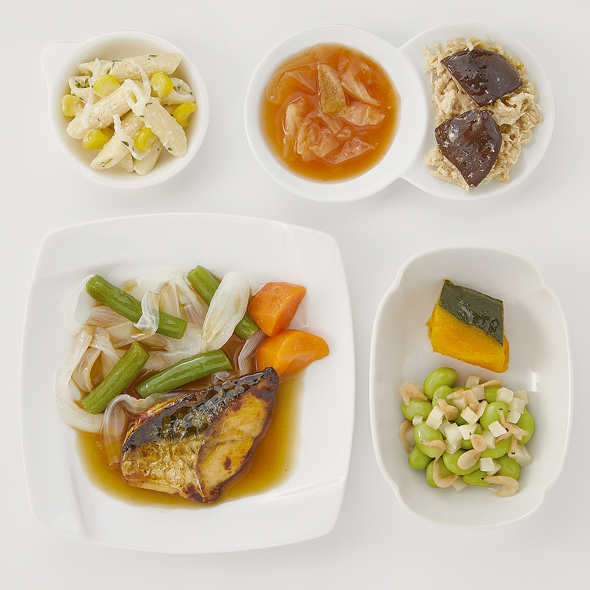 | 原材料名 | 玉ねぎ、さば、枝豆、かぼちゃ、サヤインゲン、人参、牛乳、蒸し鶏ほぐし身、キャベツ、マカロニ、大根、減塩醤油、ホワイトソース、砂糖、たけのこ水煮、なたね油、ケチャップ、コーン、清酒、乾燥しいたけ、本みりん、乾燥小えび、濃口醤油、トマトペースト、発酵調味料、食塩、顆粒和風だし、バターフレーバーオイル、果実調味料、顆粒洋風だし、おろしにんにく、白こしょう、パセリ粉、黒こしょう/増粘剤(加工デンプン)、調味料(アミノ酸等)、pH調整剤、酸化防止剤(V.C)、ポリリン酸Na、着色料(紅麹、カロチノイド)、酸味料、香料、乳化剤、(一部に小麦・乳成分・えび・牛肉・さば・大豆・鶏肉を含む) | ||