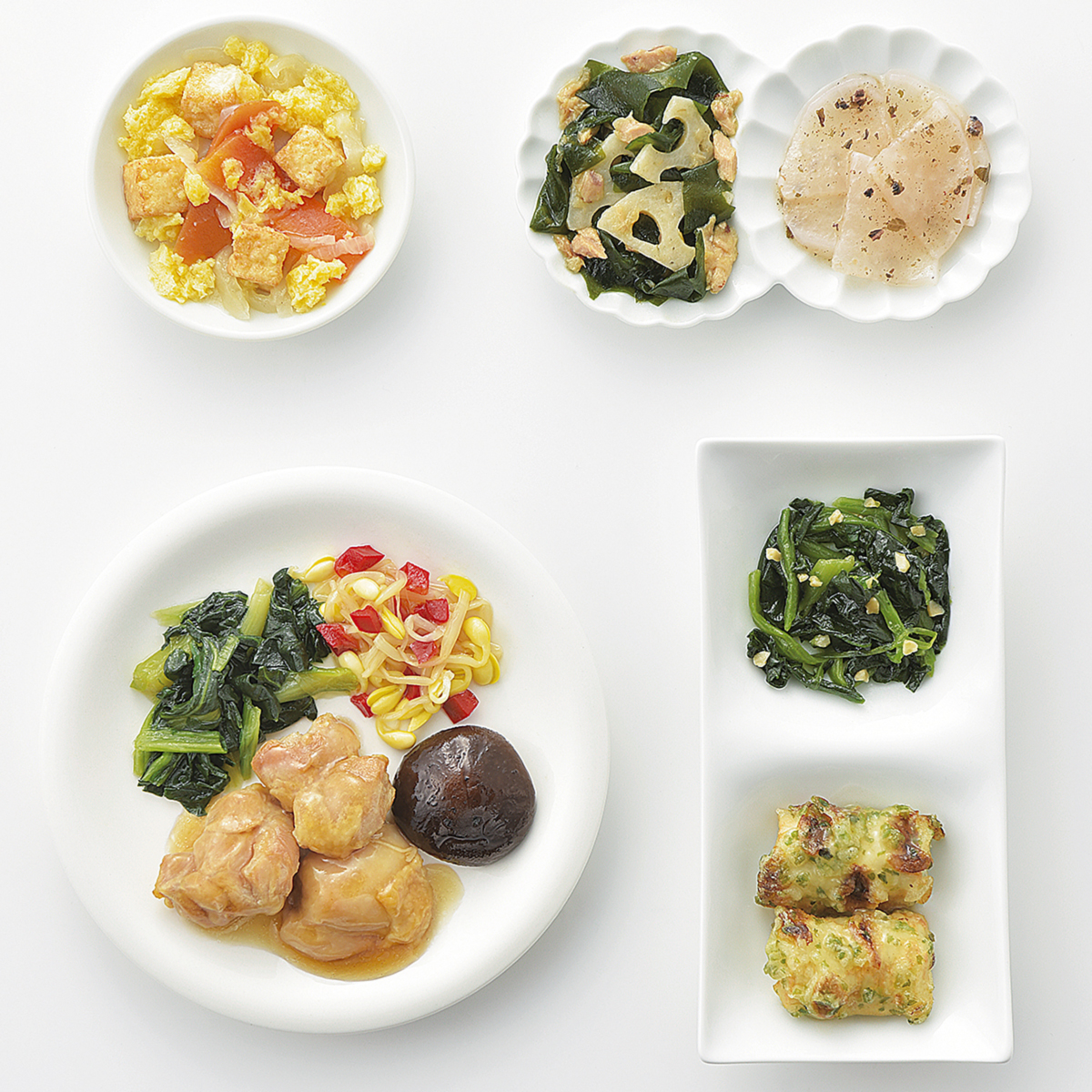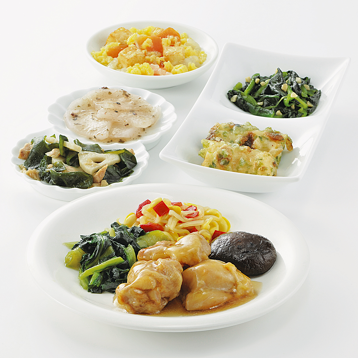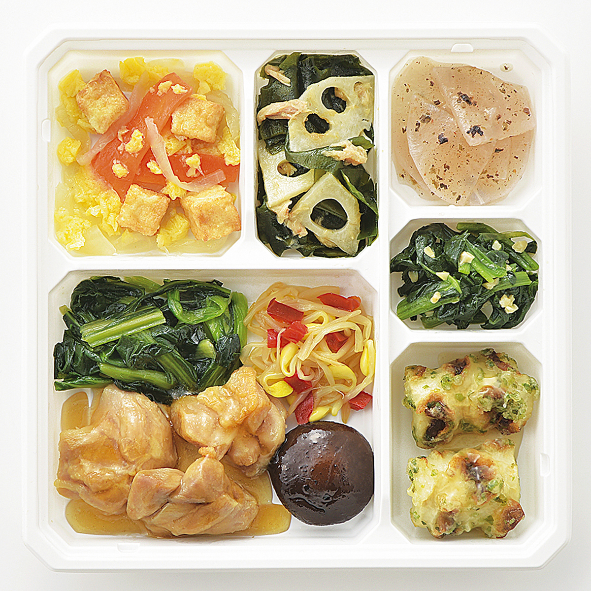 | 原材料名 | 鶏肉、ほうれん草、大根、竹輪、小松菜、玉ねぎ、大豆もやし、厚揚げ、なたね油、れんこん水煮、人参、濃口醤油、砂糖、ツナフレーク、炒り卵、天ぷら粉、赤ピーマン、本みりん、乾燥しいたけ、淡口醤油、しそ入調味梅肉、清酒、果実調味料、乾燥わかめ、発酵調味料、ローストアーモンド、顆粒和風だし、おろししょうが、顆粒中華風だし、乾燥赤しそ、食塩、あおさ粉、かつお削りぶし、白こしょう/加工デンプン、増粘剤(加工デンプン、増粘多糖類)、調味料(アミノ酸等)、トレハロース、pH調整剤、凝固剤、膨脹剤、酸味料、焼成Ca、着色料(クチナシ、野菜色素)、酸化防止剤(V.C)、マンニット、V.B1、甘味料(ステビア)、漂白剤(亜硫酸塩)、(一部に小麦・卵・アーモンド・牛肉・大豆・鶏肉・豚肉・ゼラチンを含む) | ||