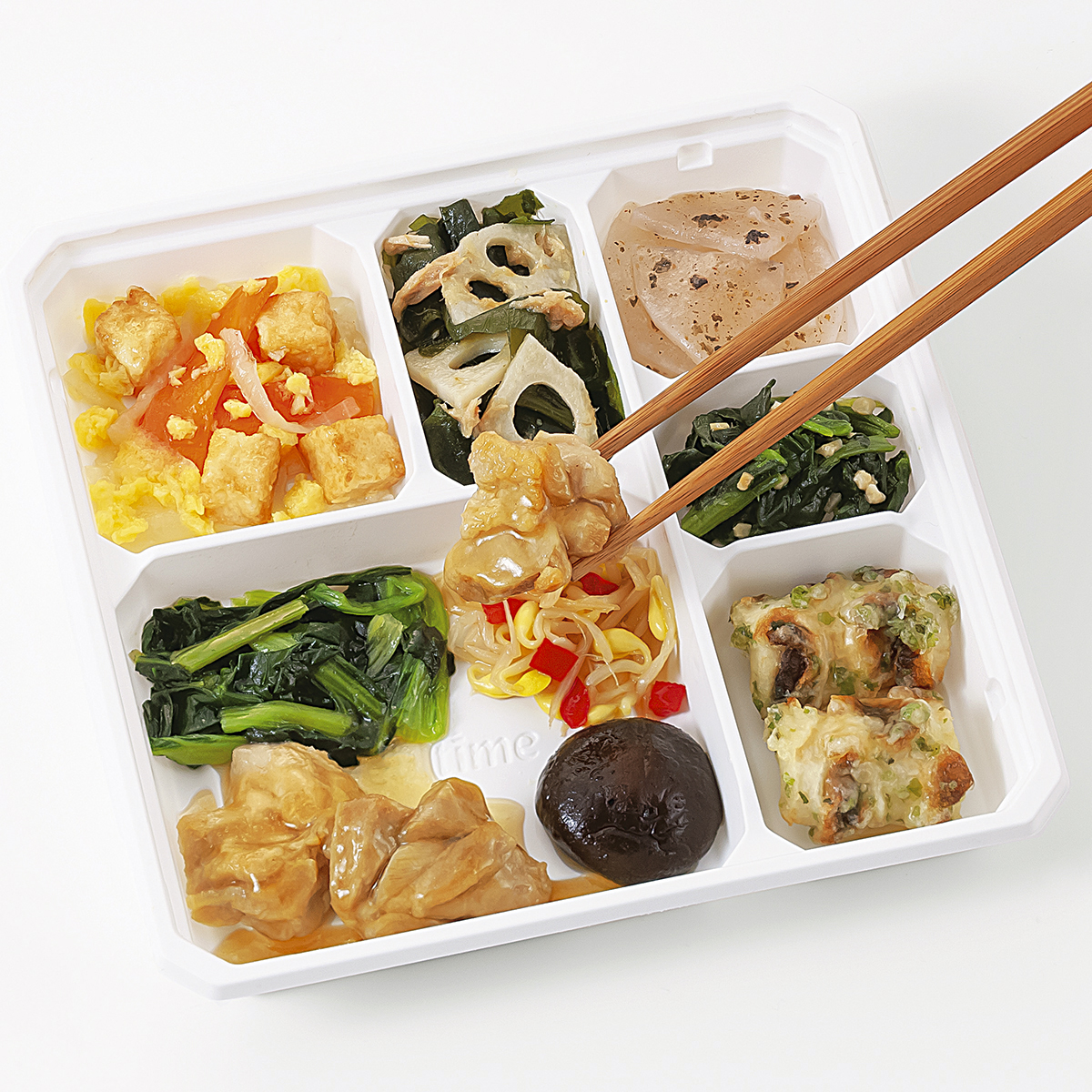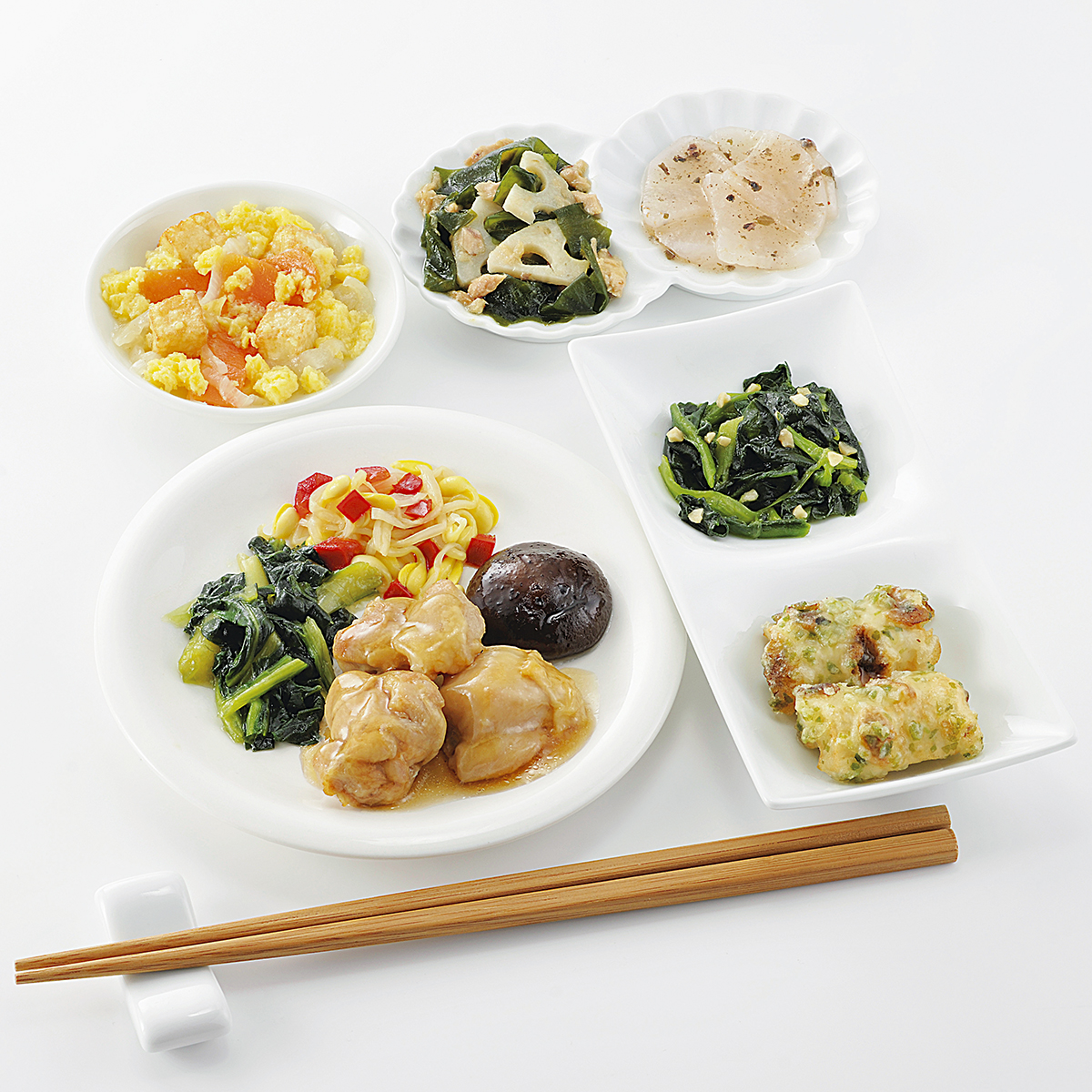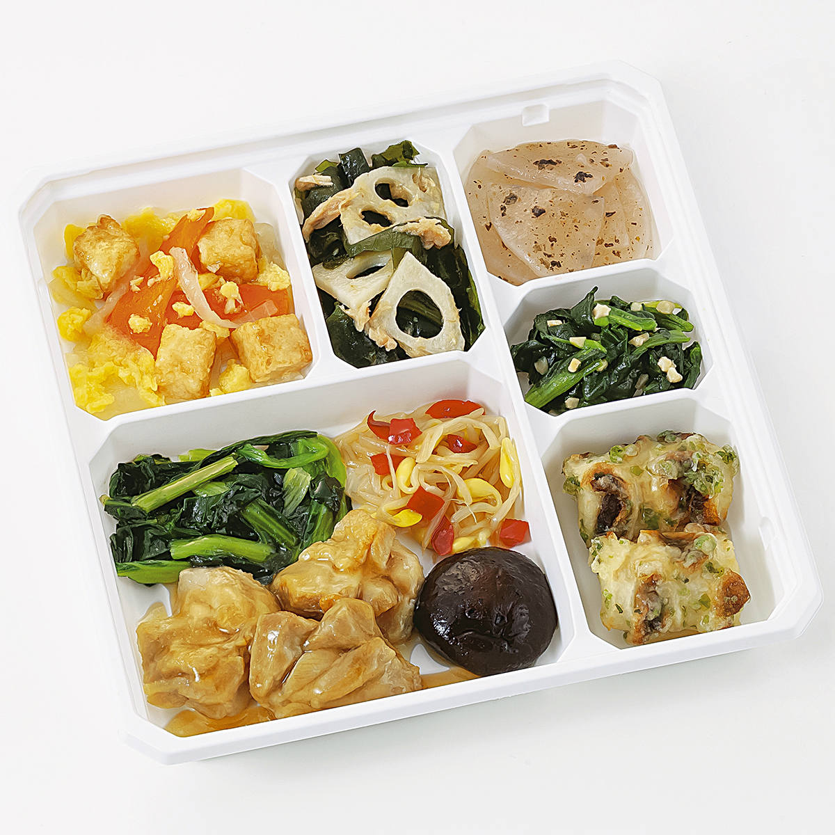 | 原材料名 | 鶏肉、ほうれん草、大根、竹輪、小松菜、玉ねぎ、大豆もやし、厚揚げ、なたね油、れんこん水煮、人参、濃口醤油、砂糖、ツナフレーク、炒り卵、天ぷら粉、赤ピーマン、本みりん、乾燥しいたけ、淡口醤油、しそ入調味梅肉、清酒、果実調味料、乾燥わかめ、発酵調味料、ローストアーモンド、顆粒和風だし、おろししょうが、顆粒中華風だし、乾燥赤しそ、食塩、あおさ粉、かつお削りぶし、白こしょう/加工デンプン、増粘剤(加工デンプン、増粘多糖類)、調味料(アミノ酸等)、トレハロース、pH調整剤、凝固剤、膨脹剤、酸味料、焼成Ca、着色料(クチナシ、野菜色素)、酸化防止剤(V.C)、マンニット、V.B1、甘味料(ステビア)、漂白剤(亜硫酸塩)、(一部に小麦・卵・アーモンド・牛肉・大豆・鶏肉・豚肉・ゼラチンを含む) | ||