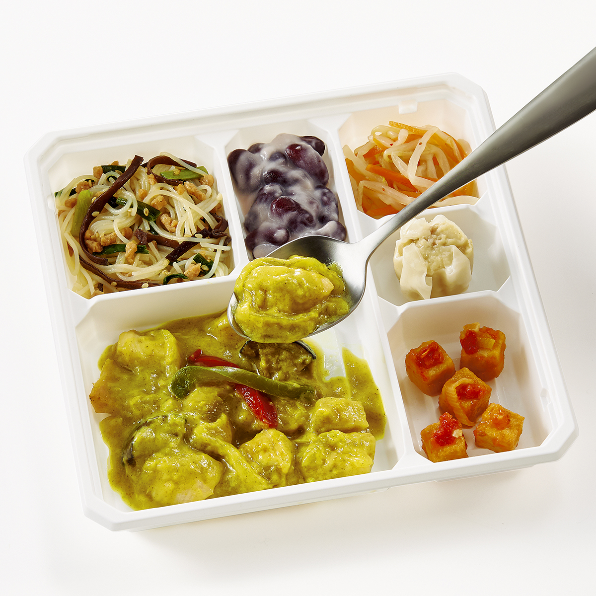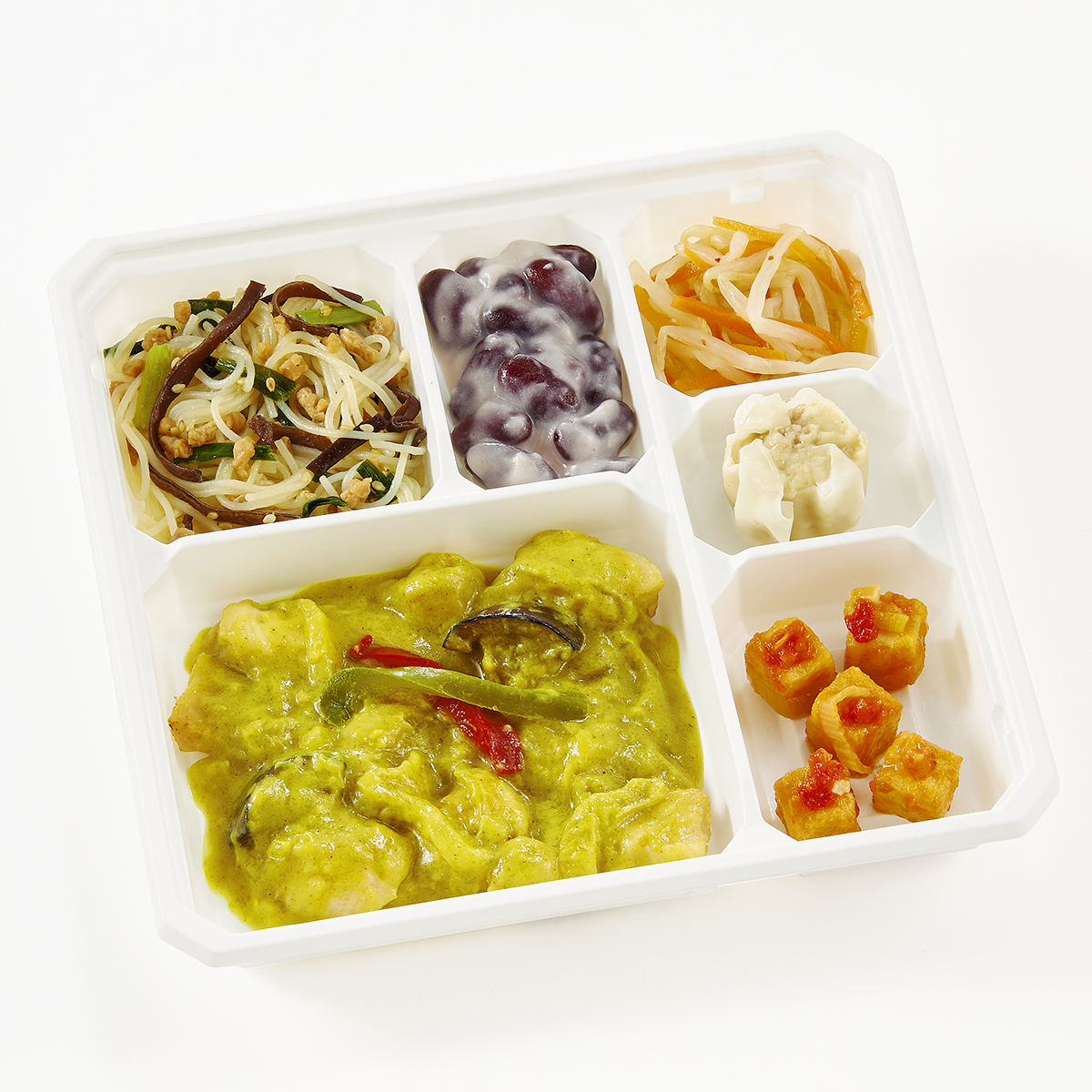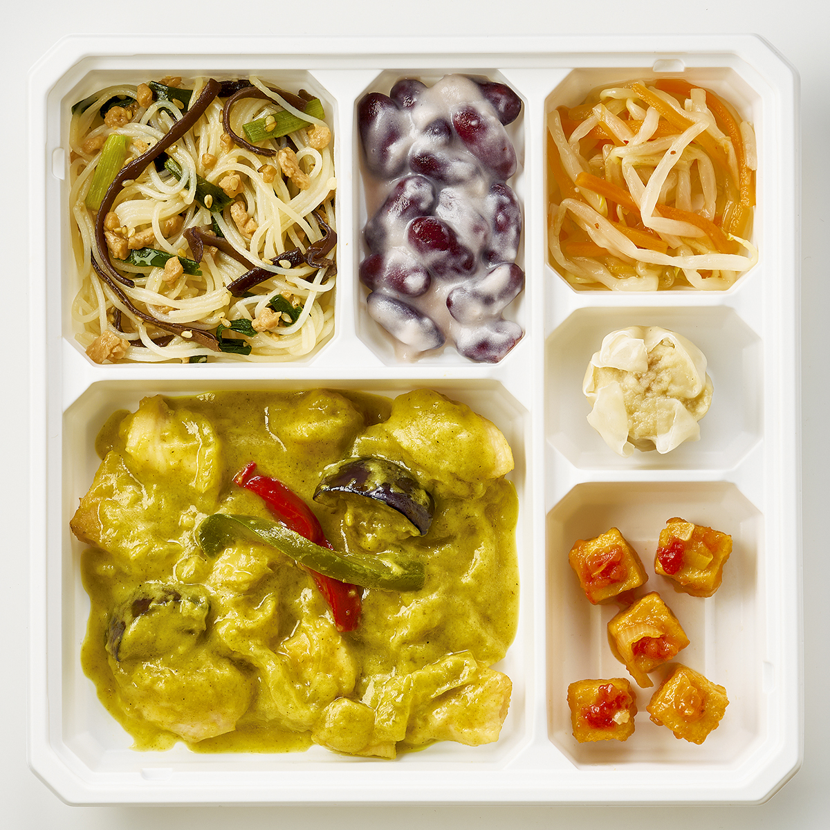 | 原材料名 | 鶏肉、緑豆もやし、焼売、ココナッツミルク、厚揚げ、ゆで赤インゲン豆、素揚げなす、玉ねぎ、砂糖、緑ピーマン、トマト・ピューレー漬、ビーフン、赤ピーマン、牛乳、人参、なたね油、にら、ナンプラー、粒状大豆たん白、ゆずごしょう、大豆油、ねぎ、ケチャップ、煎り白ごま、白インゲン豆ピューレー、カレー粉、おろししょうが、おろしにんにく、醸造酢、乾燥きくらげ、顆粒中華風だし、果実調味料、にんにく、オイスターソース、濃口醤油、ゼラチン、中華スープの素、食塩、コリアンダーパウダー、唐辛子、黒こしょう/糊料(加工デンプン、CMC、キサンタン)、調味料(アミノ酸等)、トレハロース、加工デンプン、凝固剤、pH調整剤、着色料(カラメル、クチナシ、紅麹、ラック)、乳化剤、リン酸塩(Na)、(一部に小麦・乳成分・牛肉・ごま・大豆・鶏肉・豚肉・ゼラチンを含む) | ||