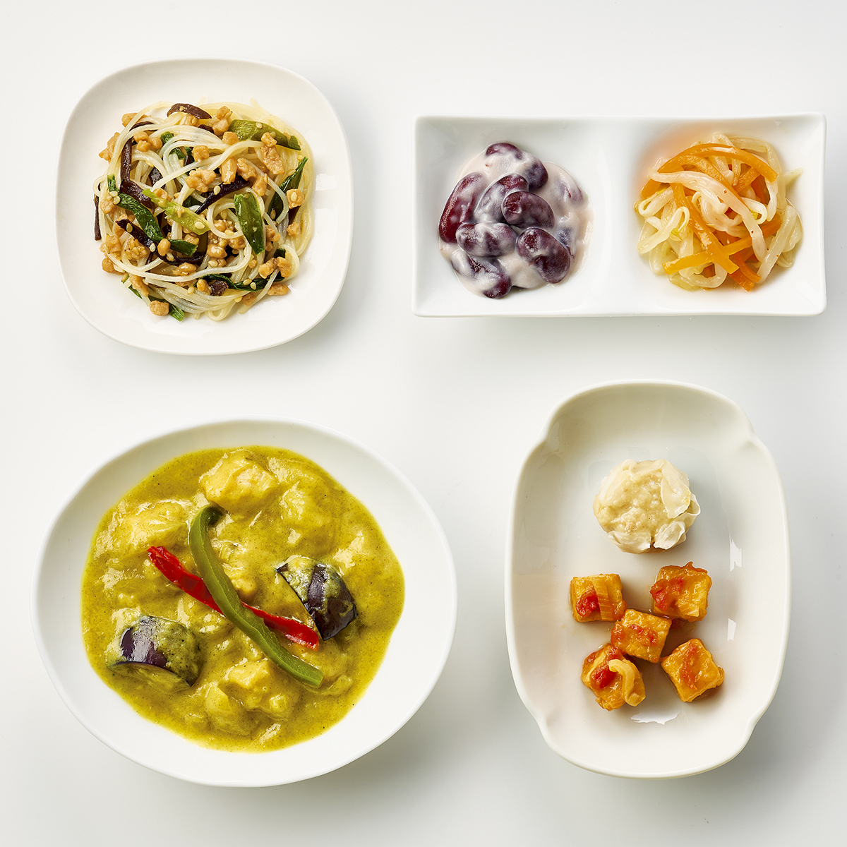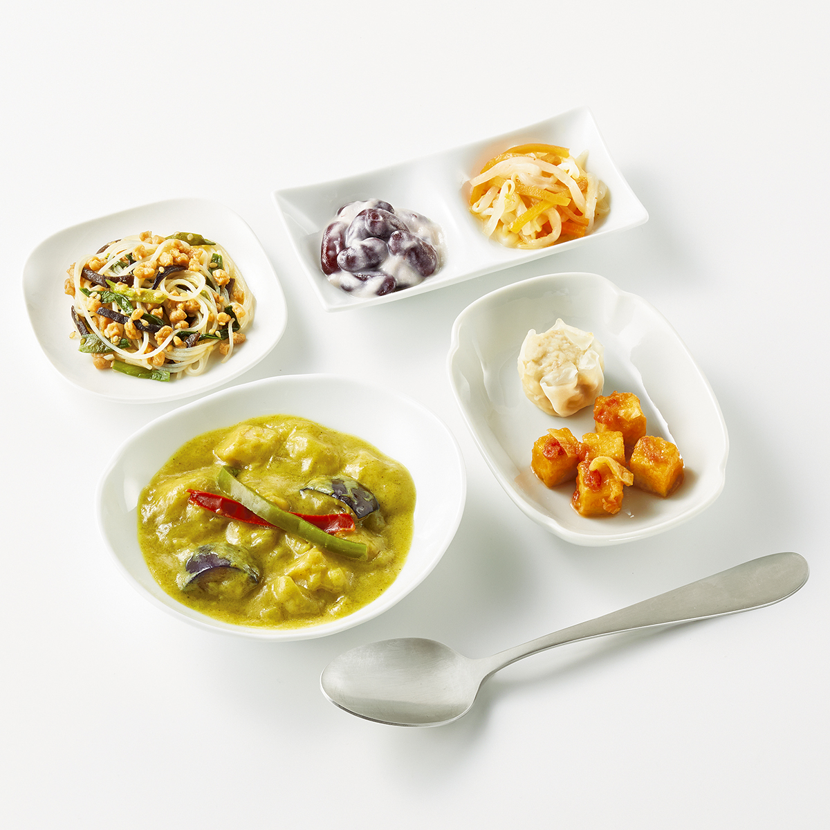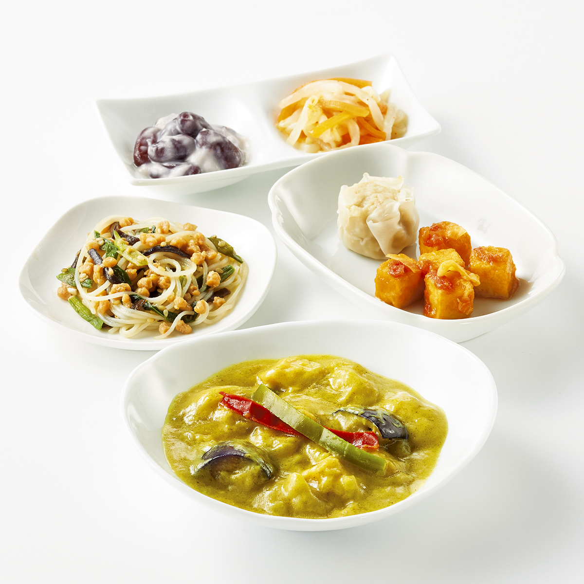 | 原材料名 | 鶏肉、緑豆もやし、焼売、ココナッツミルク、厚揚げ、ゆで赤インゲン豆、素揚げなす、玉ねぎ、砂糖、緑ピーマン、トマト・ピューレー漬、ビーフン、赤ピーマン、牛乳、人参、なたね油、にら、ナンプラー、粒状大豆たん白、ゆずごしょう、大豆油、ねぎ、ケチャップ、煎り白ごま、白インゲン豆ピューレー、カレー粉、おろししょうが、おろしにんにく、醸造酢、乾燥きくらげ、顆粒中華風だし、果実調味料、にんにく、オイスターソース、濃口醤油、ゼラチン、中華スープの素、食塩、コリアンダーパウダー、唐辛子、黒こしょう/糊料(加工デンプン、CMC、キサンタン)、調味料(アミノ酸等)、トレハロース、加工デンプン、凝固剤、pH調整剤、着色料(カラメル、クチナシ、紅麹、ラック)、乳化剤、リン酸塩(Na)、(一部に小麦・乳成分・牛肉・ごま・大豆・鶏肉・豚肉・ゼラチンを含む) | ||