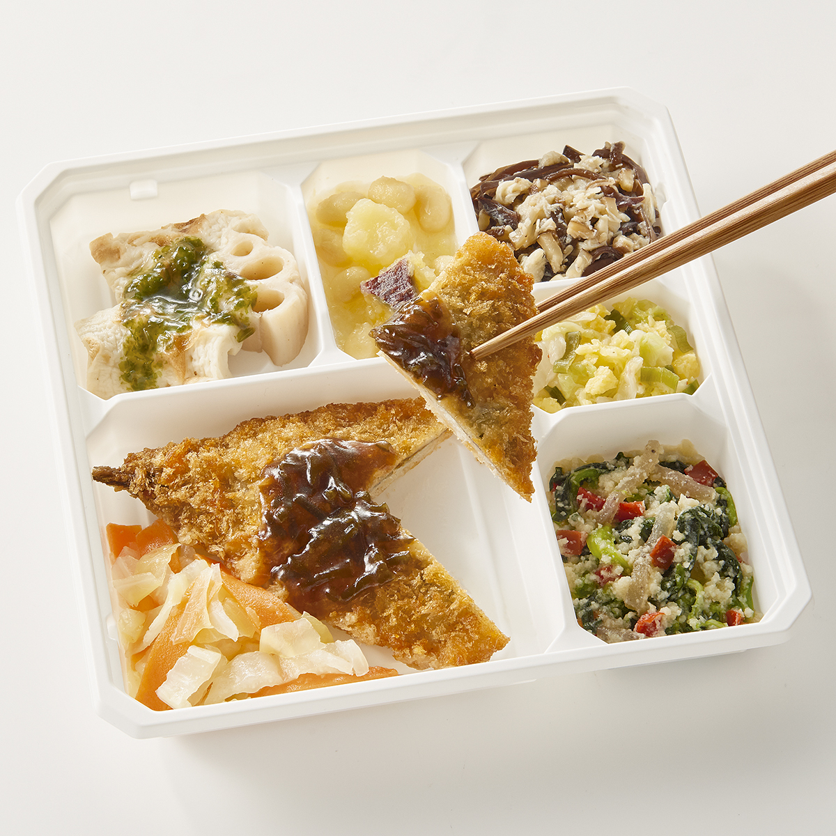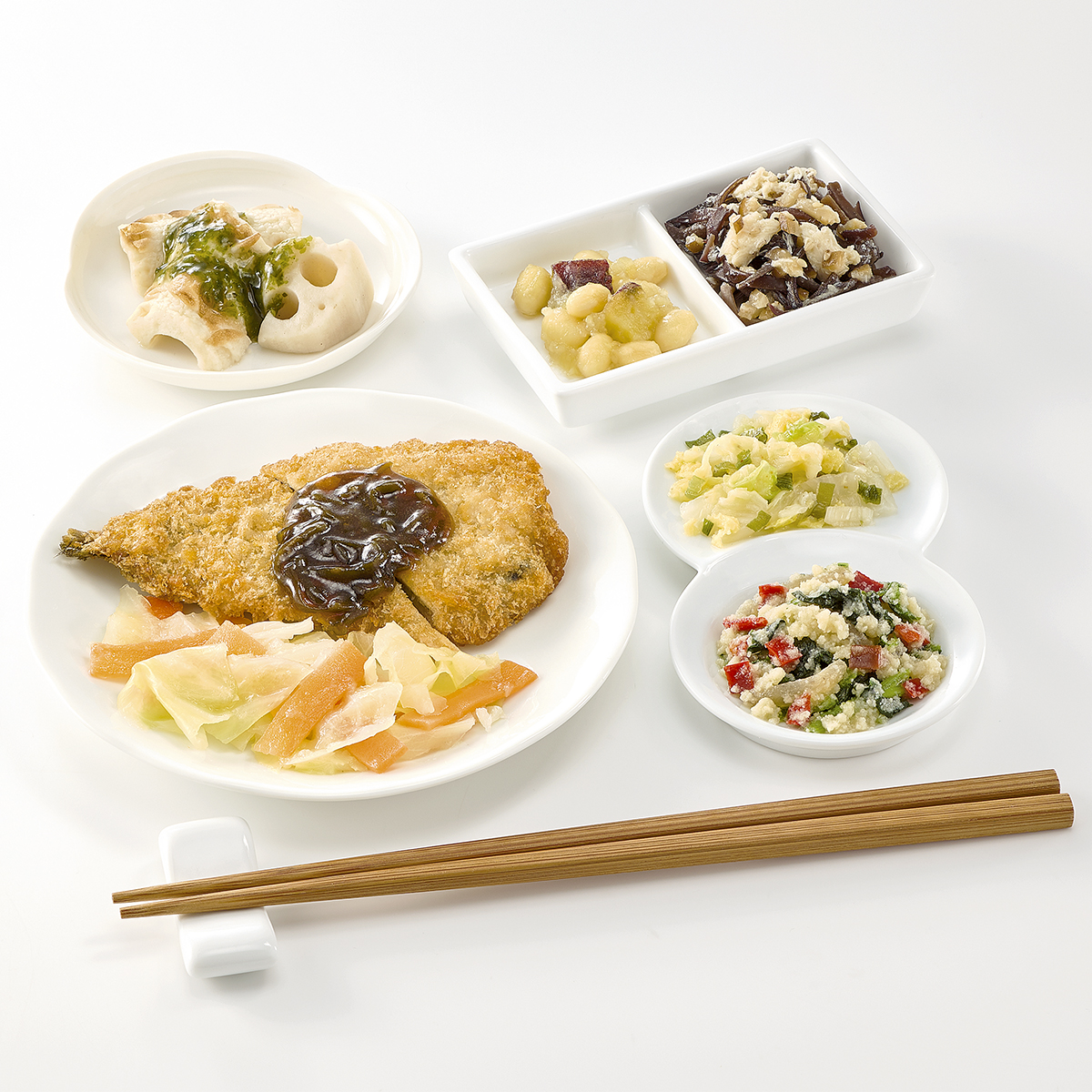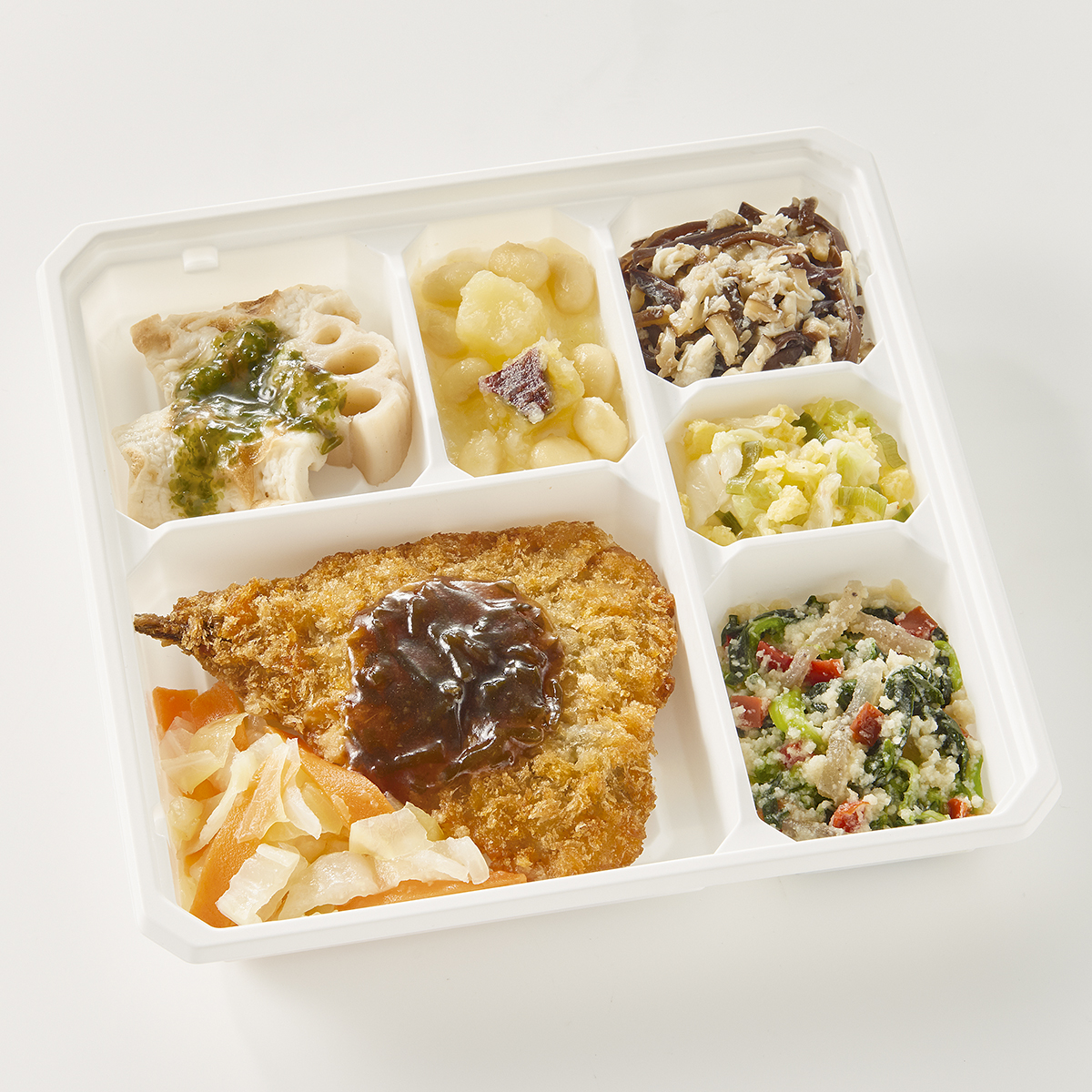 | 原材料名 | イワシフライ、キャベツ、竹輪、白菜、れんこん、なたね油、さつまいも、ほうれん草、蒸し大豆、人参、砂糖、こんにゃく、赤ピーマン、淡口醤油、蒸し鶏ほぐし身、発酵調味料、ねぎ、乾燥きくらげ、炒り卵、乾燥おから、塩昆布、顆粒和風だし、味噌、おろししょうが、乾燥しいたけ、煎り白ごま、食塩、濃口醤油、顆粒中華風だし、あおさ粉、唐辛子/糊料(加工デンプン、グァー)、加工デンプン、調味料(アミノ酸等)、焼成Ca、酸味料、酸化防止剤(V.C)、ポリリン酸Na、水酸化Ca、pH調整剤、カロチノイド色素、(一部に小麦・卵・牛肉・ごま・大豆・鶏肉・豚肉・ゼラチンを含む) | ||