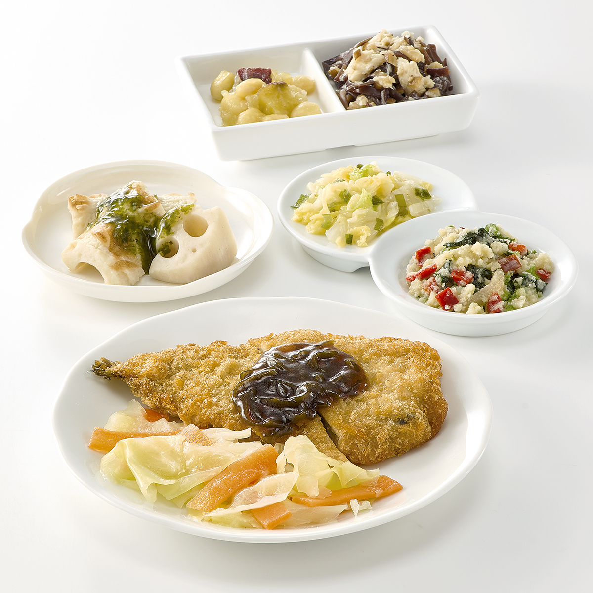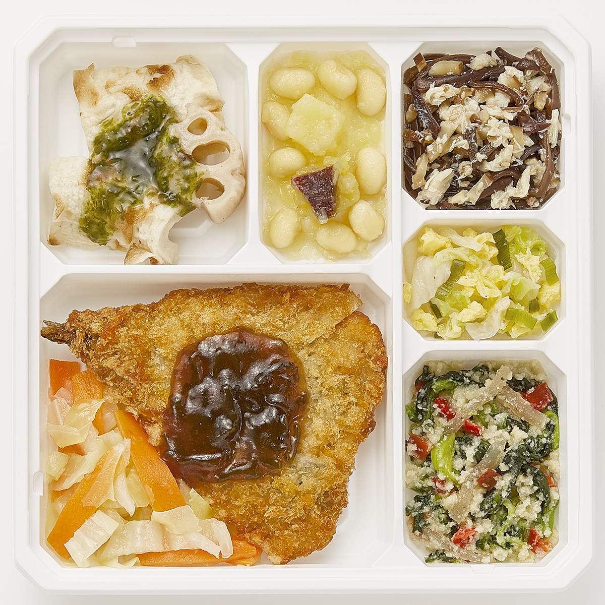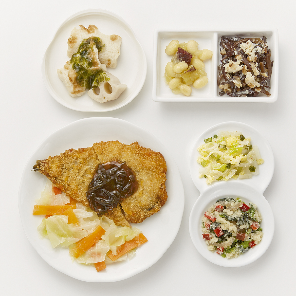 | 原材料名 | イワシフライ、キャベツ、竹輪、白菜、れんこん、なたね油、さつまいも、ほうれん草、蒸し大豆、人参、砂糖、こんにゃく、赤ピーマン、淡口醤油、蒸し鶏ほぐし身、発酵調味料、ねぎ、乾燥きくらげ、炒り卵、乾燥おから、塩昆布、顆粒和風だし、味噌、おろししょうが、乾燥しいたけ、煎り白ごま、食塩、濃口醤油、顆粒中華風だし、あおさ粉、唐辛子/糊料(加工デンプン、グァー)、加工デンプン、調味料(アミノ酸等)、焼成Ca、酸味料、酸化防止剤(V.C)、ポリリン酸Na、水酸化Ca、pH調整剤、カロチノイド色素、(一部に小麦・卵・牛肉・ごま・大豆・鶏肉・豚肉・ゼラチンを含む) | ||