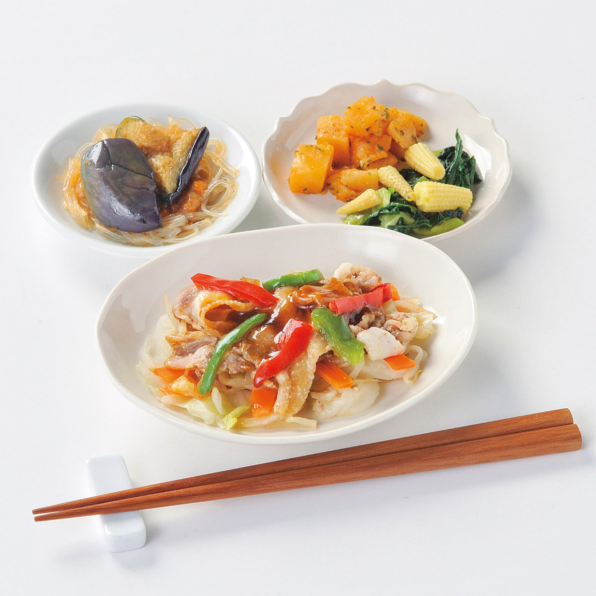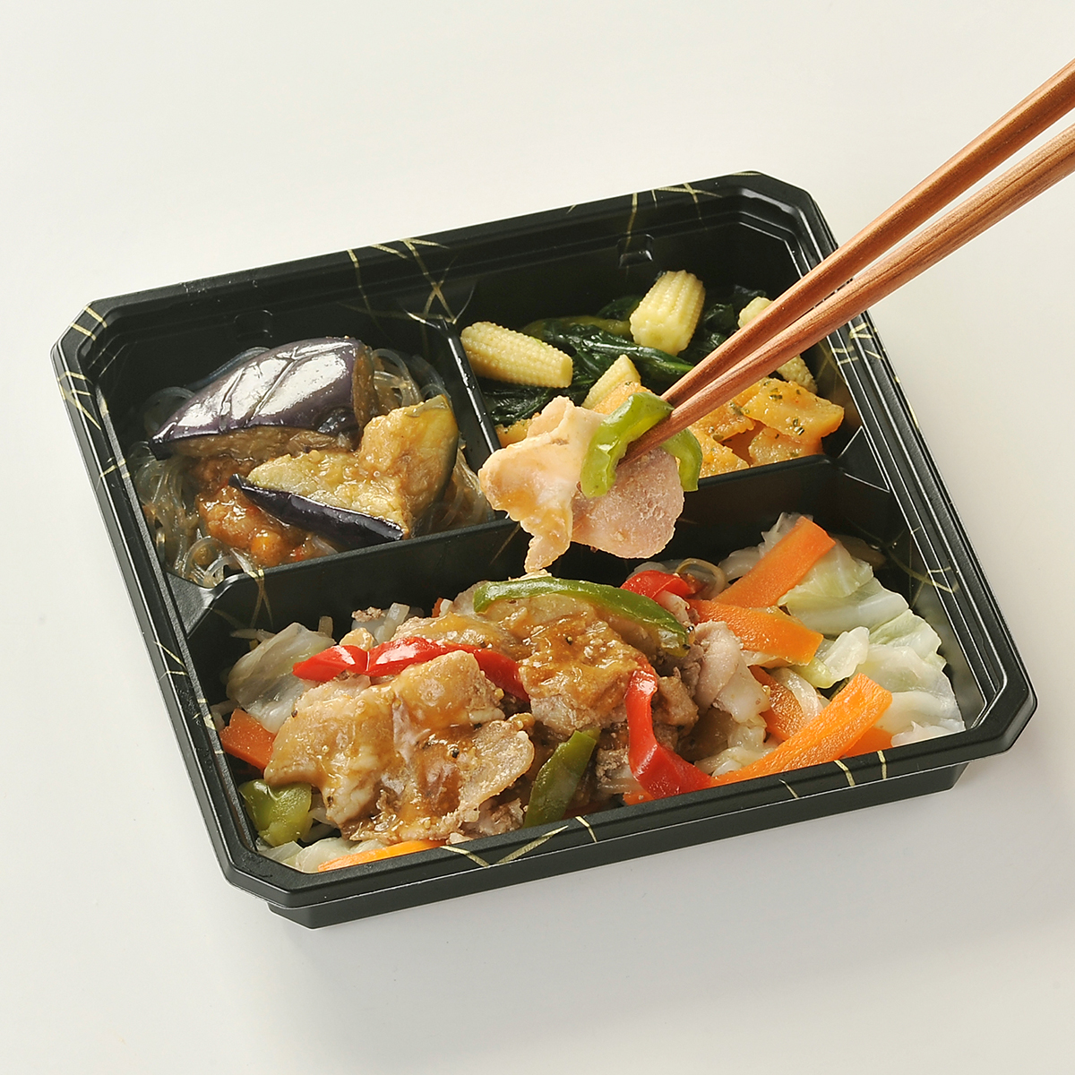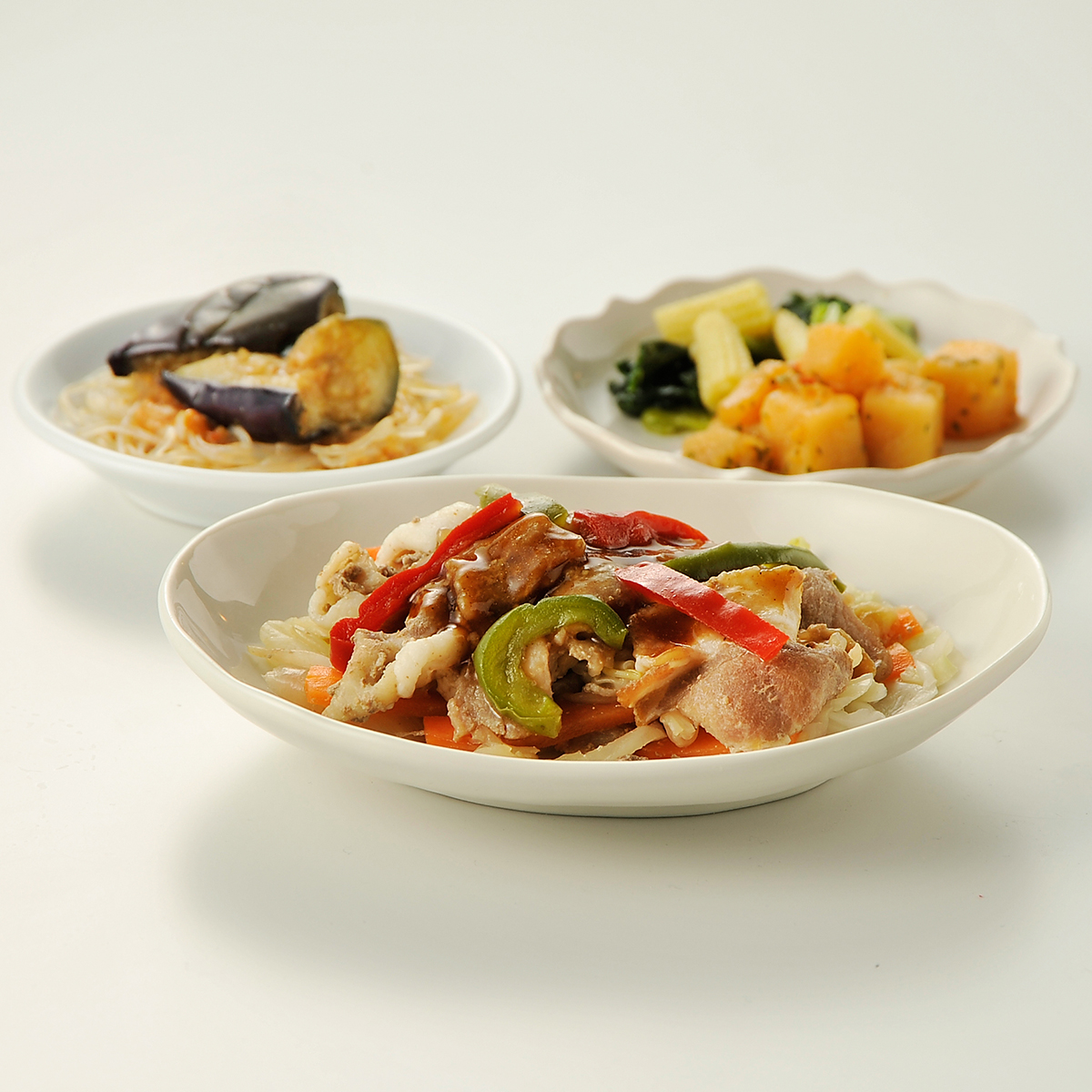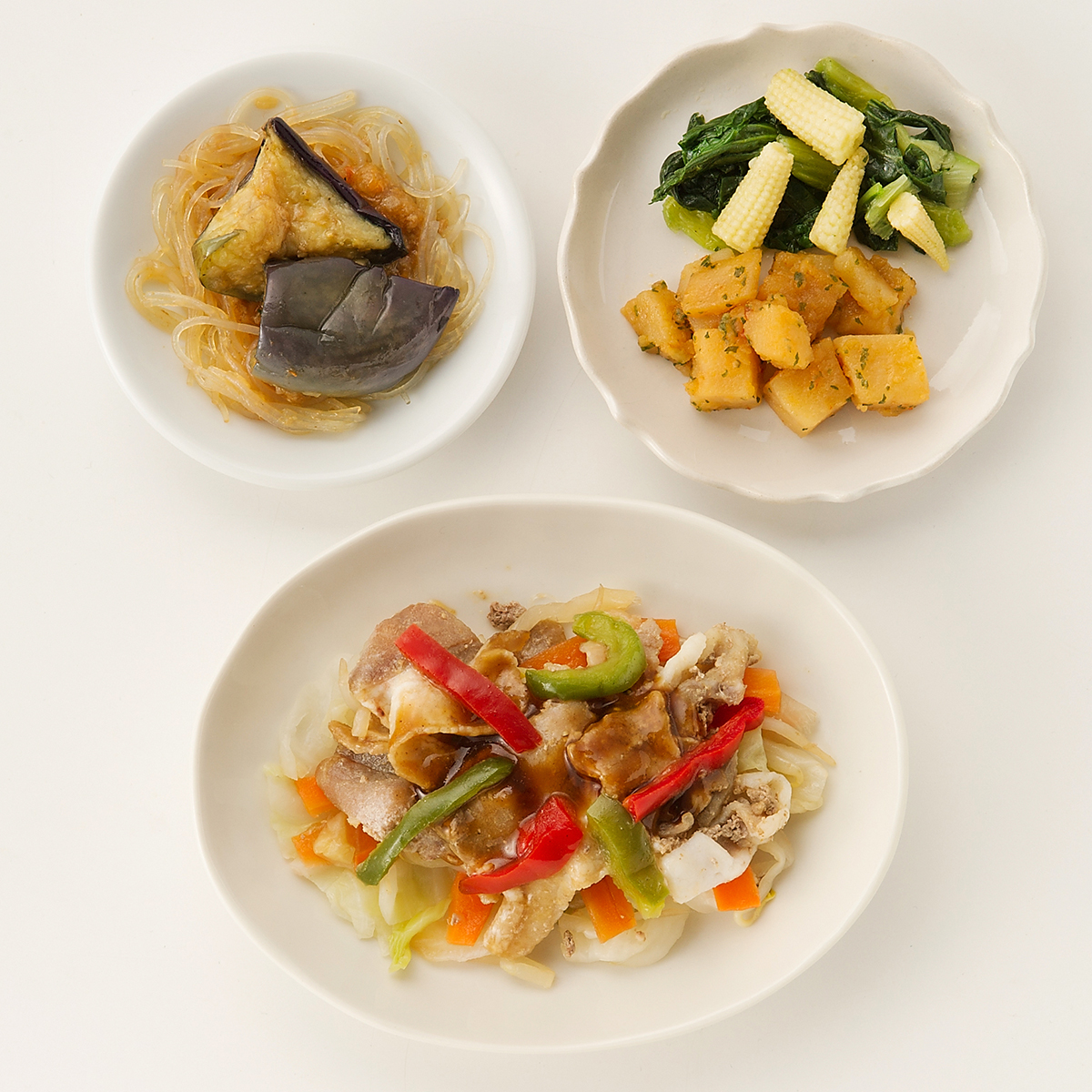 | 原材料名 | 豚肉、じゃがいも、キャベツ、素揚げなす、もやし、チンゲン菜、玉ねぎ、ヤングコーン、人参、緑ピーマン、赤ピーマン、ねぎ、春雨、和風調味液、大豆油、減塩醤油、濃口醤油、上白糖、清酒、味噌、オイスターソース、果実調味料、豆板醤、中華スープの素、ごま油、テンメンジャン、しょうが、にんにく、食塩、黒こしょう、おろしにんにく、パセリ粉、白こしょう、山椒パウダー/増粘剤(加工デンプン、キサンタン)、酒精、調味料(アミノ酸等)、pH調整剤、(一部に小麦・乳成分・牛肉・ごま・大豆・鶏肉・豚肉・ゼラチンを含む) | ||