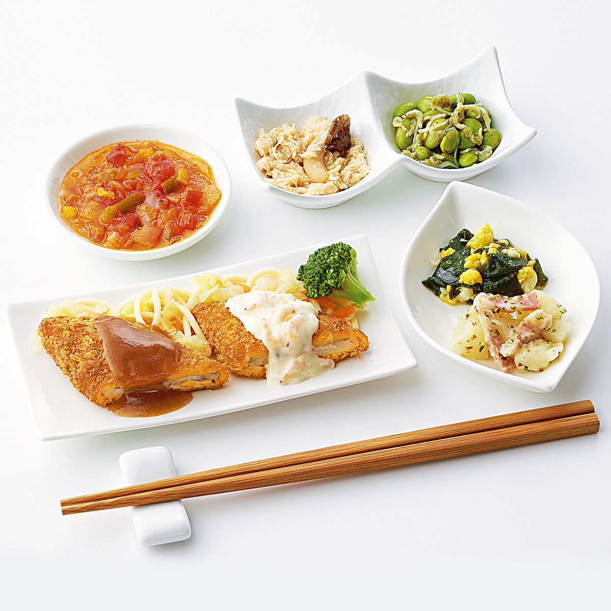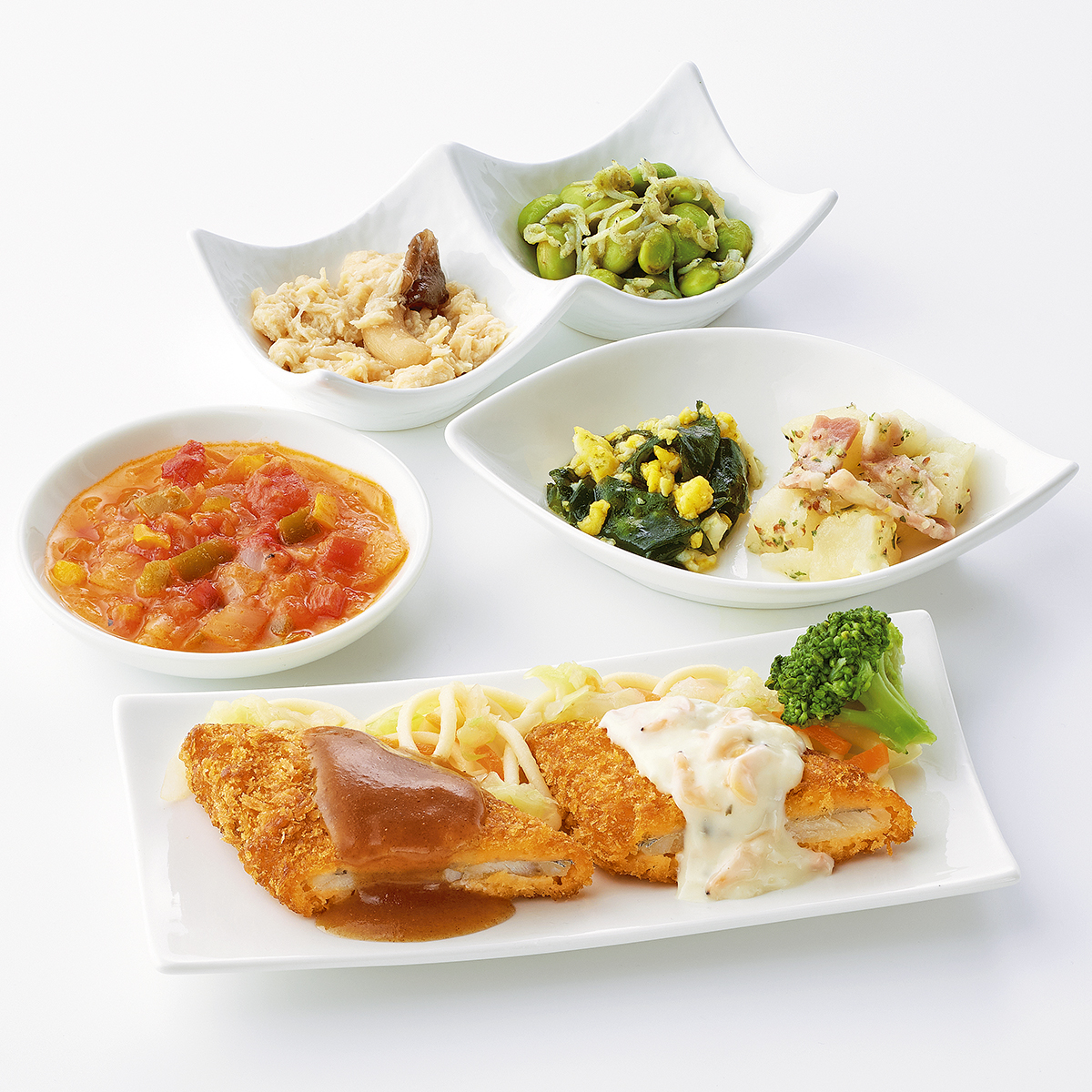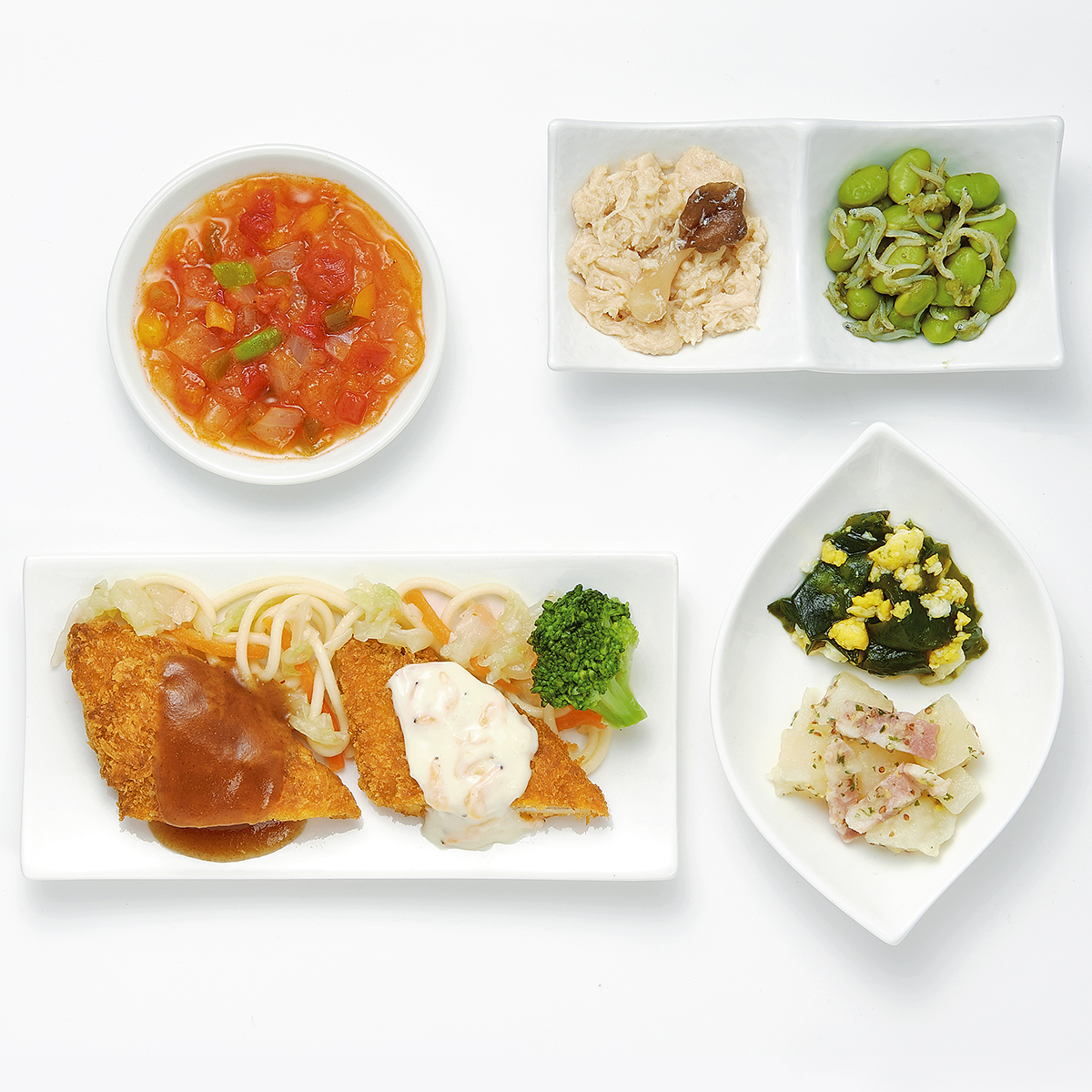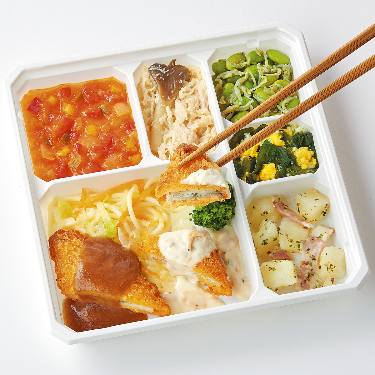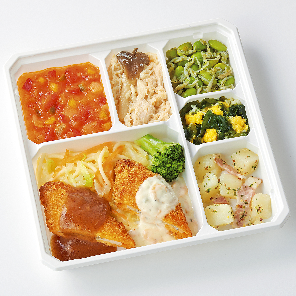 | 原材料名 | 白身魚フライ、じゃがいも、ブロッコリー、玉ねぎ、枝豆、蒸し鶏ほぐし身、なたね油、トマト・ピューレー漬、ひらたけ、キャベツ、乳等を主要原料とする食品、タルタルソース、スクランブルエッグ、黄ピーマン、赤ピーマン、緑ピーマン、スパゲティ、人参、しらす干し、デミグラスソース、ケチャップ、ショルダーベーコン、濃厚ソース、バターフレーバーオイル、発酵調味料、バジルソース、食塩、粒入りマスタード、減塩醤油、顆粒洋風だし、乾燥わかめ、乾燥小えび、オリーブオイル、砂糖、にんにく、ほうれん草ピューレー、調合油(なたね油、ごま油)、パセリ粉、黒こしょう、唐辛子、白こしょう/増粘剤(加工デンプン、増粘多糖類)、pH調整剤、調味料(アミノ酸等)、加工デンプン、リン酸塩(Na)、着色料(カラメル、カロチノイド、紅麹、コチニール、V.B2)、酒精、乳化剤、酸化防止剤(V.C)、カゼインNa、香料、酸味料、香辛料、発色剤(亜硝酸Na)、(一部に小麦・卵・乳成分・えび・牛肉・ごま・大豆・鶏肉・豚肉・りんごを含む) | ||