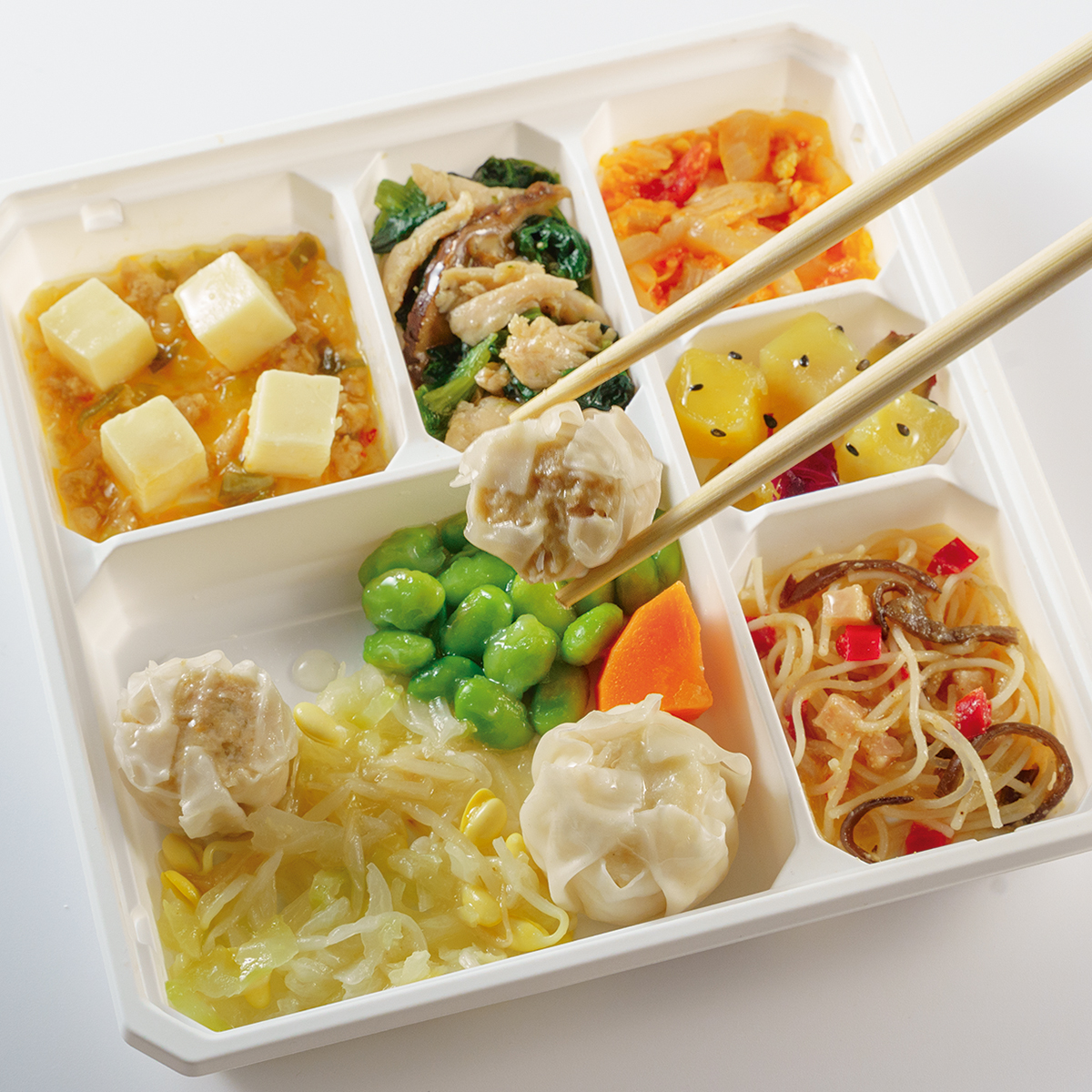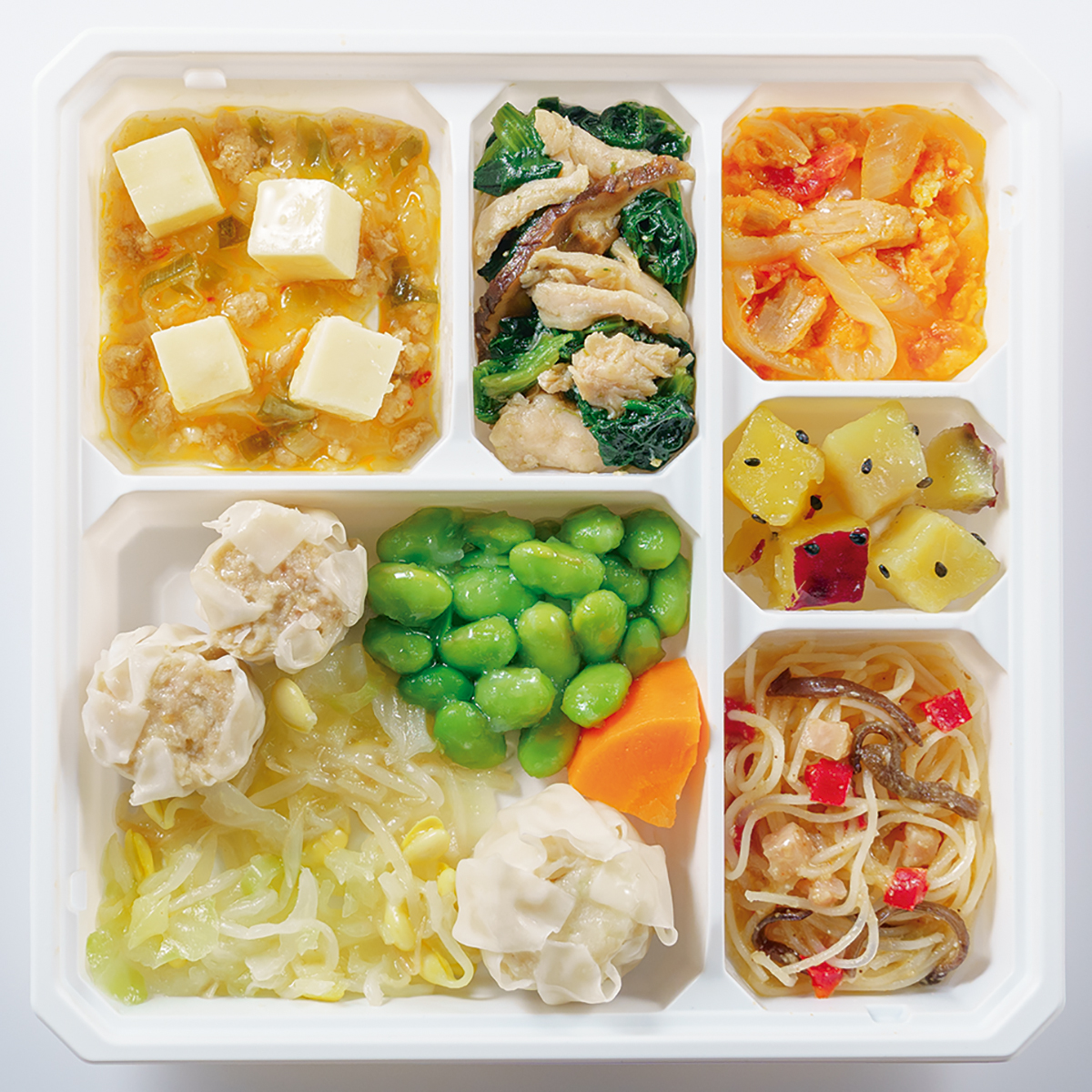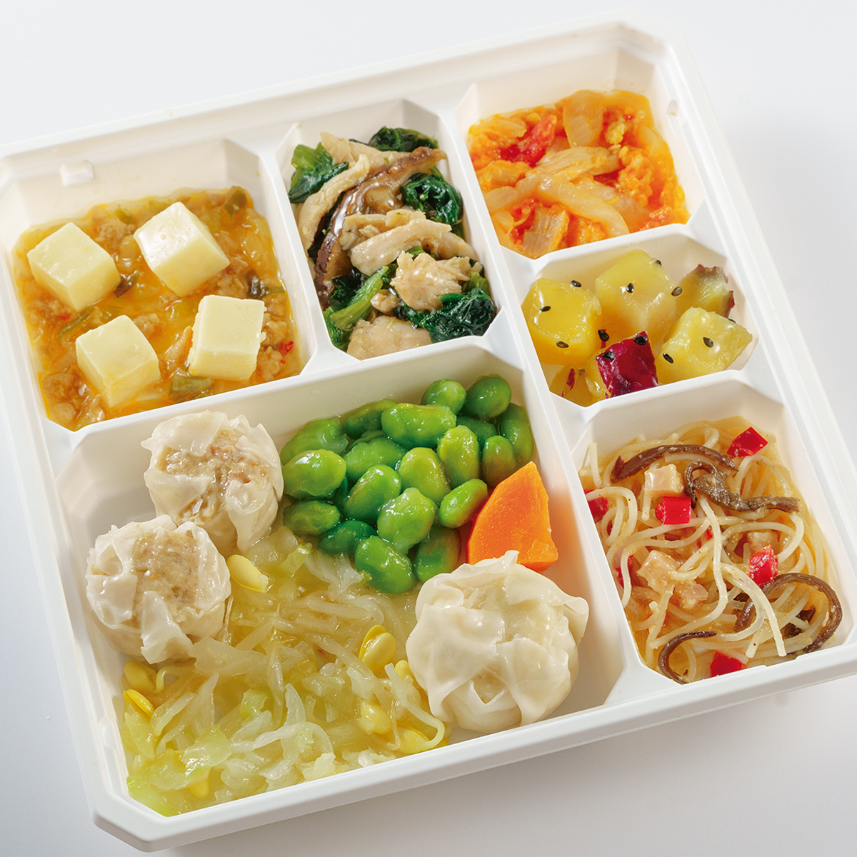 | 原材料名 | シュウマイ(玉ねぎ、小麦粉、鶏肉、パン粉、大豆たん白、でん粉、豚肉、その他)(国内製造)、海鮮シュウマイ(キャベツ、小麦粉、玉ねぎ、加工油脂、たらすり身、大豆たん白、パン粉、でん粉、いか、その他)、豆腐、ほうれん草、枝豆、さつまいも、大豆もやし、蒸し鶏、キャベツ、玉ねぎ、人参、ツナフレーク、ねぎ、豚肉、なたね油、春雨、砂糖、トマト・ピューレー漬、炒り卵、赤ピーマン、ハム、ケチャップ、濃口醤油、オイスターソース、すりごま、食塩、乾燥しいたけ、顆粒中華風だし、おろし生姜、焼肉のたれ、乾燥きくらげ、おろしにんにく、トウバンジャン、コチュジャン、顆粒和風だし、ごま、顆粒洋風だし、にんにく/増粘剤(加工でん粉、増粘多糖類)、調味料(アミノ酸等)、加工でん粉、グリシン、安定剤(加工でん粉)、豆腐用凝固剤、酢酸Na、膨張剤、リン酸塩(Na)、酸化防止剤(V.C)、着色料(カラメル、紅麹、ラック、カルミン酸)、pH調整剤、酸味料、香辛料、くん液、発色剤(亜硝酸Na)、(一部にかに・小麦・卵・乳成分・いか・牛肉・ごま・大豆・鶏肉・豚肉・もも・りんご・ゼラチンを含む) | ||
