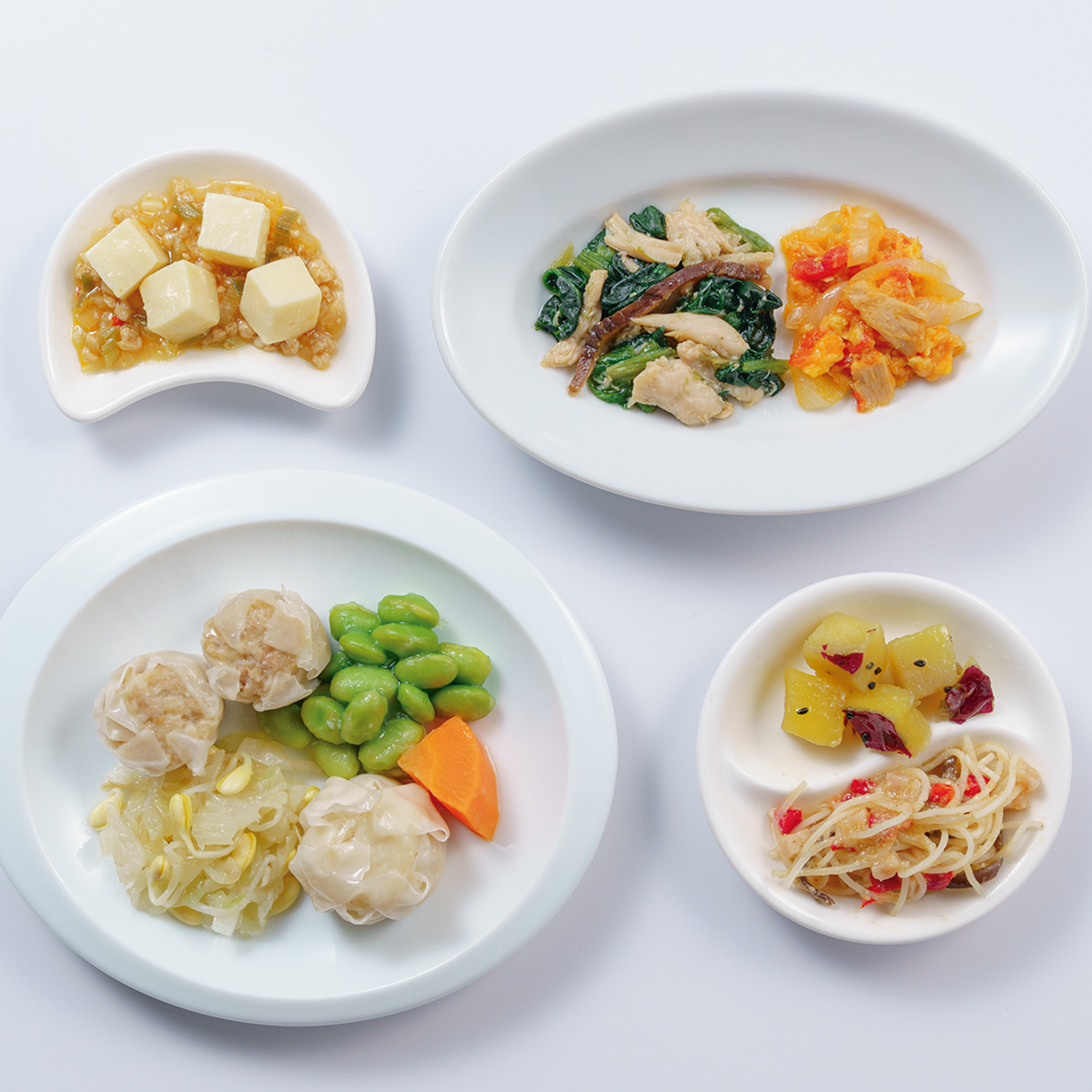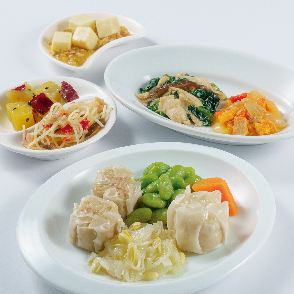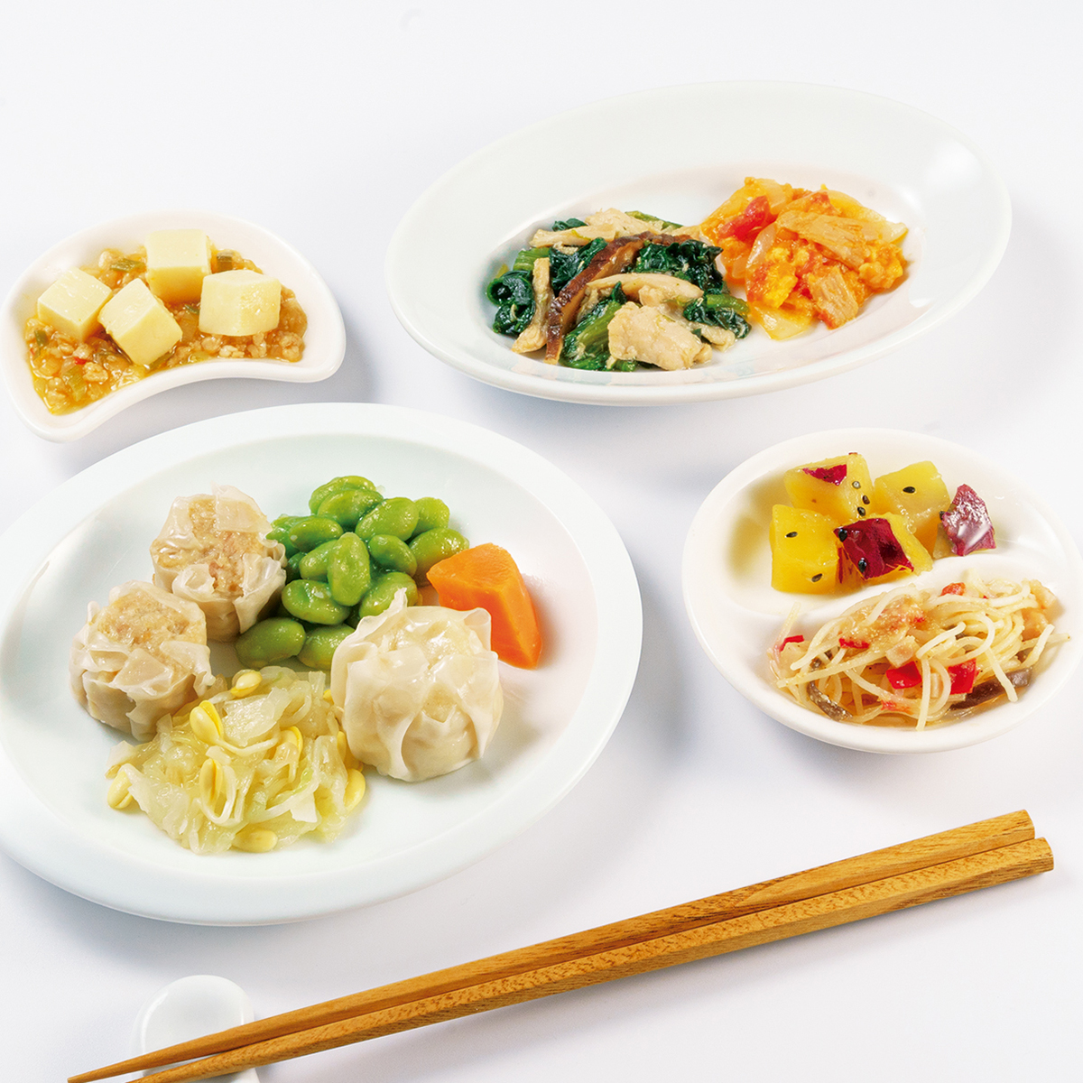 | 原材料名 | シュウマイ(玉ねぎ、小麦粉、鶏肉、パン粉、大豆たん白、でん粉、豚肉、その他)(国内製造)、海鮮シュウマイ(キャベツ、小麦粉、玉ねぎ、加工油脂、たらすり身、大豆たん白、パン粉、でん粉、いか、その他)、豆腐、ほうれん草、枝豆、さつまいも、大豆もやし、蒸し鶏、キャベツ、玉ねぎ、人参、ツナフレーク、ねぎ、豚肉、なたね油、春雨、砂糖、トマト・ピューレー漬、炒り卵、赤ピーマン、ハム、ケチャップ、濃口醤油、オイスターソース、すりごま、食塩、乾燥しいたけ、顆粒中華風だし、おろし生姜、焼肉のたれ、乾燥きくらげ、おろしにんにく、トウバンジャン、コチュジャン、顆粒和風だし、ごま、顆粒洋風だし、にんにく/増粘剤(加工でん粉、増粘多糖類)、調味料(アミノ酸等)、加工でん粉、グリシン、安定剤(加工でん粉)、豆腐用凝固剤、酢酸Na、膨張剤、リン酸塩(Na)、酸化防止剤(V.C)、着色料(カラメル、紅麹、ラック、カルミン酸)、pH調整剤、酸味料、香辛料、くん液、発色剤(亜硝酸Na)、(一部にかに・小麦・卵・乳成分・いか・牛肉・ごま・大豆・鶏肉・豚肉・もも・りんご・ゼラチンを含む) | ||