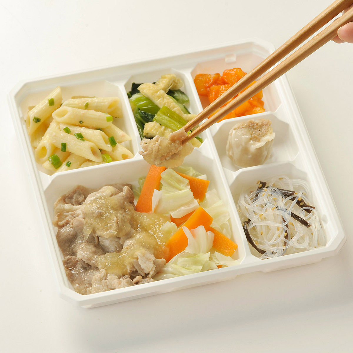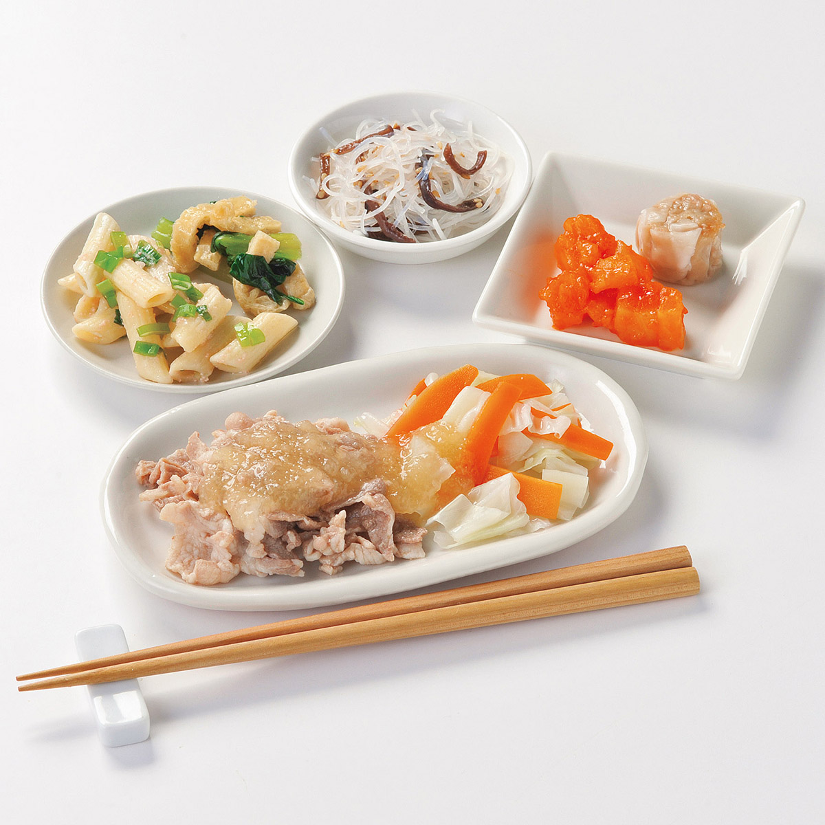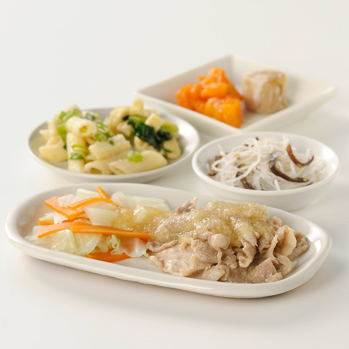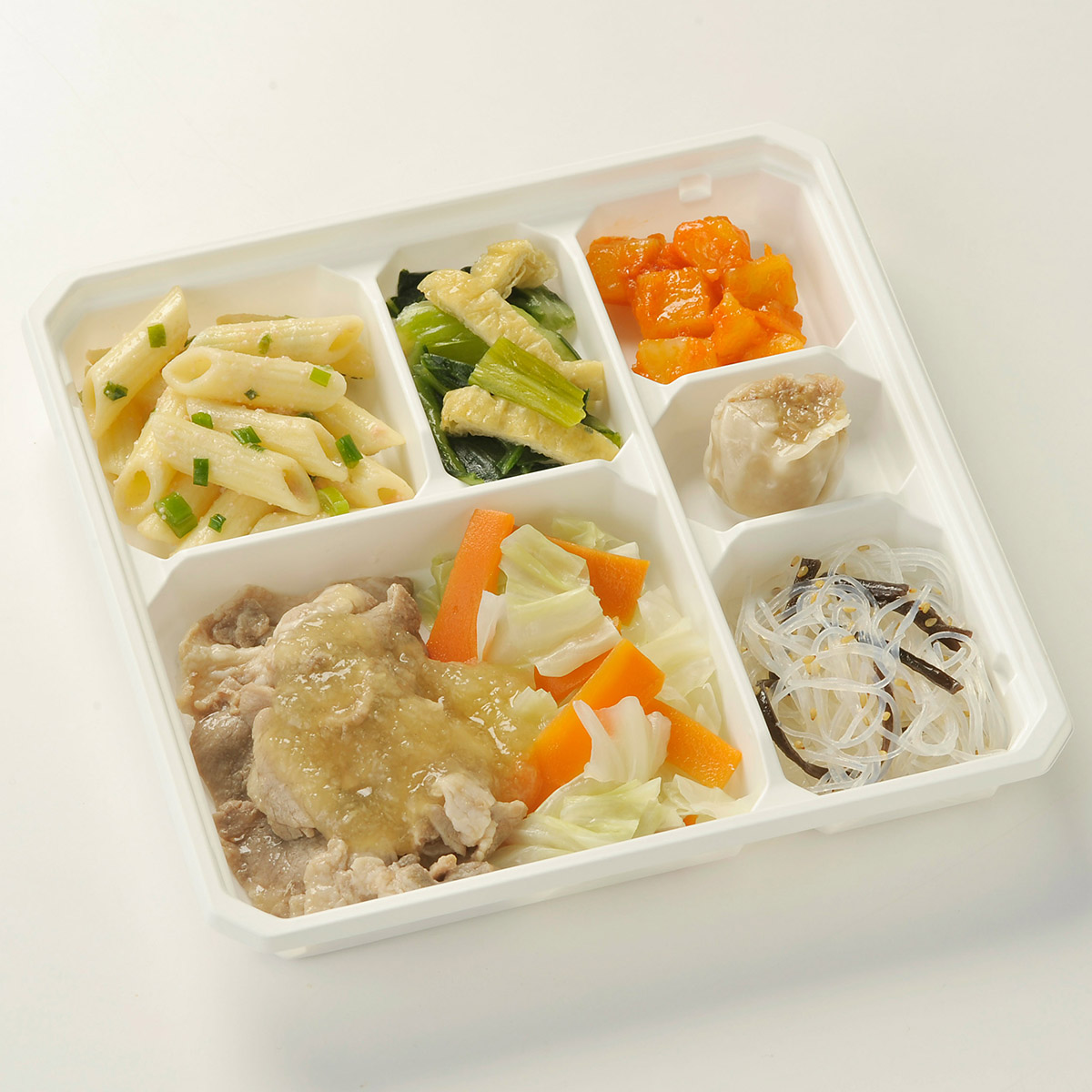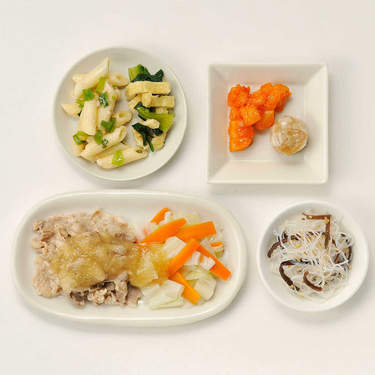 | 原材料名 | 豚肉、チンゲン菜、キャベツ、焼売、大根、じゃがいも、人参、マカロニ、なたね油、和風調味液、ねぎ、春雨、トマト・ピューレー漬、濃口醤油、油揚げ、たらこ、ケチャップ、砂糖、トマトペースト、煎り白ごま、大豆油、乾燥きくらげ、果実調味料、ごま油、おろししょうが、ゆず果汁、食塩、顆粒洋風だし、バターフレーバーオイル、ゼラチン、おろしにんにく、顆粒中華風だし、白こしょう、顆粒和風だし/増粘剤(加工デンプン、キサンタン)、調味料(アミノ酸等)、加工デンプン、pH調整剤、酒精、酢酸Na、酸味料、着色料(紅麹、ラック、カロチノイド)、香料、グリシン、乳化剤、(一部に小麦・乳成分・牛肉・ごま・さば・大豆・鶏肉・豚肉・ゼラチン・魚醤(魚介類)を含む) | ||