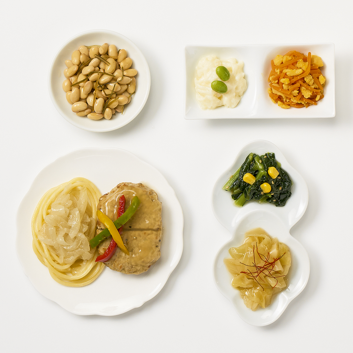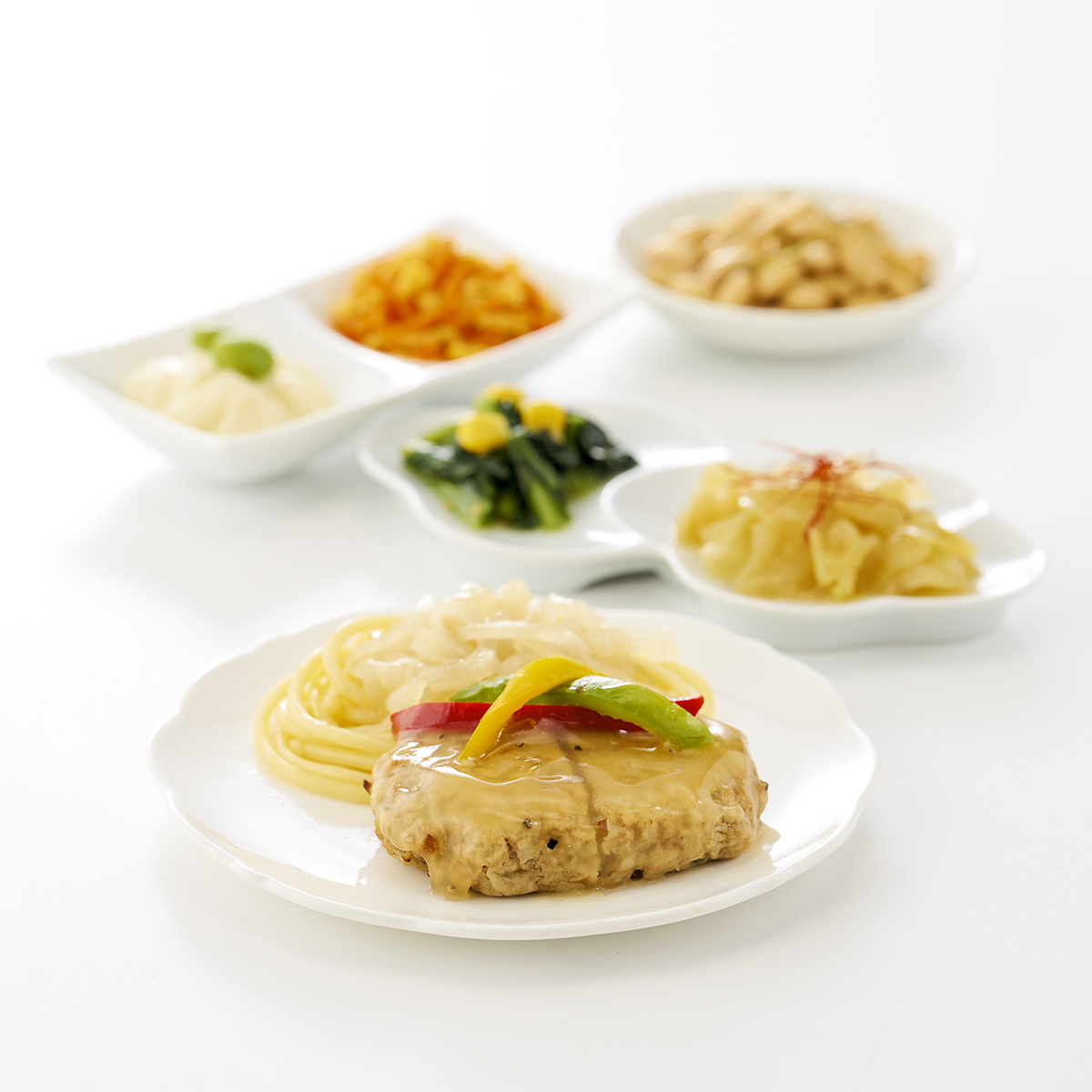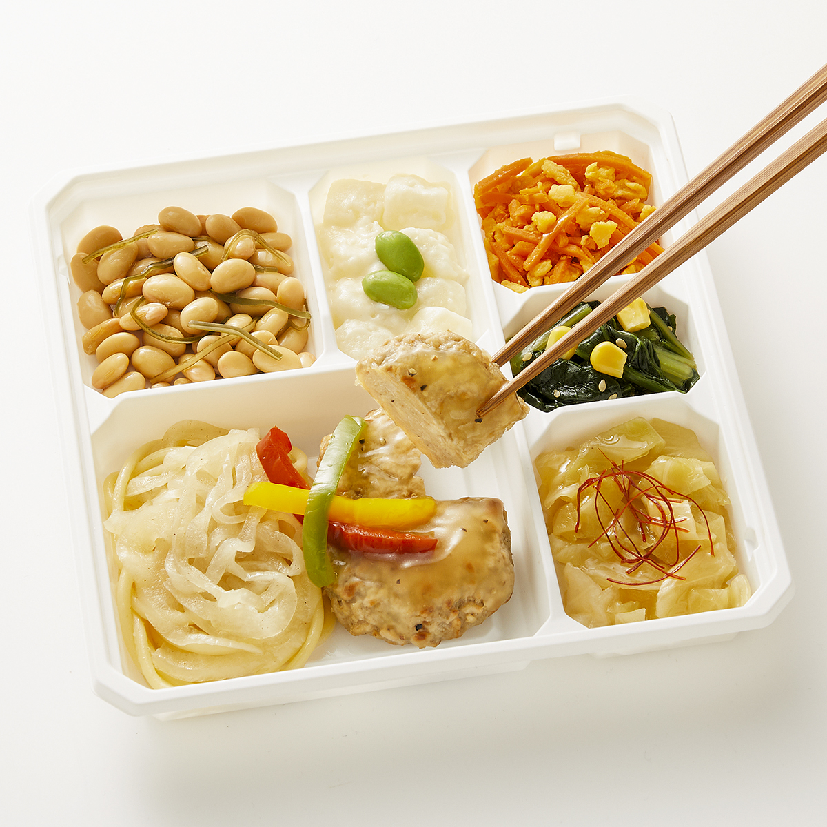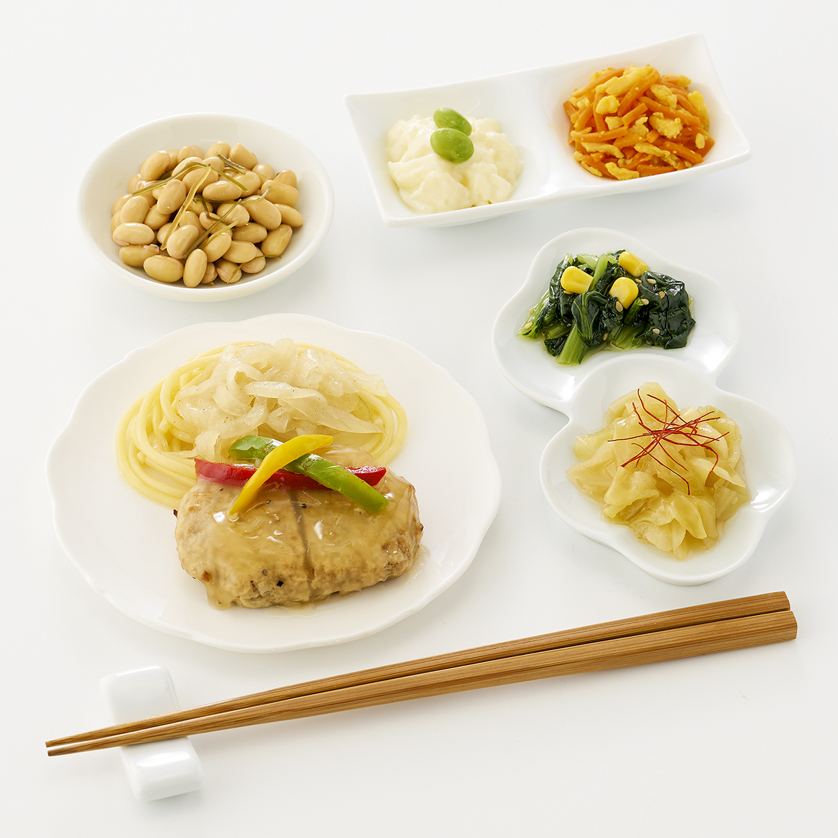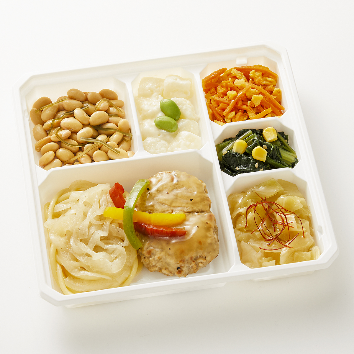 | 原材料名 | ハンバーグ(国内製造)、水煮大豆(カナダ産)、玉ねぎ(日本産)、キャベツ、スパゲティ、ポテトサラダ、小松菜、人参、ピーマン、卵、半固体状ドレッシング、醤油、こんぶ加工品、枝豆、砂糖、とうもろこし、発酵調味料、植物油、みりん風調味料、ごま、調合ごま油、醤油だし、食塩、糸唐辛子、粉末調味料、還元でん粉加水分解物、黒胡椒/増粘剤(加工でん粉、増粘多糖類)、調味料(アミノ酸等)、pH調整剤、リン酸塩(Na)、酵素、酸化防止剤(V.E、チャ抽出物)、香辛料、酸味料、香料、着色料(ココア)、酢酸、酒精、(一部に小麦・卵・乳成分・牛肉・ごま・さば・ゼラチン・大豆・鶏肉・豚肉・りんごを含む) | ||