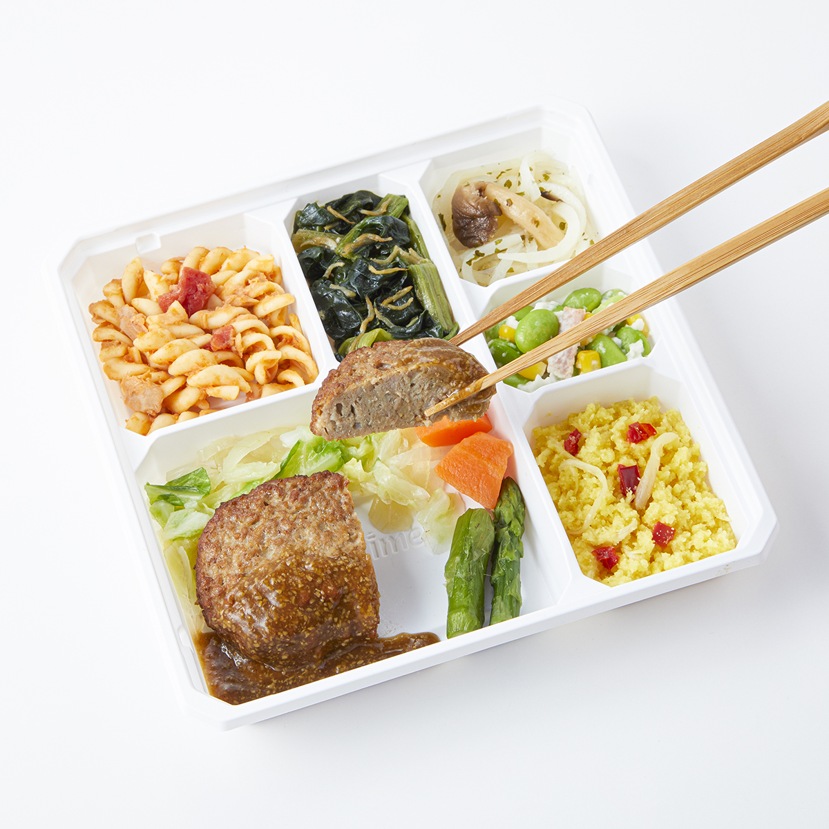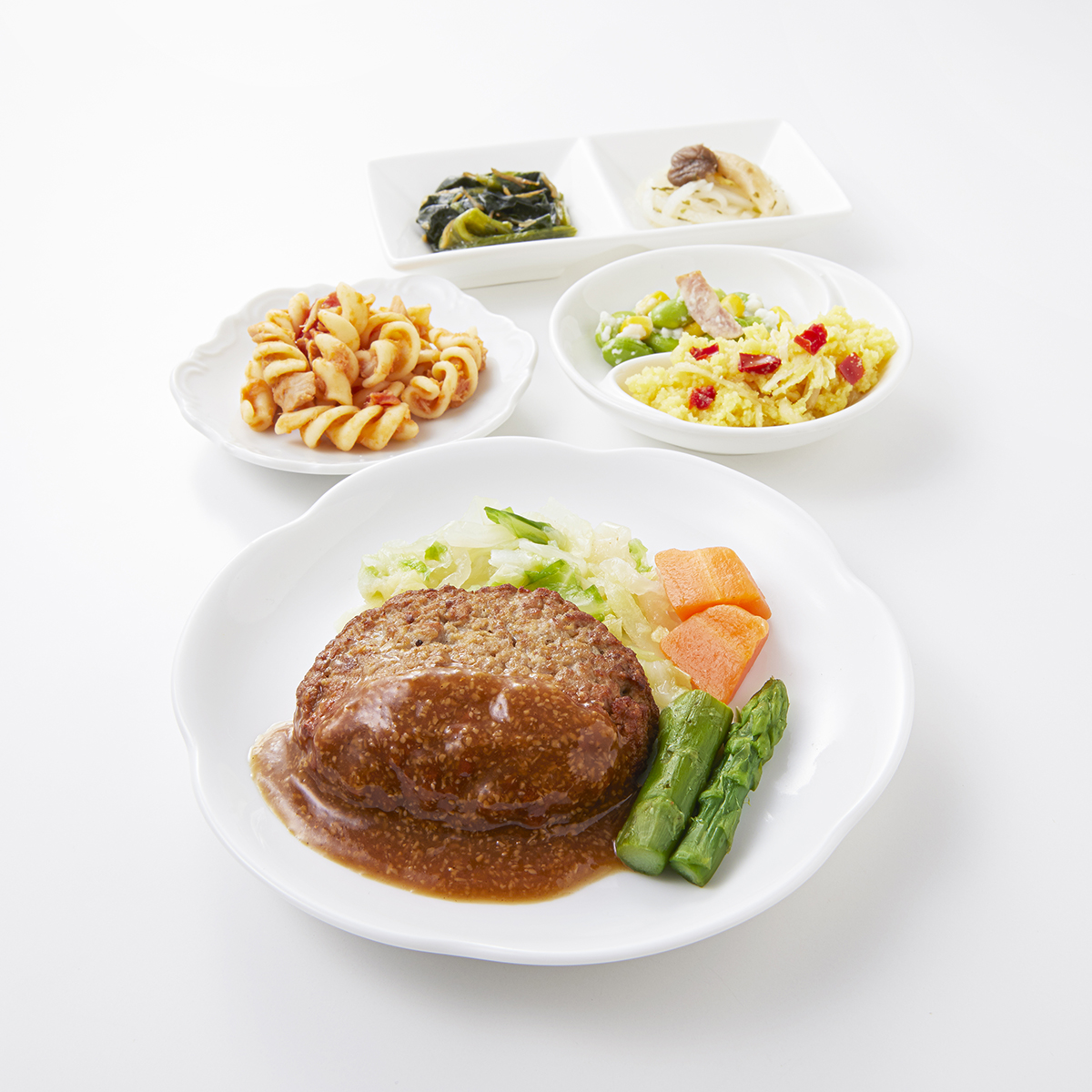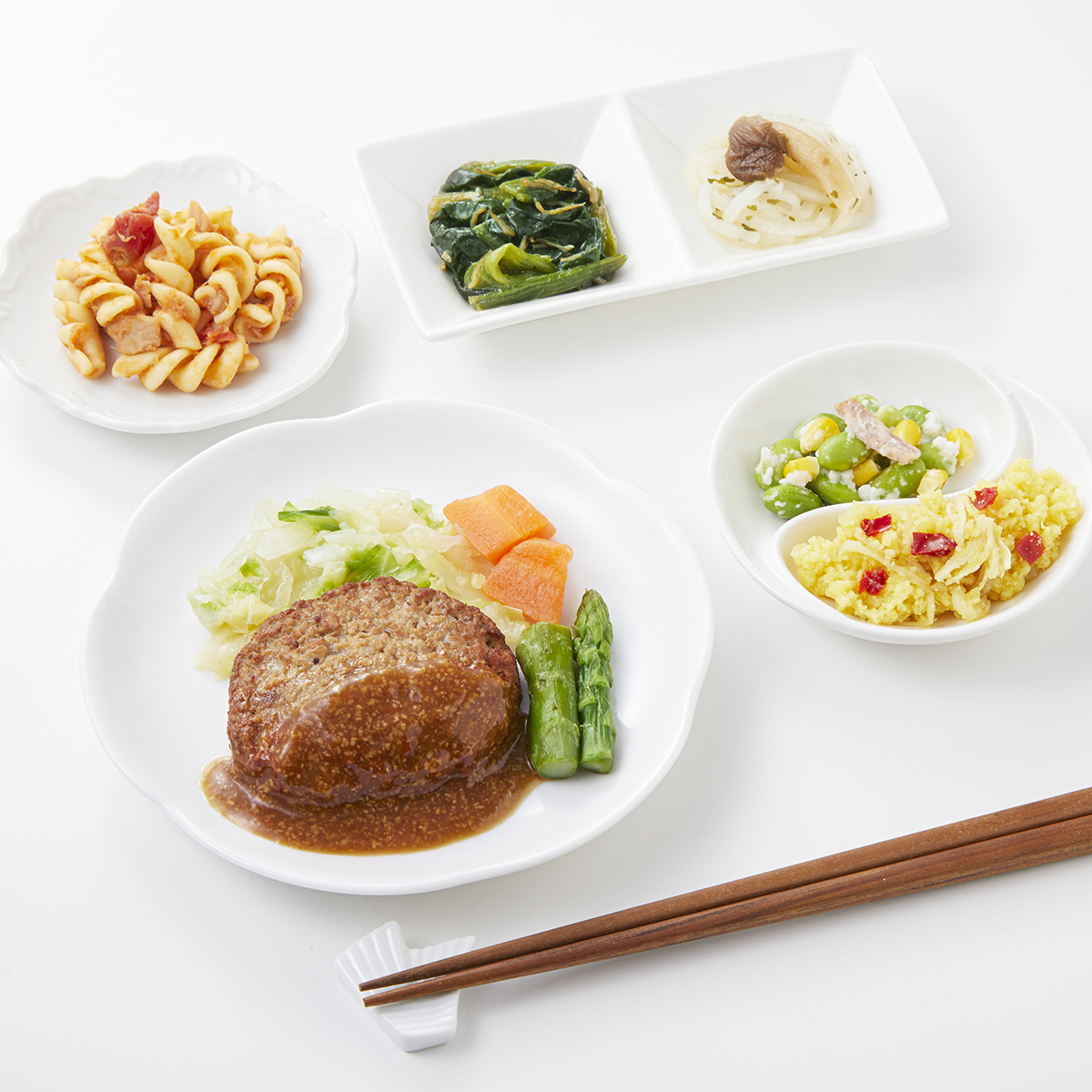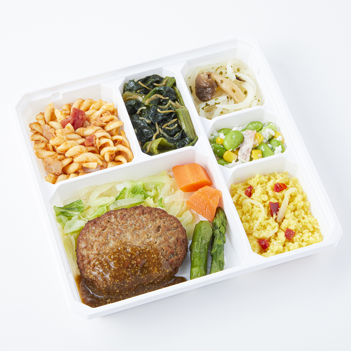 | 原材料名 | ハンバーグ(鶏肉、玉ねぎ、パン粉、粒状植物性たん白、植物油脂、その他)、キャベツ、ほうれん草、じゃがいも、玉ねぎ、枝豆、人参、グリーンアスパラガス、マカロニ、緑豆もやし、ひらたけ、トマト・ピューレー漬、ツナフレーク、赤ピーマン、蒸し鶏ほぐし身、減塩醤油、牛乳、乾燥おから、ケチャップ、砂糖、ホワイトソース、加工わさび、しらす干し、なたね油、コーン、ベーコン、レモンジュース、バターフレーバーオイル、白ワイン、大豆油、食塩、顆粒洋風だし、顆粒和風だし、カレー粉、ターメリックパウダー、パセリ粉、黒こしょう、にんにく、白こしょう/増粘剤(加工デンプン、増粘多糖類)、調味料(アミノ酸等)、酢酸Na、グリシン、リン酸塩(Na)、ソルビット、環状オリゴ糖、pH調整剤、香料、酸化防止剤(V.C)、着色料(クチナシ、紅麹、ラック、カロチノイド、コチニール)、香辛料、酸味料、乳化剤、V.C、発色剤(亜硝酸Na)、(一部に小麦・卵・乳成分・牛肉・大豆・鶏肉・豚肉を含む) | ||