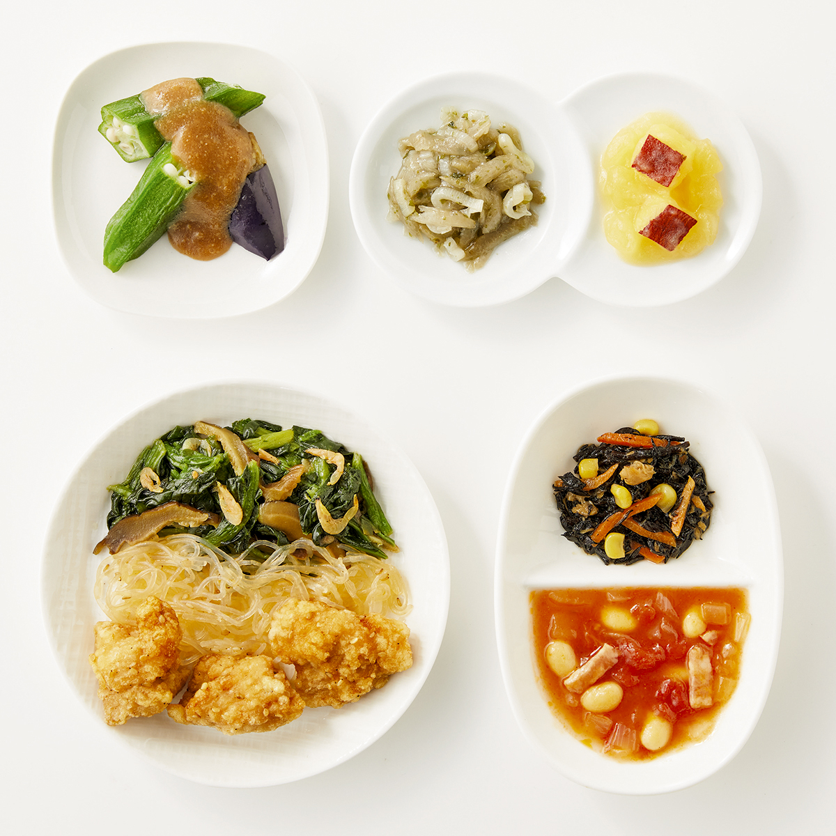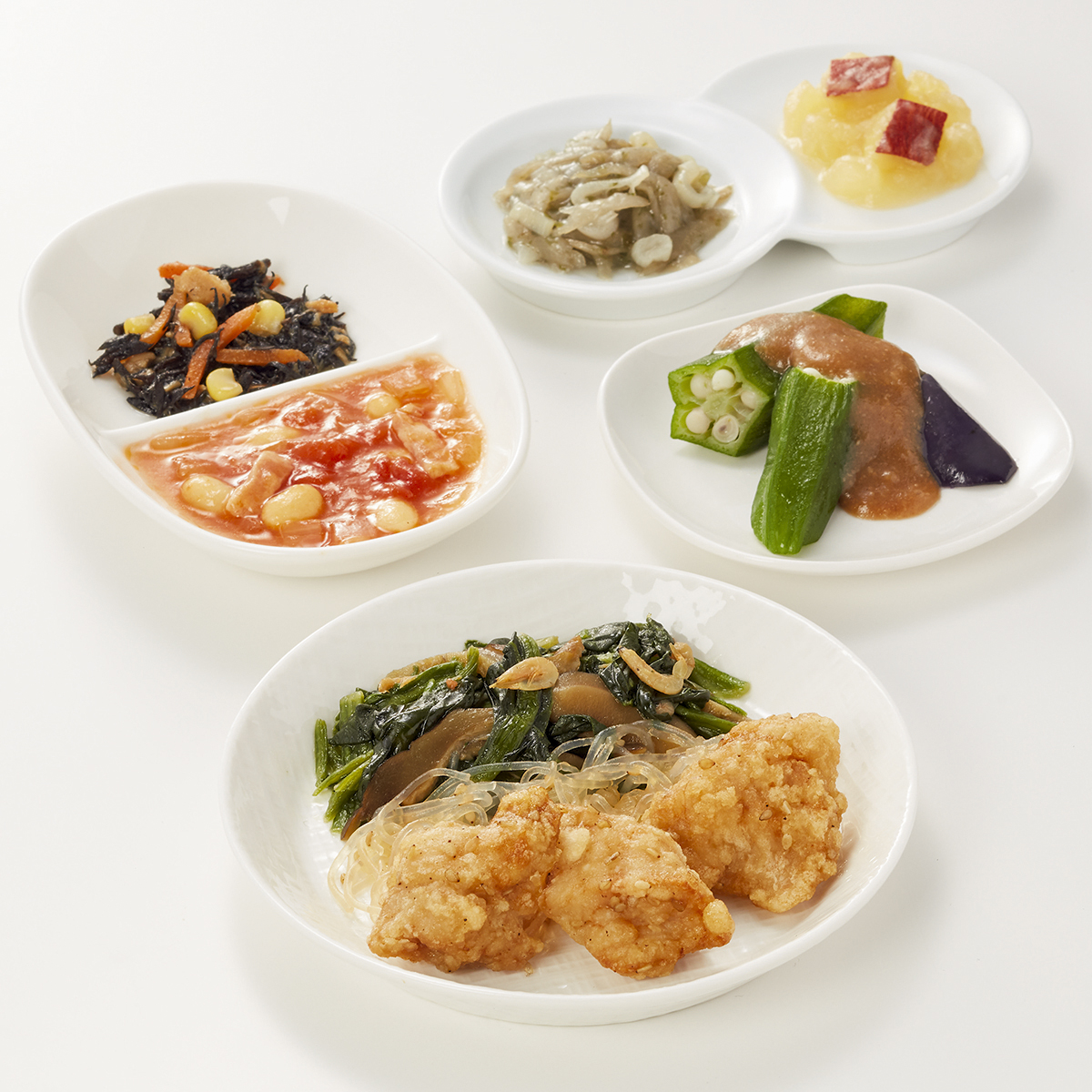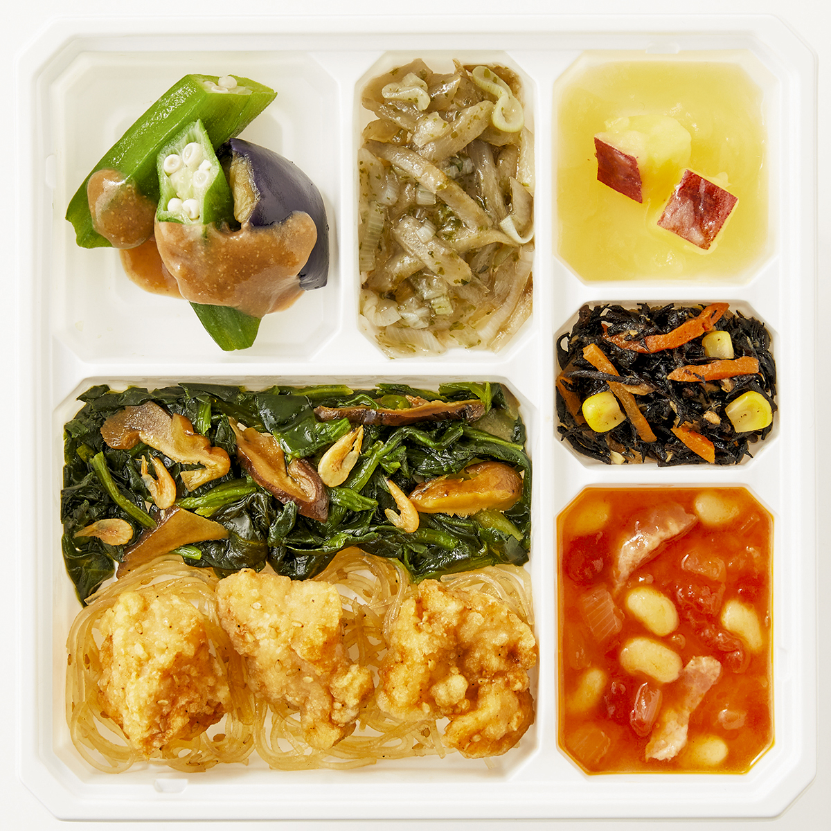 | 原材料名 | 鶏肉、ほうれん草、オクラ、なたね油、素揚げなす、玉ねぎ、トマト・ピューレー漬、さつまいも、ごぼう、ねぎ、でん粉、本みりん、砂糖、蒸し大豆、さつまいもフィリング、濃口醤油、ショルダーベーコン、春雨、りんごプレザーブ、還元水あめ、人参、ツナフレーク、味噌、和風調味液、コーン、乾燥しいたけ、ケチャップ、果実調味料、清酒、乾燥ひじき、りんごジュース、レモンジュース、乾燥小えび、煎り白ごま、食塩、すり白ごま、顆粒洋風だし、おろしにんにく、くるみペースト、顆粒和風だし、大豆油、あおさ粉、白こしょう、黒こしょう/増粘剤(加工デンプン、増粘多糖類)、調味料(アミノ酸等)、ソルビット、pH調整剤、リン酸塩(Na)、酸味料、酸化防止剤(V.C)、着色料(紅麹、カロチノイド、コチニール)、乳酸Ca、香料、発色剤(亜硝酸Na)、(一部に小麦・卵・乳成分・えび・牛肉・くるみ・ごま・大豆・鶏肉・豚肉・りんごを含む) | ||