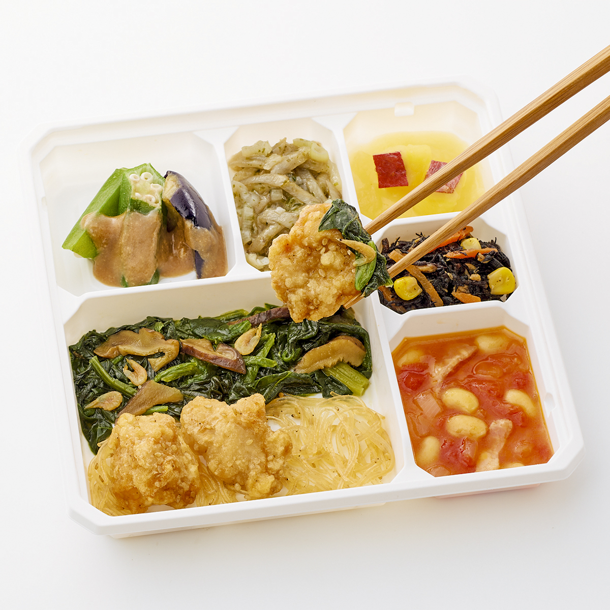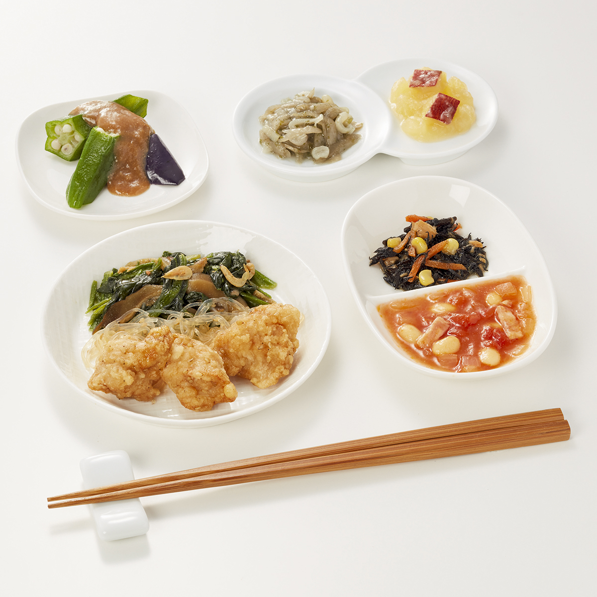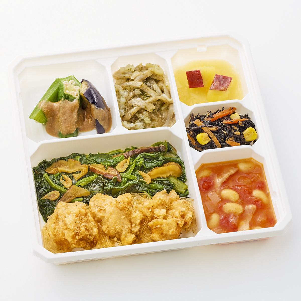 | 原材料名 | 鶏肉、ほうれん草、オクラ、なたね油、素揚げなす、玉ねぎ、トマト・ピューレー漬、さつまいも、ごぼう、ねぎ、でん粉、本みりん、砂糖、蒸し大豆、さつまいもフィリング、濃口醤油、ショルダーベーコン、春雨、りんごプレザーブ、還元水あめ、人参、ツナフレーク、味噌、和風調味液、コーン、乾燥しいたけ、ケチャップ、果実調味料、清酒、乾燥ひじき、りんごジュース、レモンジュース、乾燥小えび、煎り白ごま、食塩、すり白ごま、顆粒洋風だし、おろしにんにく、くるみペースト、顆粒和風だし、大豆油、あおさ粉、白こしょう、黒こしょう/増粘剤(加工デンプン、増粘多糖類)、調味料(アミノ酸等)、ソルビット、pH調整剤、リン酸塩(Na)、酸味料、酸化防止剤(V.C)、着色料(紅麹、カロチノイド、コチニール)、乳酸Ca、香料、発色剤(亜硝酸Na)、(一部に小麦・卵・乳成分・えび・牛肉・くるみ・ごま・大豆・鶏肉・豚肉・りんごを含む) | ||