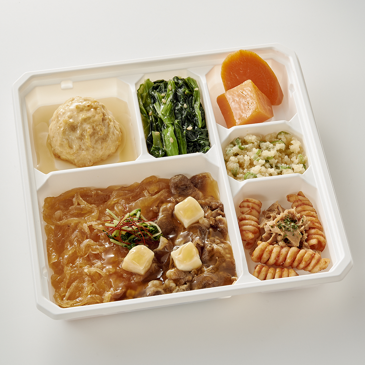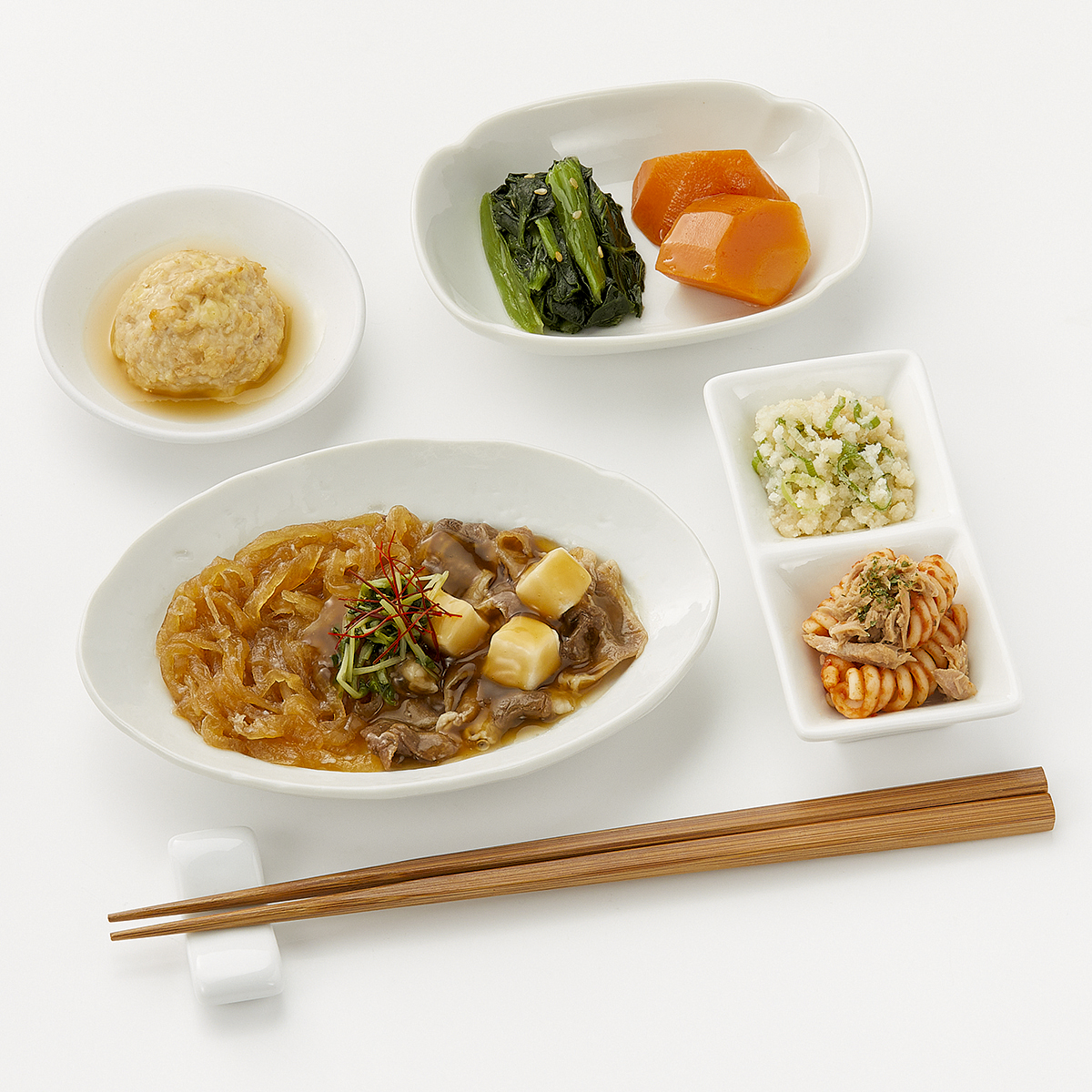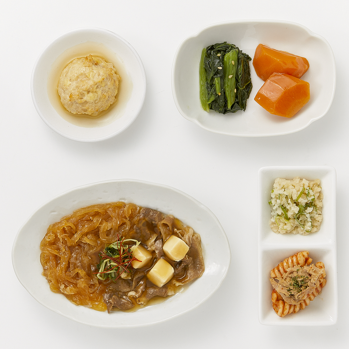 | 原材料名 | 玉ねぎ(日本産)、小松菜(中国産)、豆腐、牛肉(アメリカ産)、人参、鶏ひき肉、マカロニ、大豆加工品、ケチャップ、ツナフレーク、発酵調味料、醤油、砂糖、みりん風調味料、豆苗、おから、ねぎ、植物油、醤油だし、調合ごま油、天ぷら粉、しょうが、唐辛子、パセリ、粉末調味料、食塩、ごま、塩こしょう/糊料(加工でん粉)、調味料(アミノ酸等)、凝固剤、膨脹剤、乳酸Ca、酸化防止剤(V.C)、pH調整剤、酸味料、乳化剤、着色料(カロチノイド)、香料、酒精、(一部に小麦・卵・乳成分・牛肉・ごま・さば・ゼラチン・大豆・鶏肉・豚肉を含む) | ||