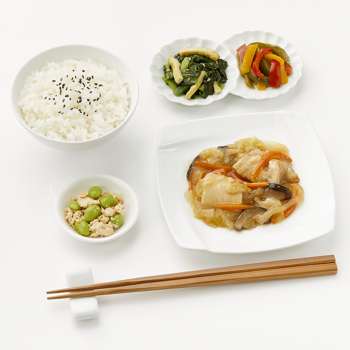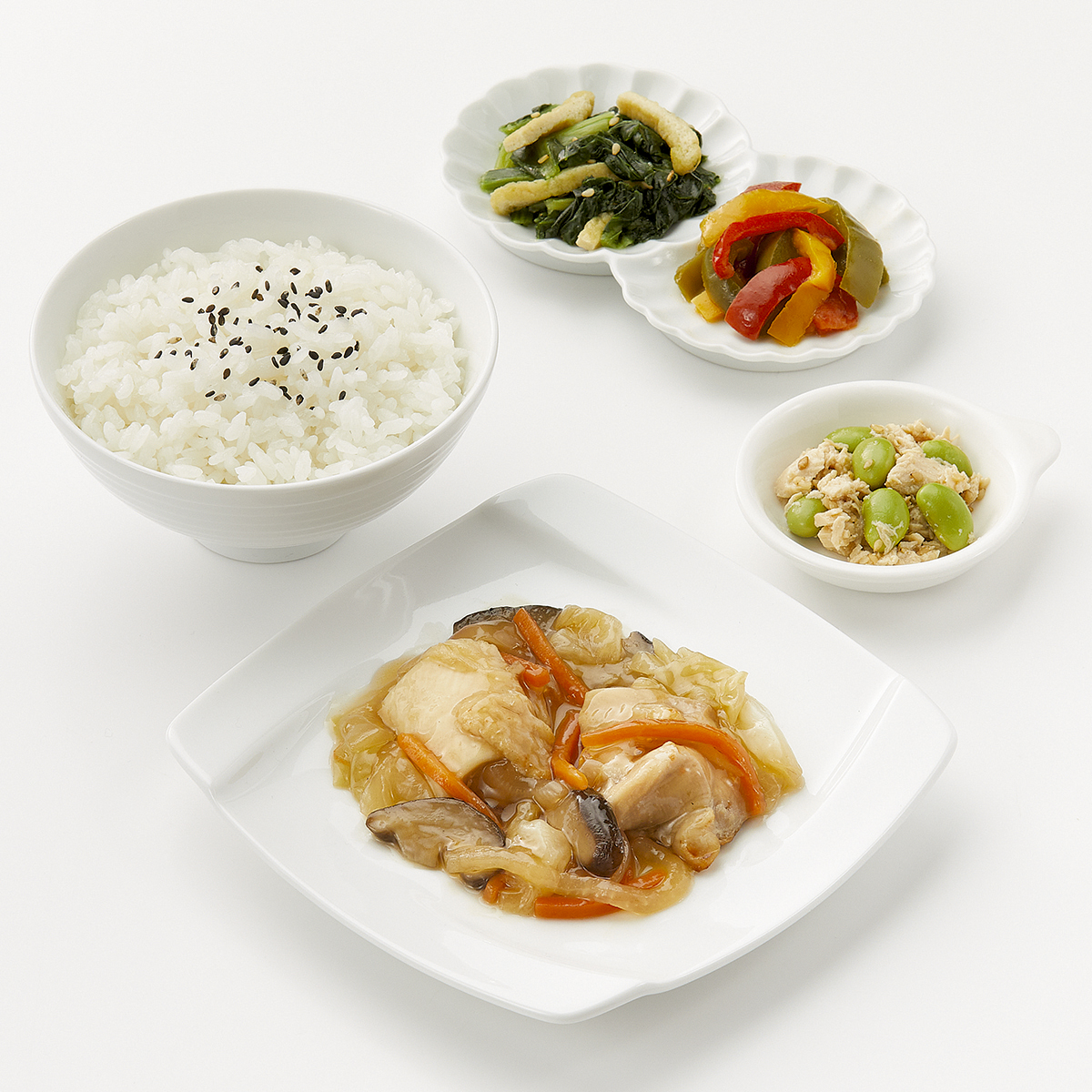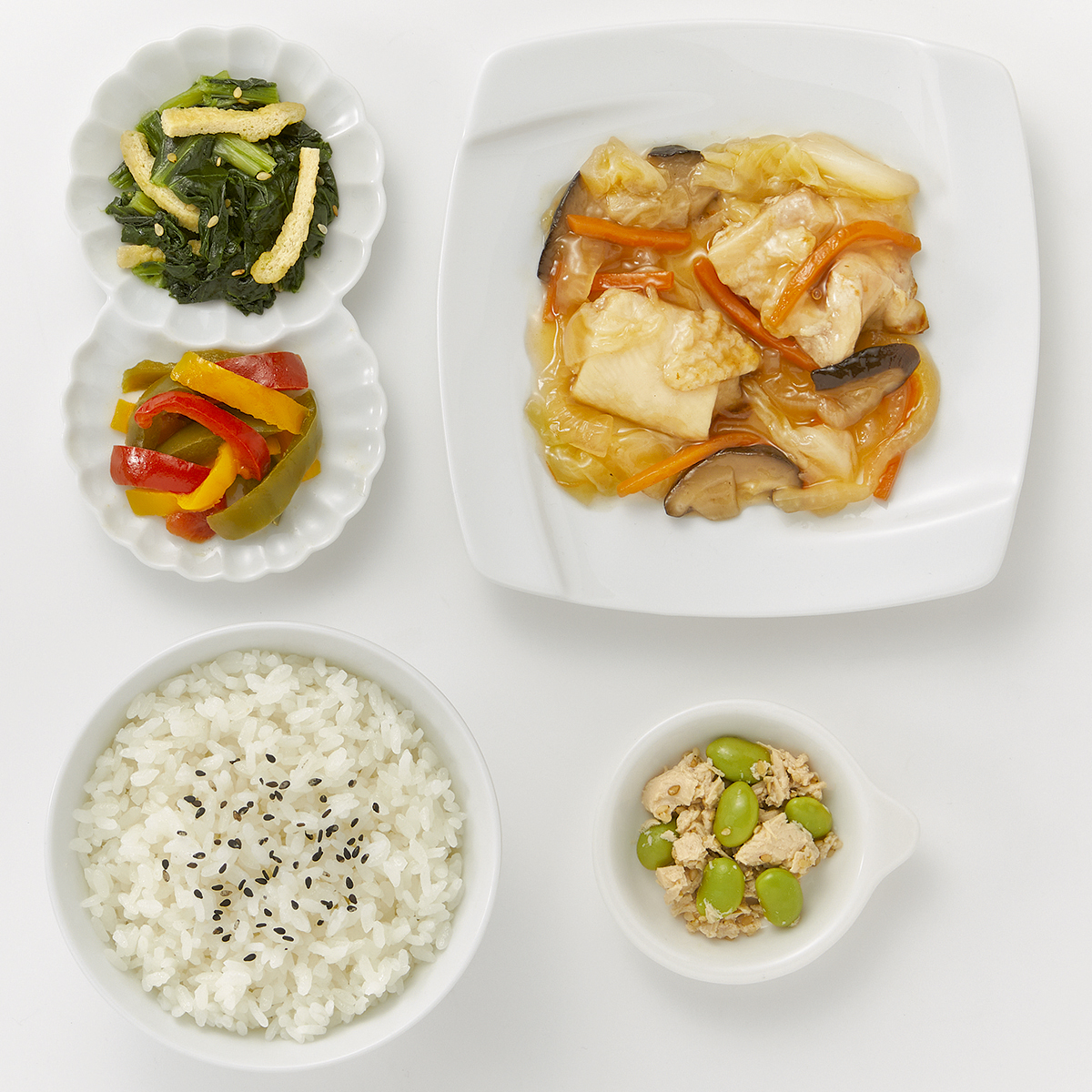| 原材料名 | 雑穀ごはん(米、米粒麦)、鶏肉、小松菜、ピーマン、蒸し鶏、黄ピーマン、赤ピーマン、キャベツ、玉ねぎ、人参、つゆ、油揚げ、しいたけ、むき枝豆、植物油、清酒風調味料、ポン酢醤油、ごま、おろしにんにく、白だし、醤油、みりん、刻みしょうが、かつお節調味料、黒ごま、ゼラチン、食塩/増粘剤(加工デンプン)、調味料(アミノ酸等)、加工デンプン、pH調整剤、酸味料、酸化防止剤(V.C)、香料、(一部に小麦・ごま・さば・大豆・鶏肉・ゼラチンを含む) | ||