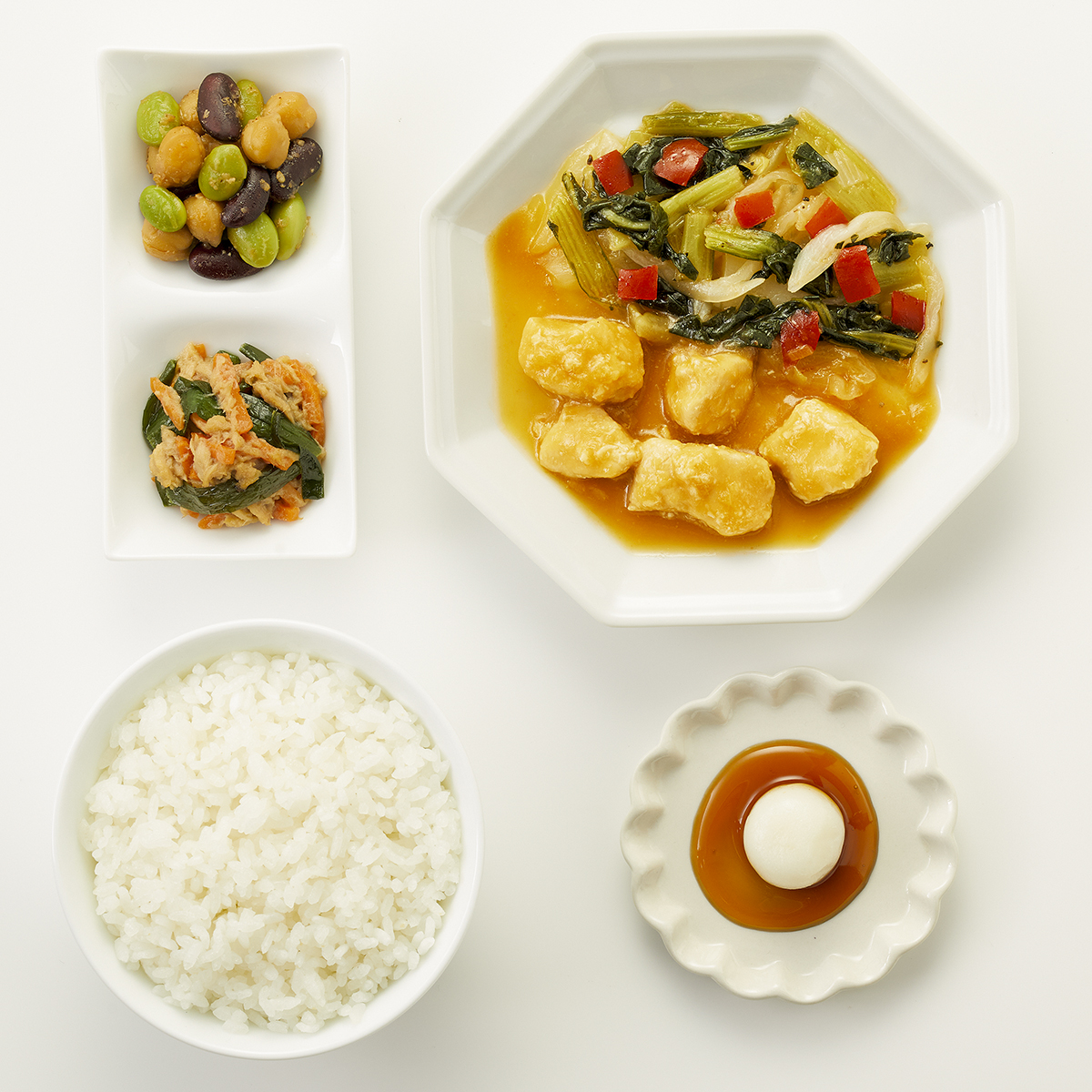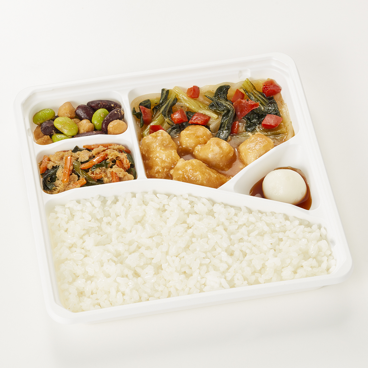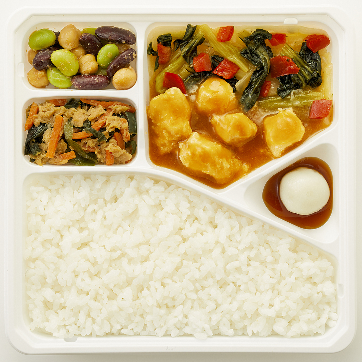 | 原材料名 | 雑穀ごはん(米、米粒麦)、鶏肉、キャベツ、チンゲン菜、玉ねぎ、白玉、ツナフレーク、赤ピーマン、むき枝豆、ゆでひよこ豆、照焼だれ、植物油、人参、赤いんげん豆水煮、味噌だれ、にら、清酒風調味料、醤油、砂糖、みりん、刻みしょうが、ごま、おろしにんにく、食塩、黒こしょう/加工デンプン、増粘剤(加工デンプン、キサンタン)、調味料(アミノ酸等)、カロチノイド色素、酵素、酸化防止剤(V.C)、pH調整剤、(一部に小麦・ごま・さば・大豆・鶏肉・りんごを含む)※ハチミツが含まれています。1歳未満の乳児には与えないでください。 | ||