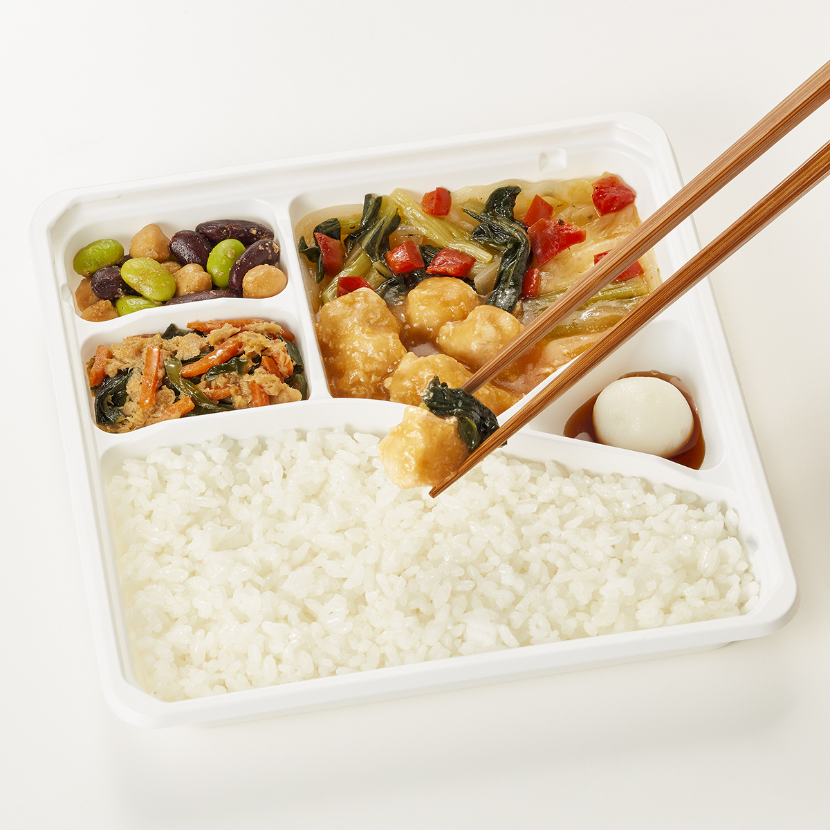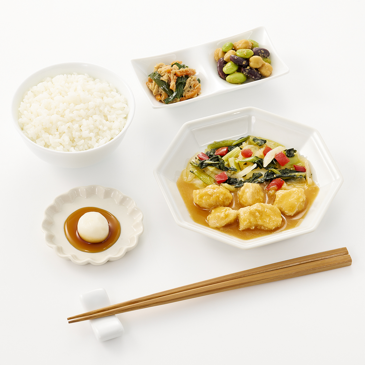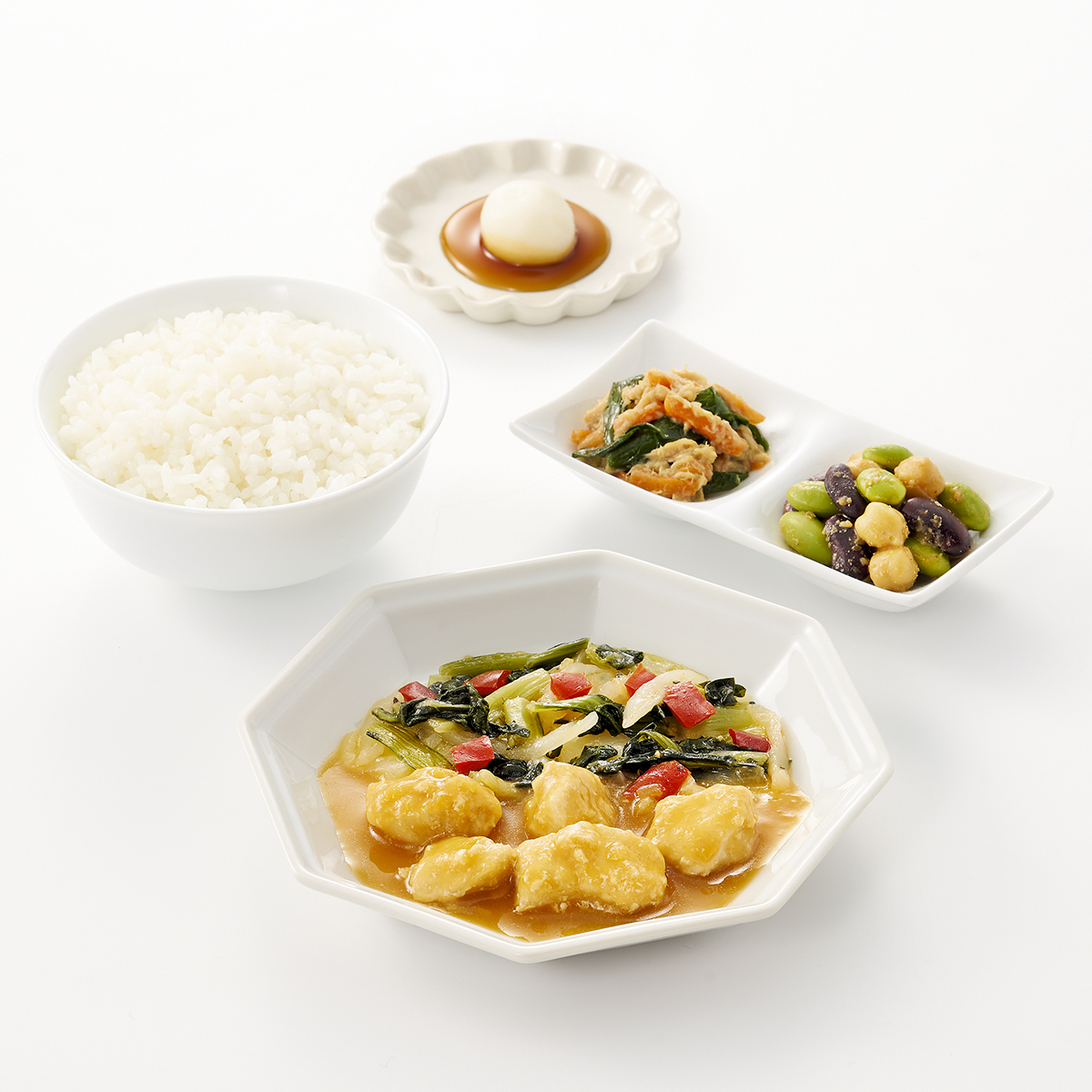 | 原材料名 | 雑穀ごはん(米、米粒麦)、鶏肉、キャベツ、チンゲン菜、玉ねぎ、白玉、ツナフレーク、赤ピーマン、むき枝豆、ゆでひよこ豆、照焼だれ、植物油、人参、赤いんげん豆水煮、味噌だれ、にら、清酒風調味料、醤油、砂糖、みりん、刻みしょうが、ごま、おろしにんにく、食塩、黒こしょう/加工デンプン、増粘剤(加工デンプン、キサンタン)、調味料(アミノ酸等)、カロチノイド色素、酵素、酸化防止剤(V.C)、pH調整剤、(一部に小麦・ごま・さば・大豆・鶏肉・りんごを含む)※ハチミツが含まれています。1歳未満の乳児には与えないでください。 | ||
