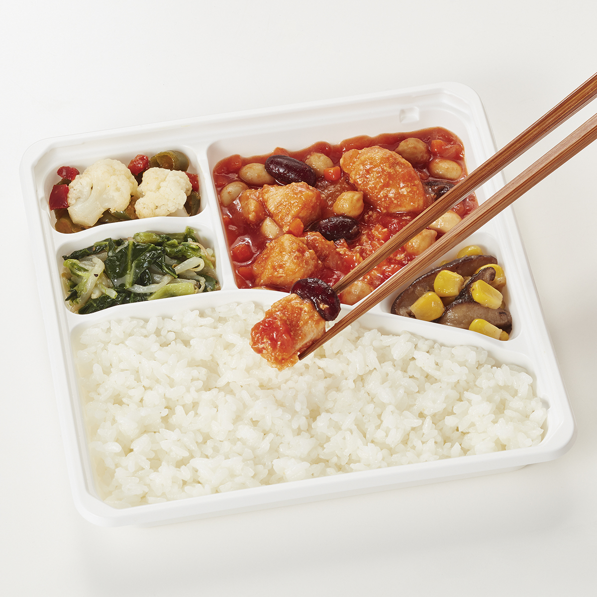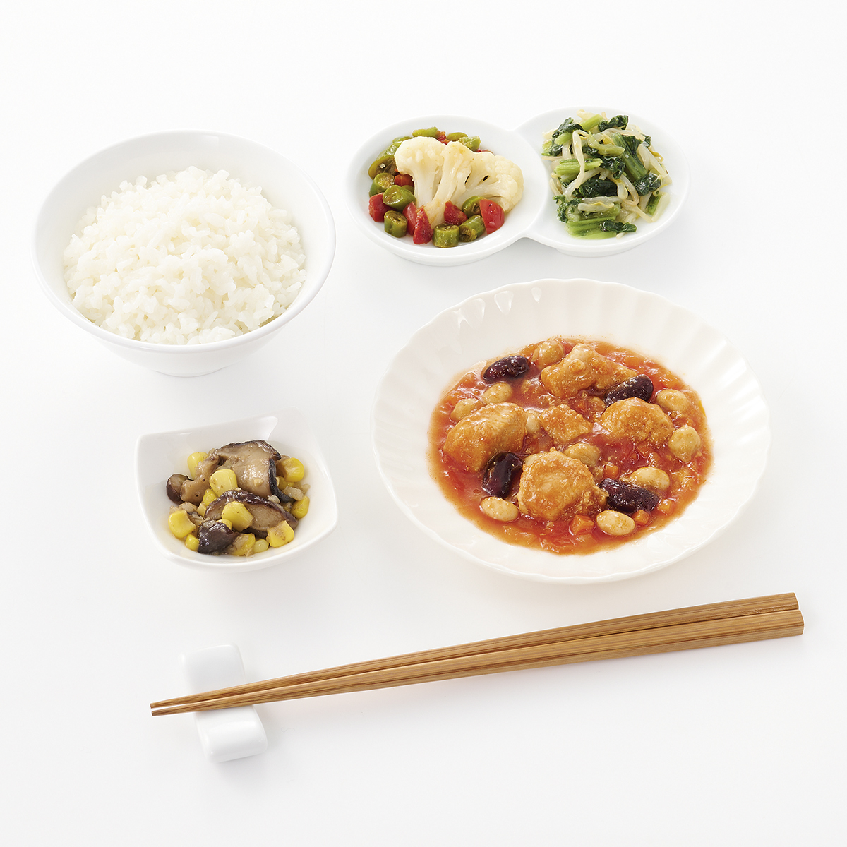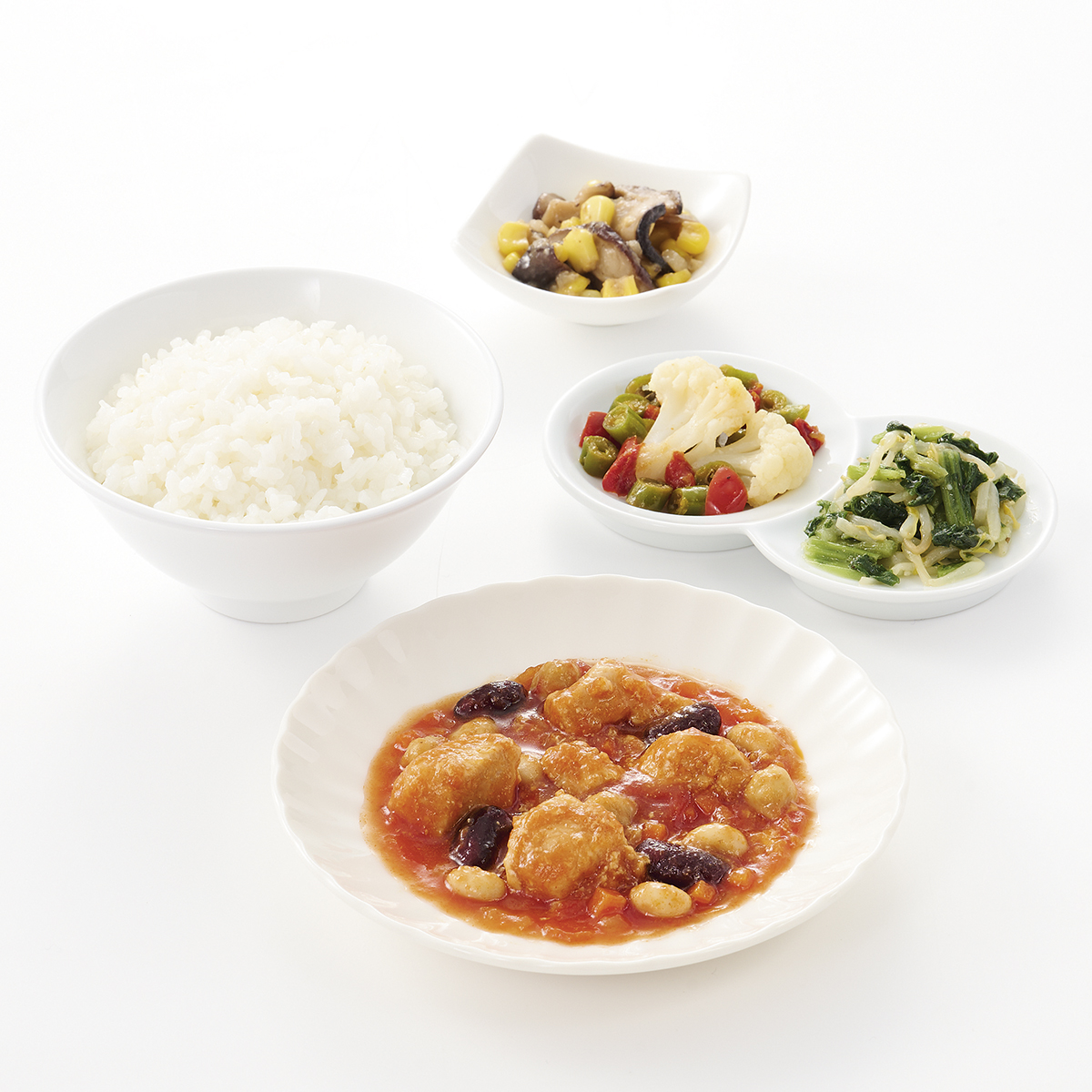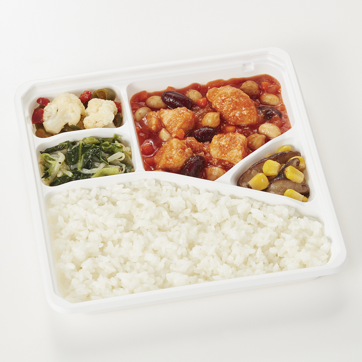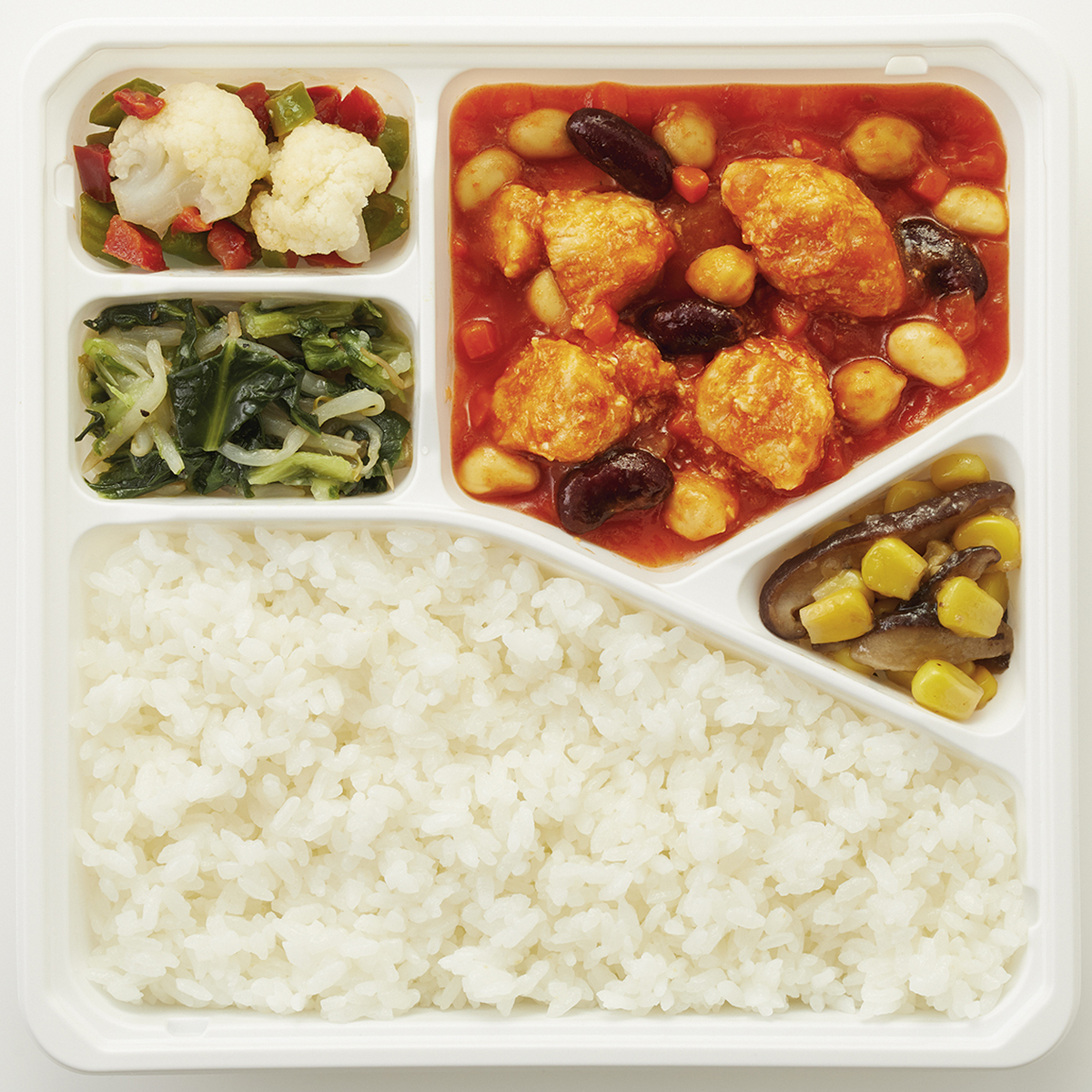 | 原材料名 | 米、鶏肉、小松菜、しいたけ、緑豆もやし、ケチャップ、トマト加工品、カリフラワー、コーン、いんげん、植物油、赤ピーマン、大豆水煮、ゆでひよこ豆、赤いんげん豆水煮、玉ねぎ、人参、コンソメ、オリーブ油、バターソース、砂糖、おろしにんにく、食塩、黒こしょう、カレー粉/加工デンプン、増粘剤(加工デンプン、増粘多糖類)、調味料(アミノ酸等)、pH調整剤、着色料(カラメル、クチナシ)、塩化Ca、酸味料、香料、乳化剤、(一部に小麦・乳成分・牛肉・大豆・鶏肉を含む) | ||