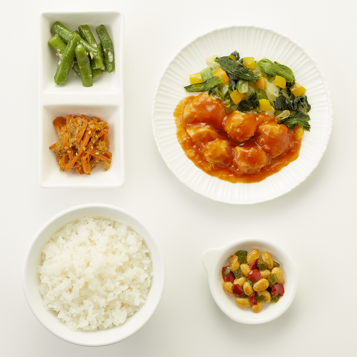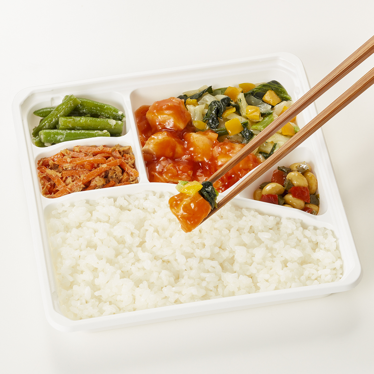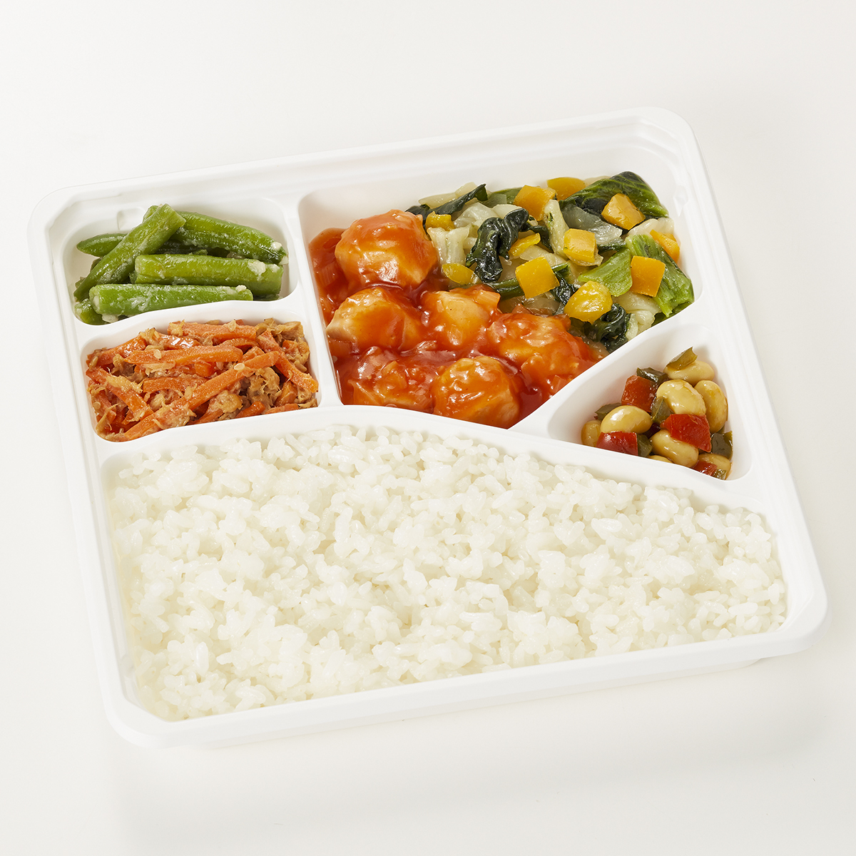 | 原材料名 | 米、鶏肉、いんげん、キャベツ、チンゲン菜、人参、ツナフレーク、植物油、ケチャップ、黄ピーマン、大豆水煮、赤ピーマン、ピーマン、照焼だれ、醤油、ねぎ、清酒風調味料、にんにく加工品、鶏がら調味料、砂糖、ごま、刻みしょうが、オイスターソース、トウバンジャン、こしょう/加工デンプン、増粘剤(加工デンプン、キサンタン)、調味料(アミノ酸等)、pH調整剤、塩化Ca、カロチノイド色素、酸化防止剤(V.C)、(一部に小麦・ごま・さば・大豆・鶏肉・りんごを含む) | ||