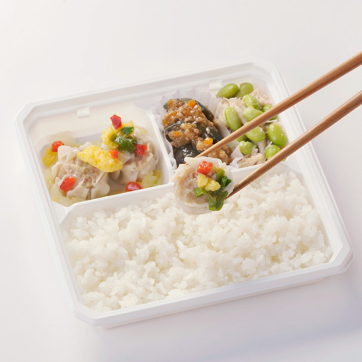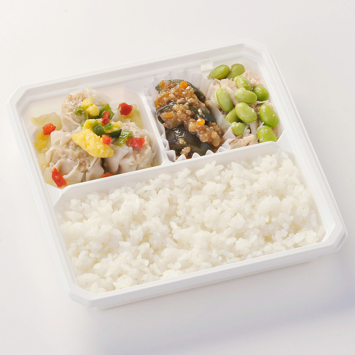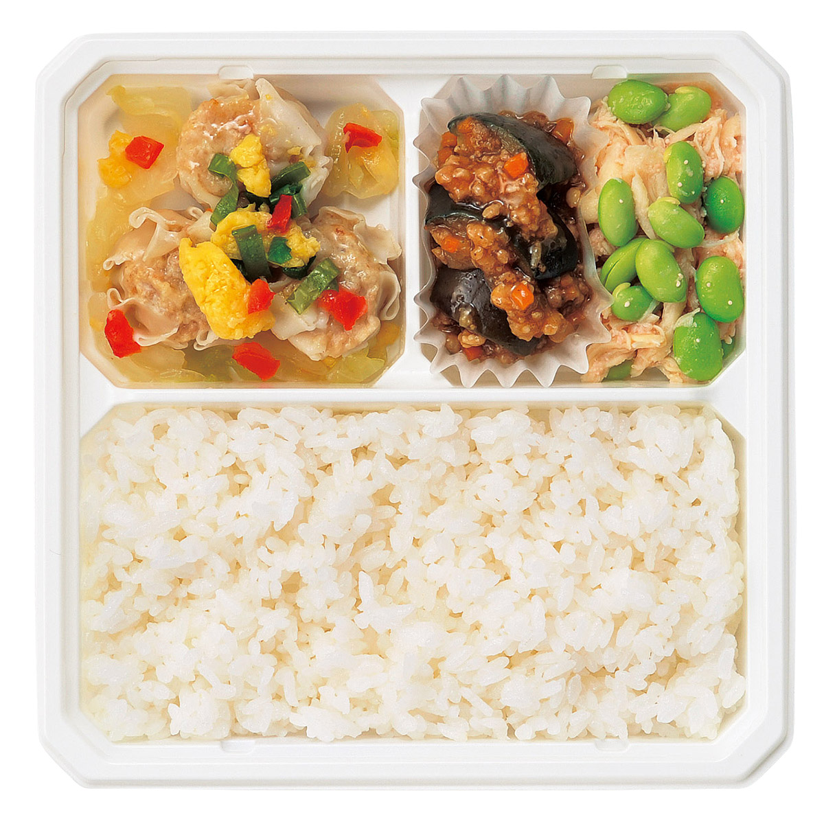 | 原材料名 | ご飯(国産米)、焼売、蒸し鶏ほぐし身、素揚げなす、枝豆、キャベツ、豚肉、ねぎ、炒り卵、なたね油、赤ピーマン、たらこ、牛乳、ホワイトソース、人参、玉ねぎ、中華スープの素、清酒、オイスターソース、砂糖、テンメンジャン、減塩醤油、しょうが、にんにく、豆板醤、顆粒和風だし、食塩、白こしょう、黒こしょう、山椒/増粘剤(加工デンプン、キサンタン)、調味料(アミノ酸等)、加工デンプン、酸化防止剤(V.C)、ポリリン酸Na、酢酸Na、着色料(紅麹、ラック)、マンニット、グリシン、香料、pH調整剤、(一部に小麦・卵・乳成分・牛肉・ごま・大豆・鶏肉・豚肉・ゼラチンを含む) | ||
