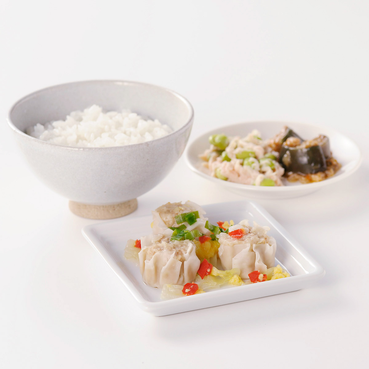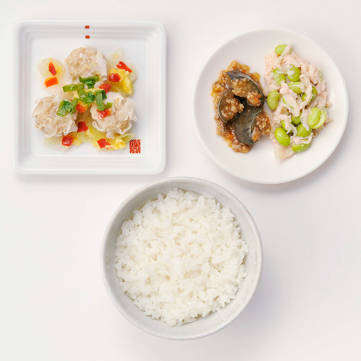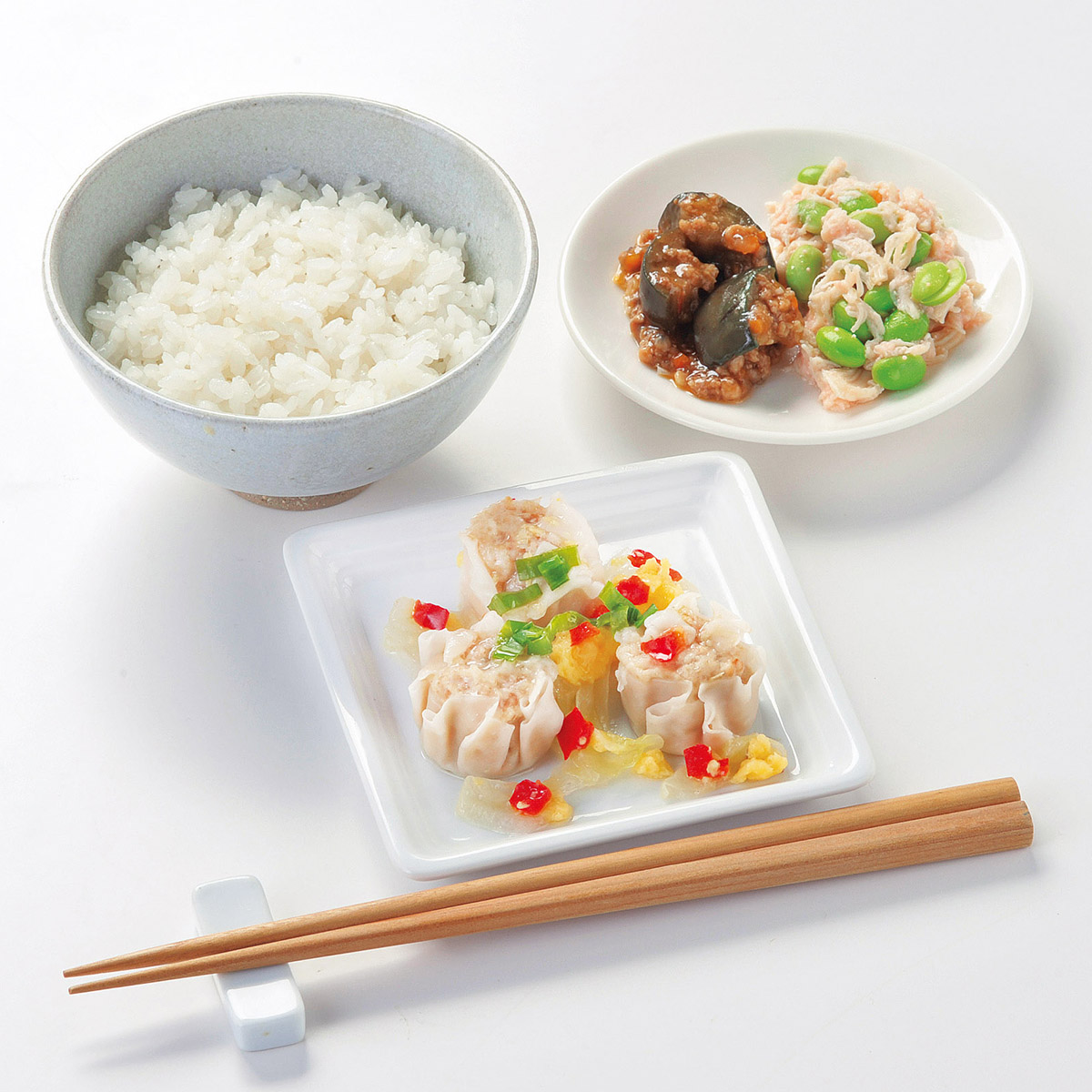 | 原材料名 | ご飯(国産米)、焼売、蒸し鶏ほぐし身、素揚げなす、枝豆、キャベツ、豚肉、ねぎ、炒り卵、なたね油、赤ピーマン、たらこ、牛乳、ホワイトソース、人参、玉ねぎ、中華スープの素、清酒、オイスターソース、砂糖、テンメンジャン、減塩醤油、しょうが、にんにく、豆板醤、顆粒和風だし、食塩、白こしょう、黒こしょう、山椒/増粘剤(加工デンプン、キサンタン)、調味料(アミノ酸等)、加工デンプン、酸化防止剤(V.C)、ポリリン酸Na、酢酸Na、着色料(紅麹、ラック)、マンニット、グリシン、香料、pH調整剤、(一部に小麦・卵・乳成分・牛肉・ごま・大豆・鶏肉・豚肉・ゼラチンを含む) | ||