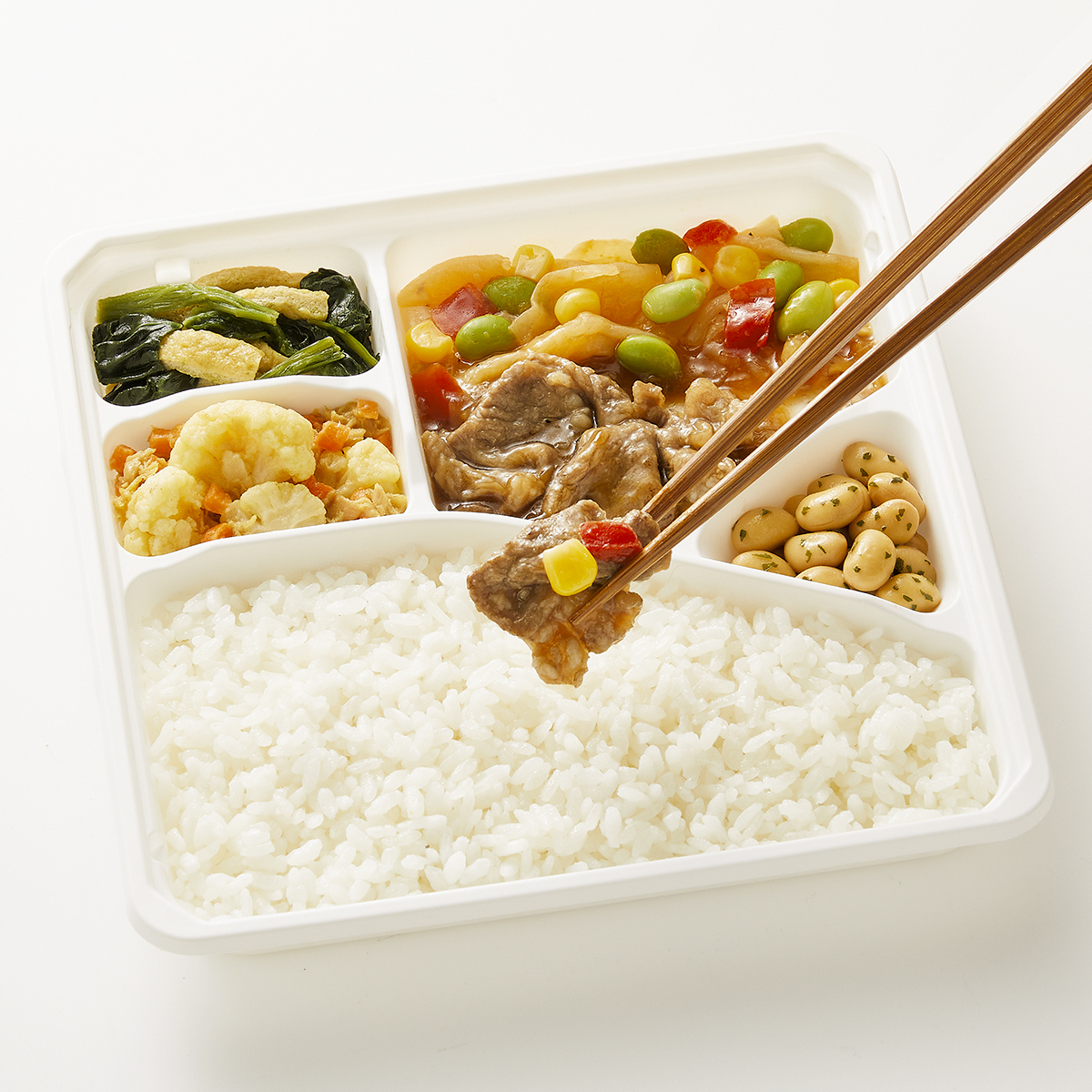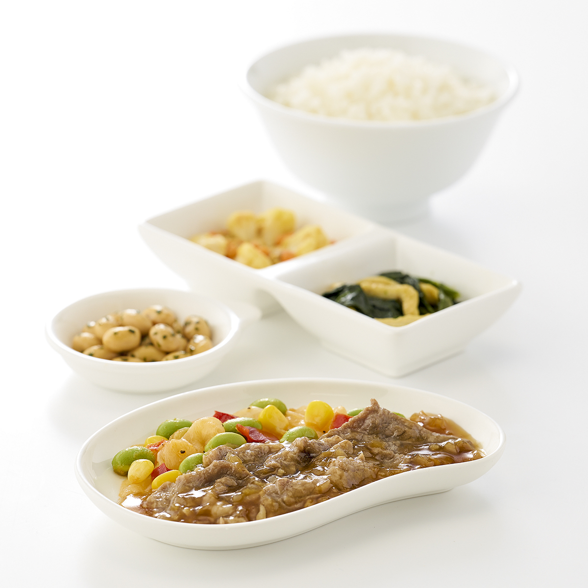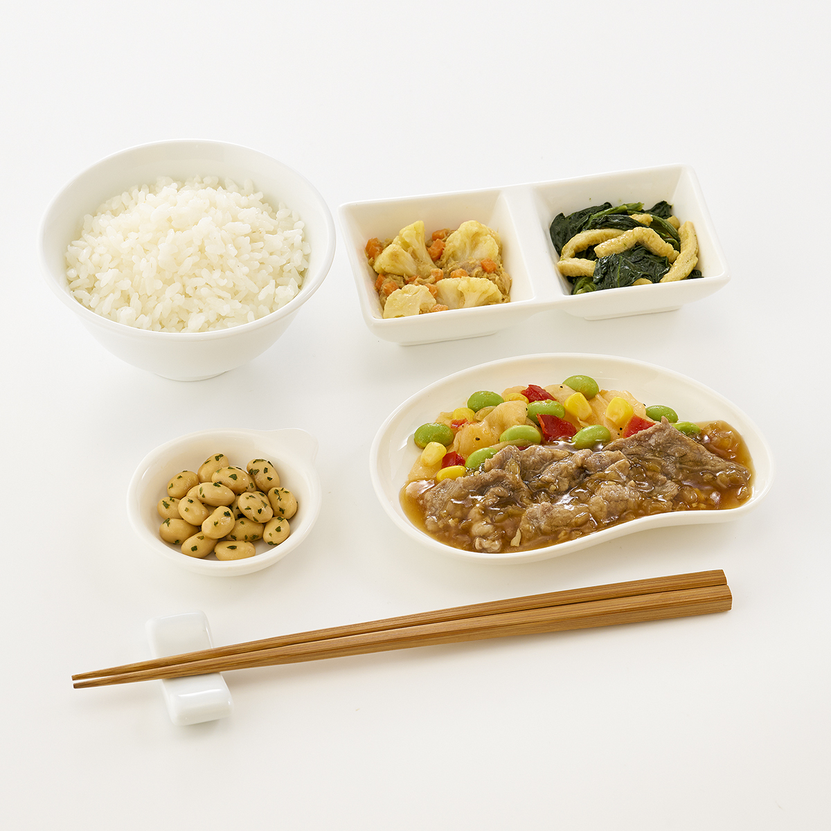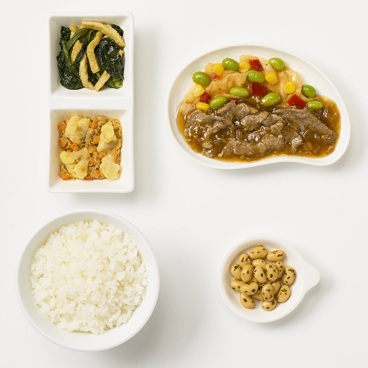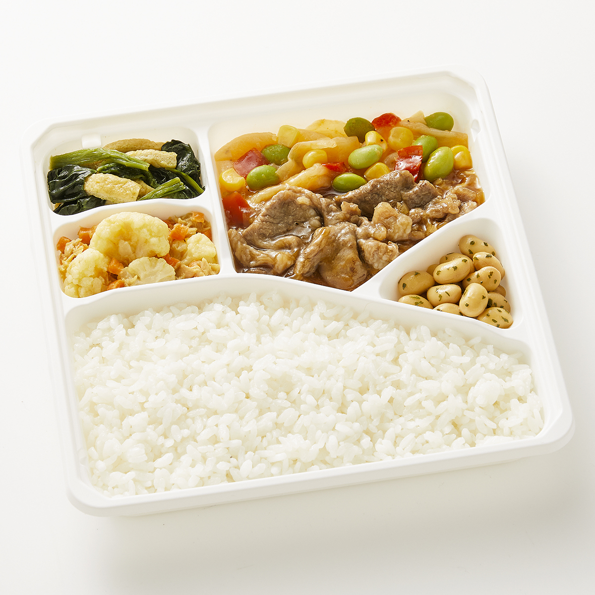 | 原材料名 | 米、牛肉、キャベツ、大豆水煮、カリフラワー、ほうれん草、むき枝豆、醤油、ツナフレーク、油揚げ、玉ねぎ、オニオンソテー、植物油、人参、コーン、赤ピーマン、みりん、清酒風調味料、にんにく加工品、バターソース、ゼラチン、砂糖、コンソメ、カレー粉、パセリ、黒こしょう/増粘剤(加工デンプン、増粘多糖類)、加工デンプン、調味料(アミノ酸等)、pH調整剤、塩化Ca、着色料(カラメル、クチナシ)、酸味料、香料、乳化剤、(一部に小麦・乳成分・牛肉・大豆・鶏肉・ゼラチンを含む) | ||