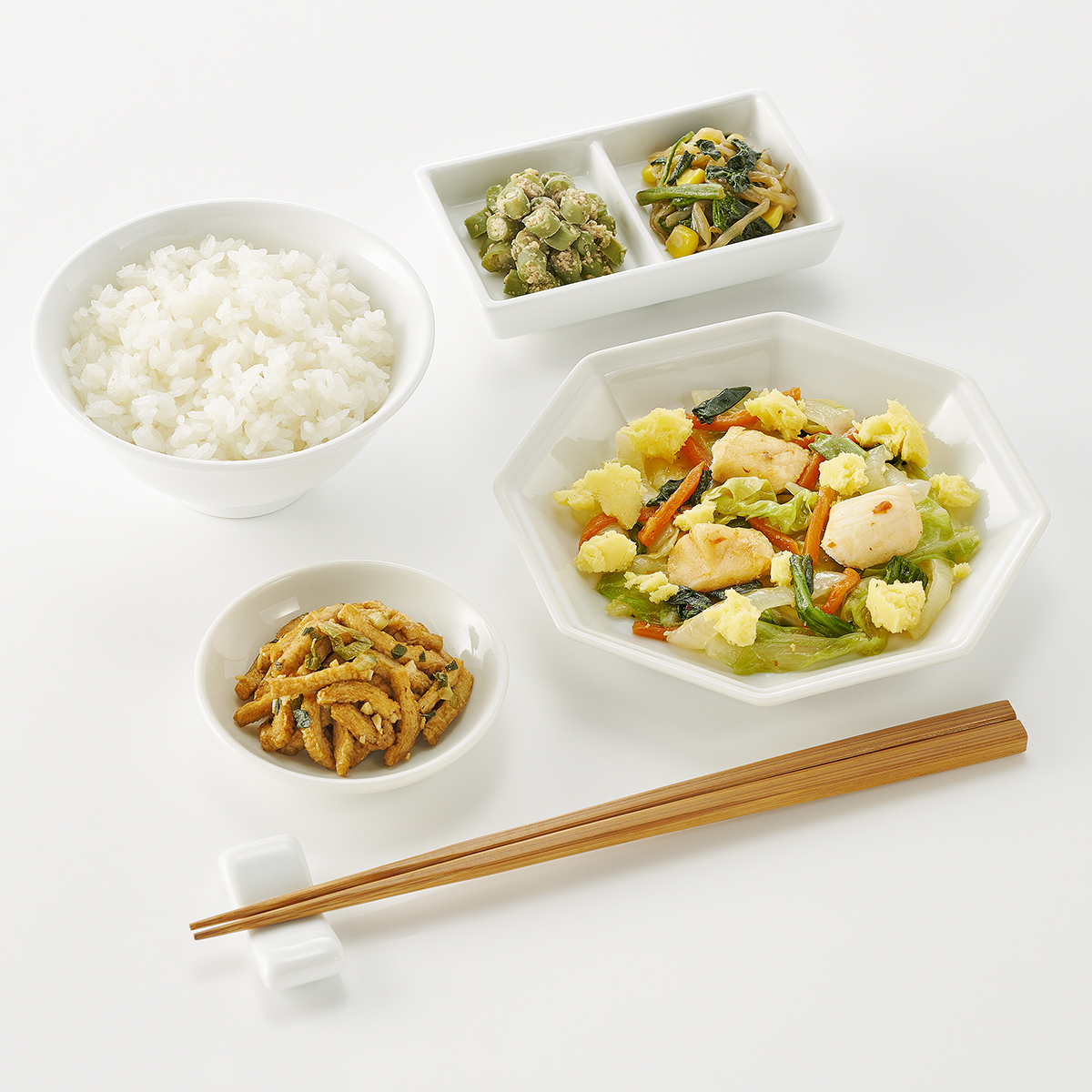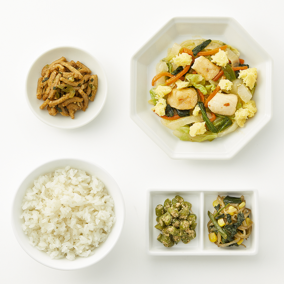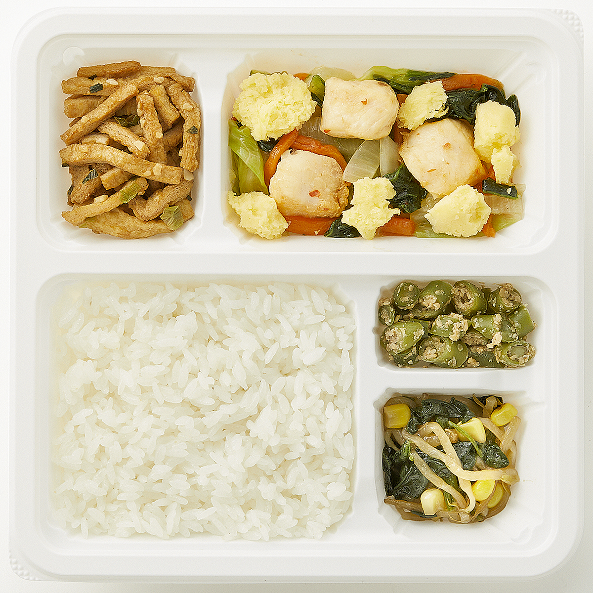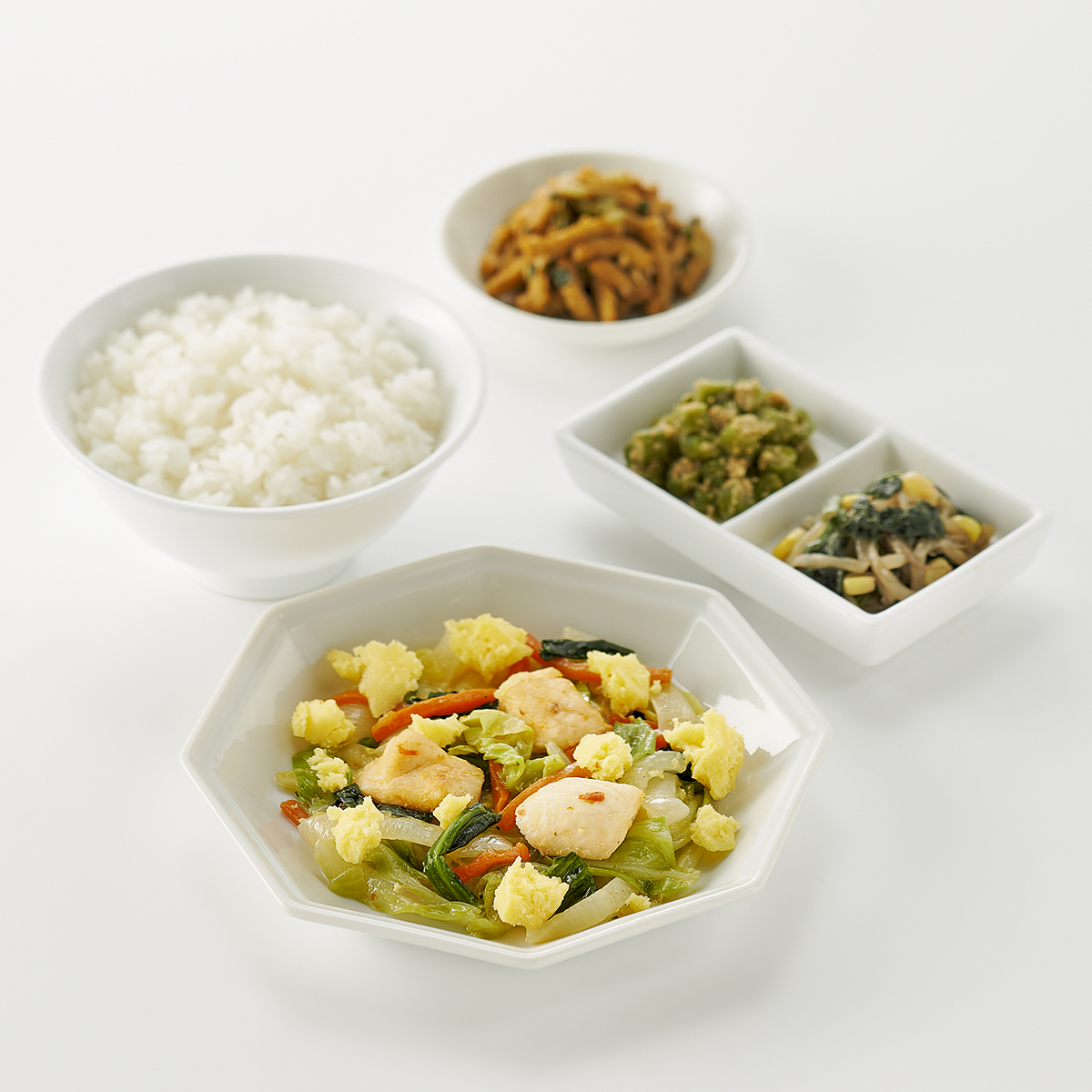 | 原材料名 | 米、キャベツ、鶏肉、油揚げ、緑豆もやし、いんげん、チンゲン菜、玉ねぎ、炒り卵、人参、清酒風調味料、ほうれん草、植物油、ねぎ、コーン、鶏がら調味料、ポン酢醤油、ごま、テンメンジャン、醤油、刻みにんにく、オイスターソース、トウバンジャン、砂糖、食塩/加工デンプン、調味料(アミノ酸等)、pH調整剤、酸味料、増粘剤(加工デンプン、キサンタン)、香料、酸化防止剤(V.C)、(一部に小麦・卵・ごま・大豆・鶏肉を含む) | ||