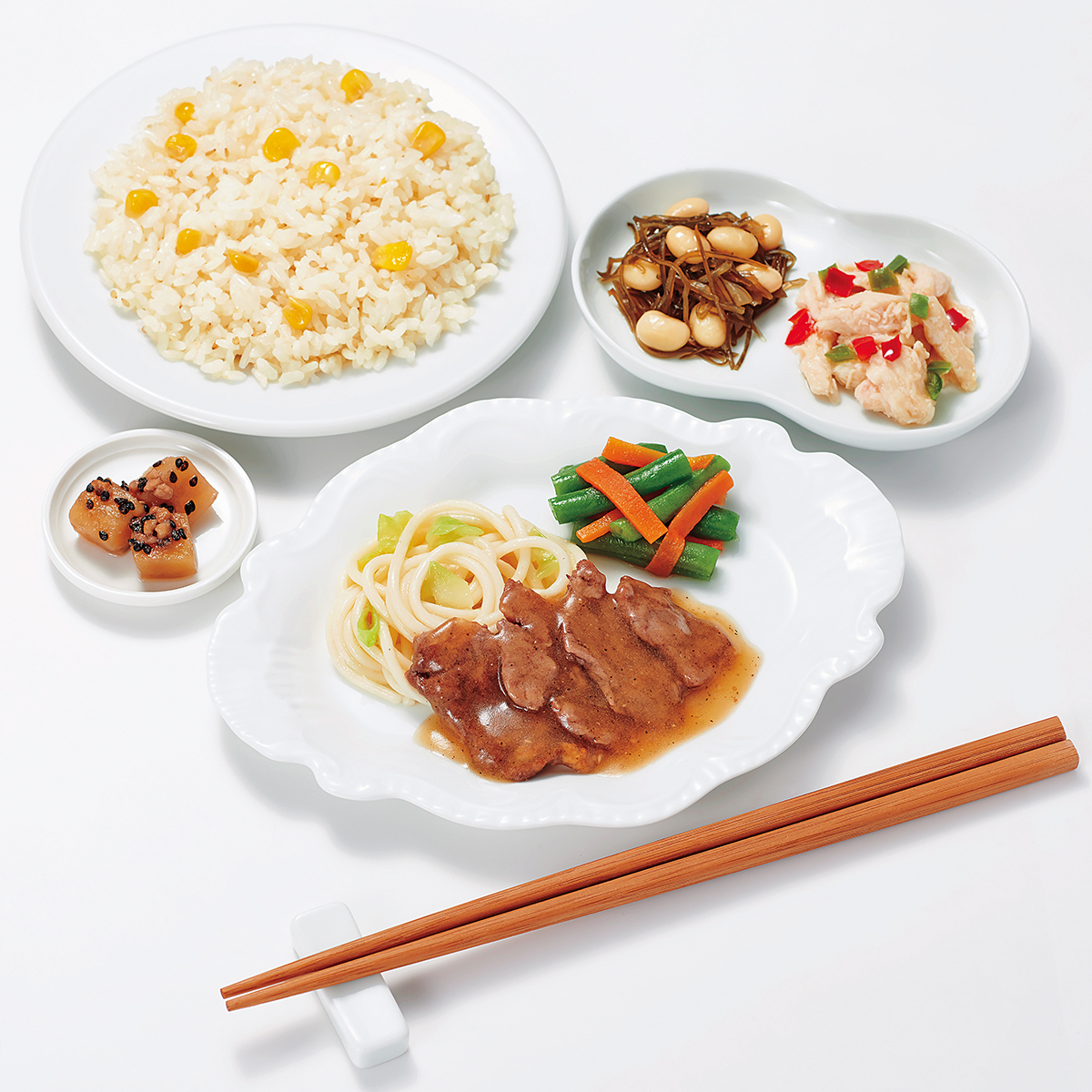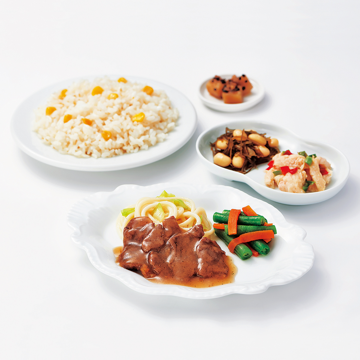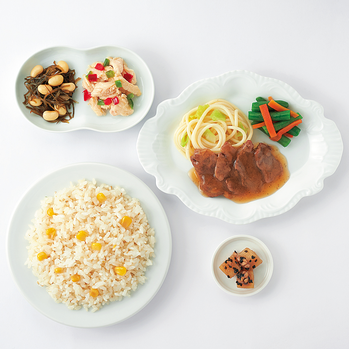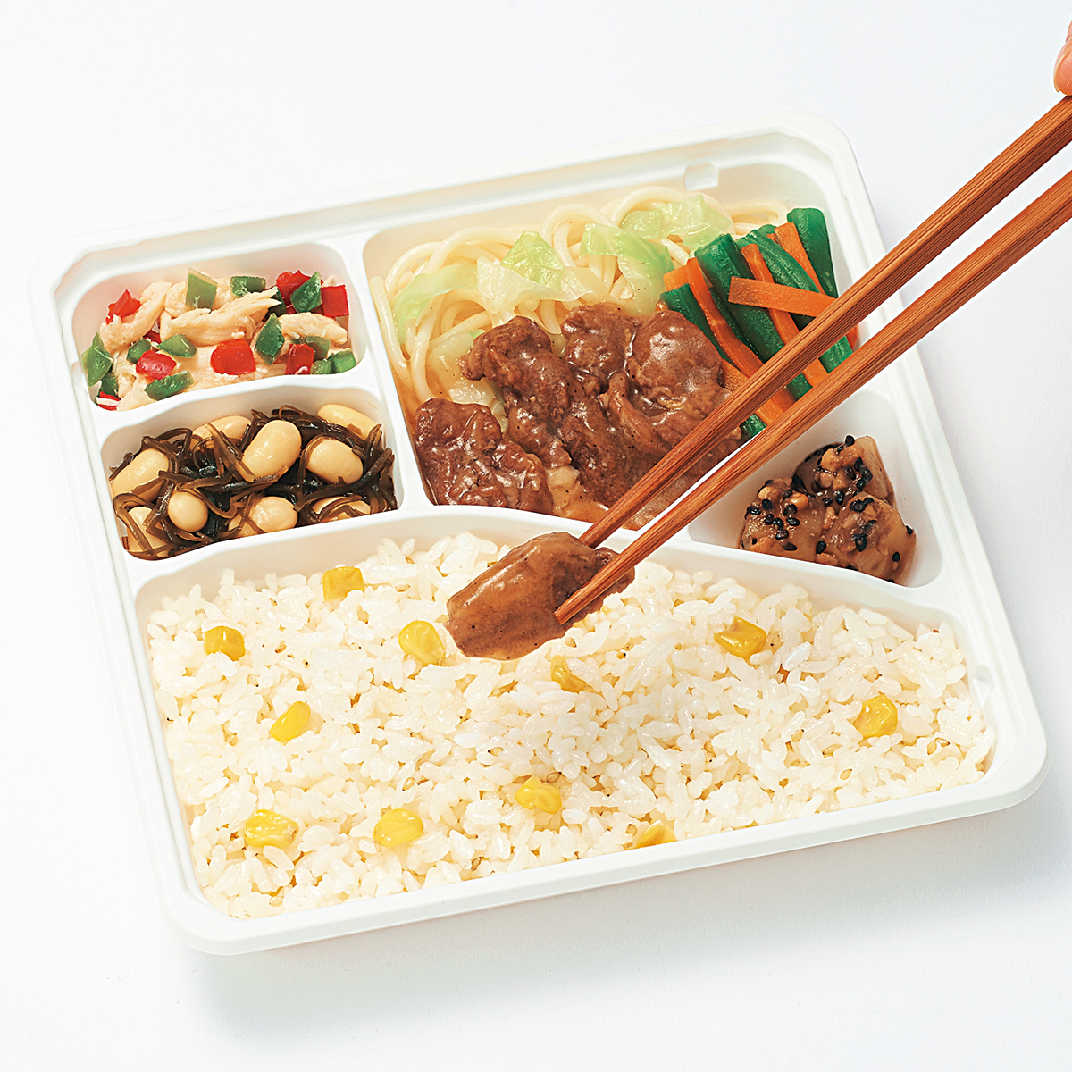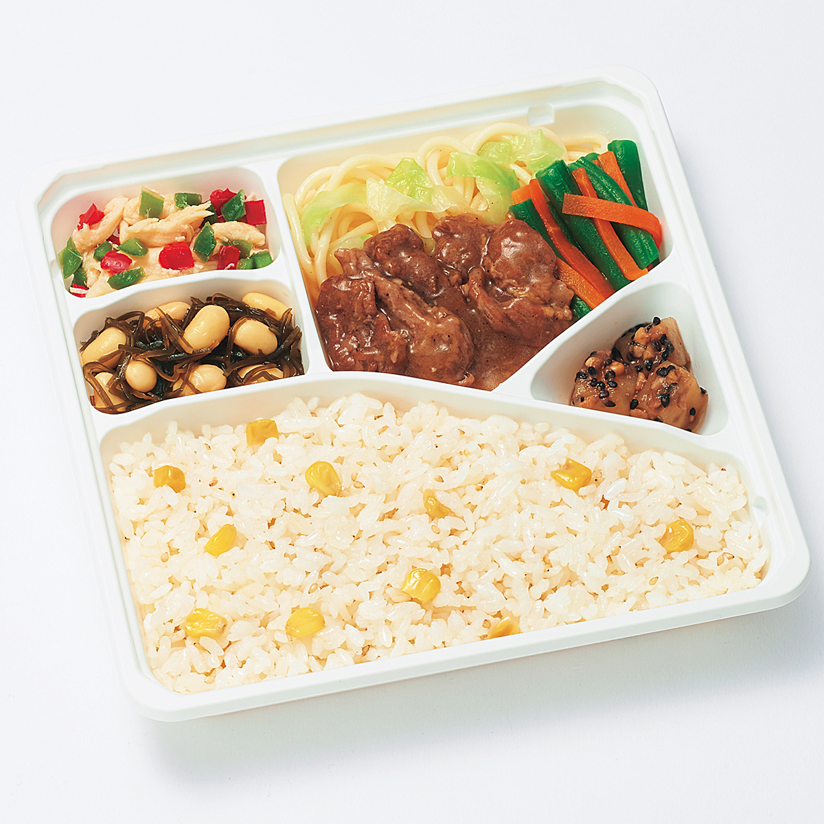 | 原材料名 | ご飯(国産米)、牛肉、コーン、蒸し鶏ほぐし身、じゃがいも、サヤインゲン、キャベツ、スパゲティ、大豆、人参、赤ピーマン、緑ピーマン、ショートニング、濃口醤油、かつお・昆布だし、本みりん、なたね油、上白糖、煎り白ごま、バターフレーバーオイル、乾燥切り昆布、食塩、味噌、バター、果実調味料、煎り黒ごま、和風調味液、顆粒和風だし、調合油(なたね油、ごま油)、くるみ、顆粒洋風だし、おろしにんにく、清酒、黒こしょう、白こしょう/増粘剤(加工デンプン)、調味料(アミノ酸等)、乳化剤、pH調整剤、酸化防止剤(V.C)、ポリリン酸Na、香料、マンニット、酸味料、着色料(カロチノイド、カラメル)、(一部に小麦・乳成分・牛肉・くるみ・ごま・さば・大豆・鶏肉・魚醤(魚介類)を含む) | ||