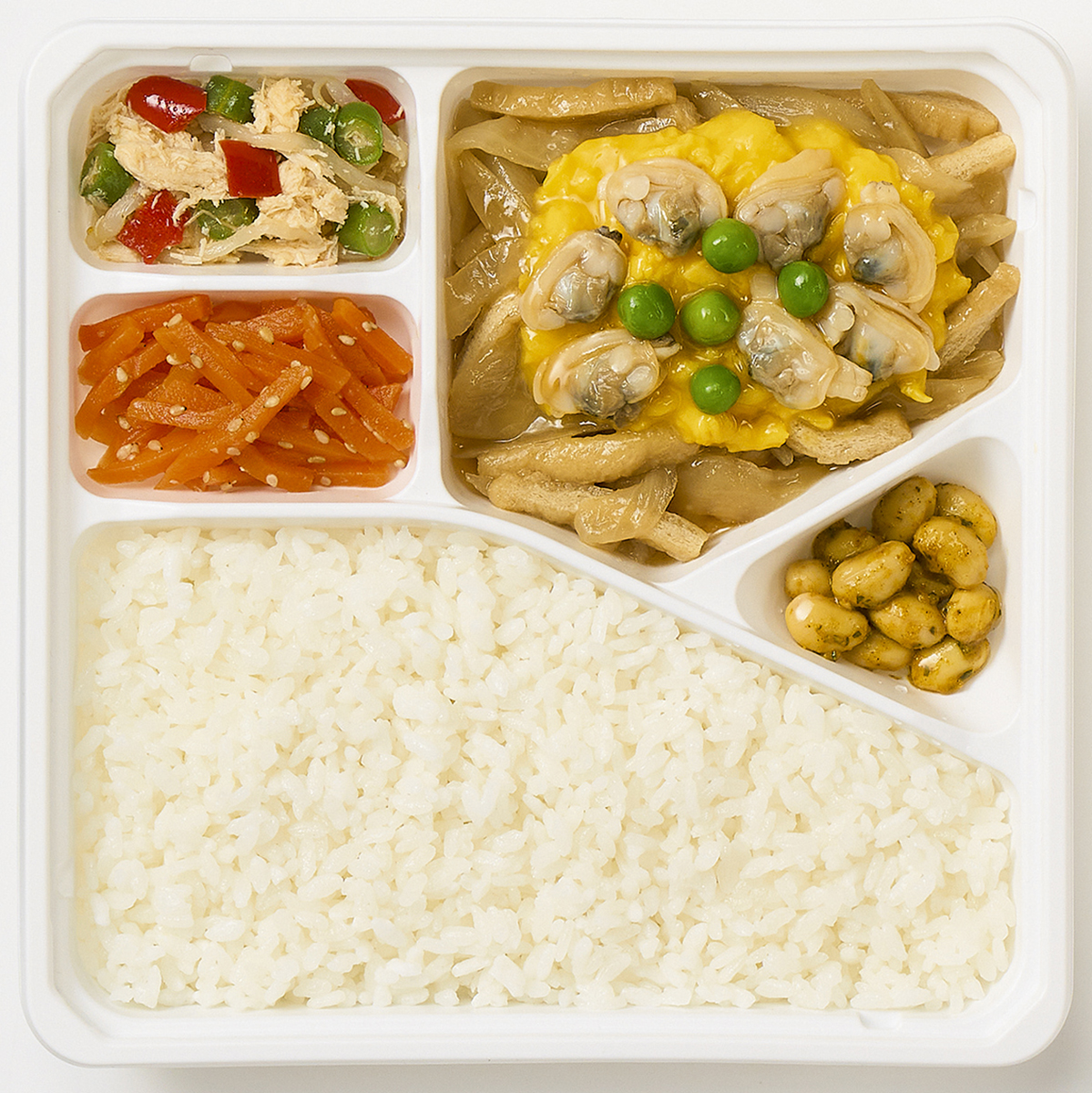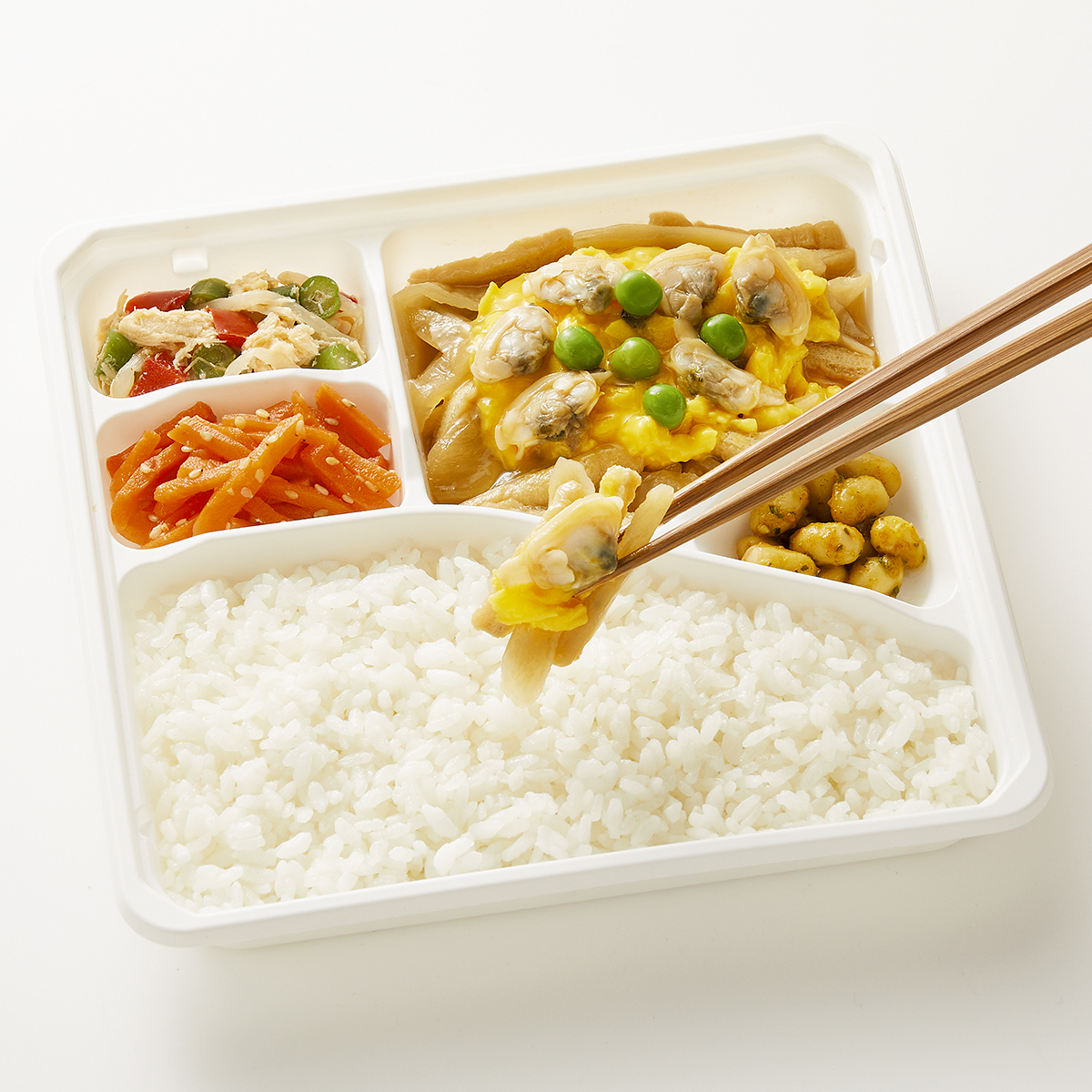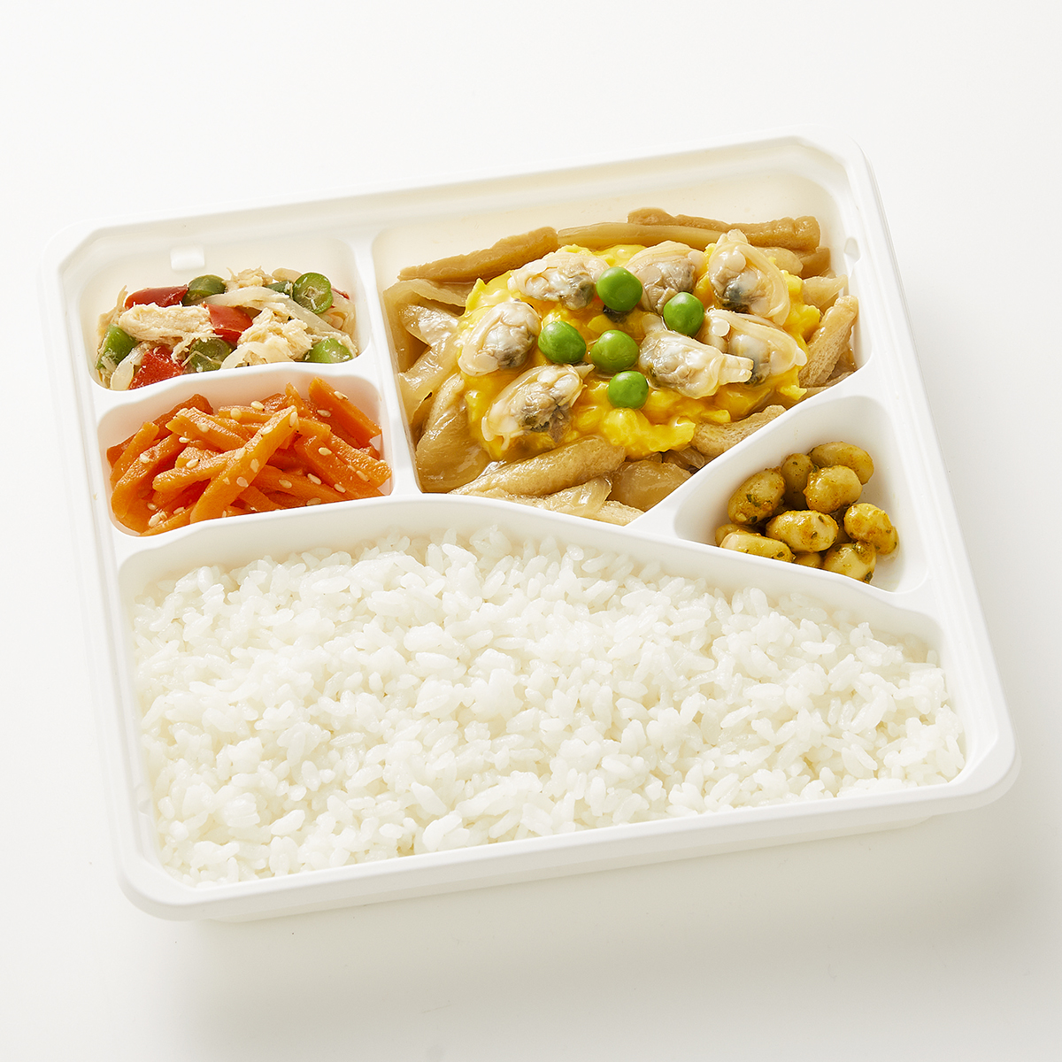 | 原材料名 | 米、卵加工品、ごぼう、ゆであさり、油揚げ、人参、玉ねぎ、緑豆もやし、大豆水煮、蒸し鶏、みりん、醤油、植物油、いんげん、赤ピーマン、グリーンピース、みそだれ、砂糖、ごま、清酒風調味料、かつお節調味料、ごま油、ゼラチン、オリーブ油、カレー粉、コンソメ、パセリ/加工デンプン、増粘剤(加工デンプン、増粘多糖類)、ピロリン酸Na、酸味料、グリシン、pH調整剤、調味料(アミノ酸等)、塩化Ca、酸化防止剤(V.C)、着色料(カラメル、カロチノイド)、(一部に小麦・卵・乳成分・ごま・さば・大豆・鶏肉・ゼラチンを含む) ※あさり等の二枚貝には、かにが共生しています。 | ||
