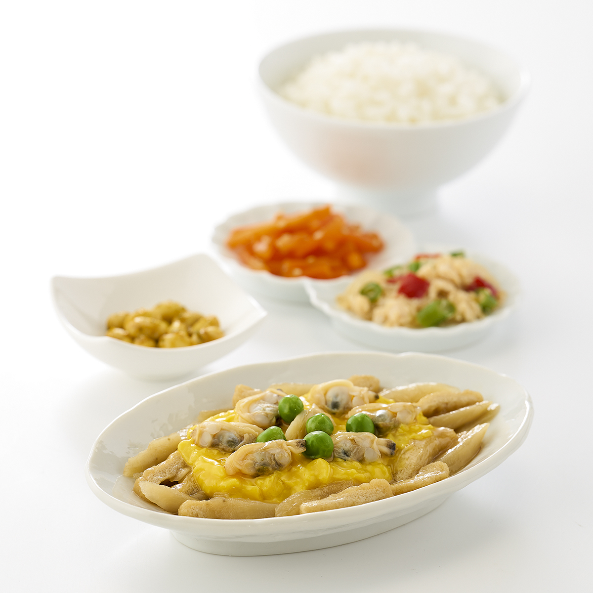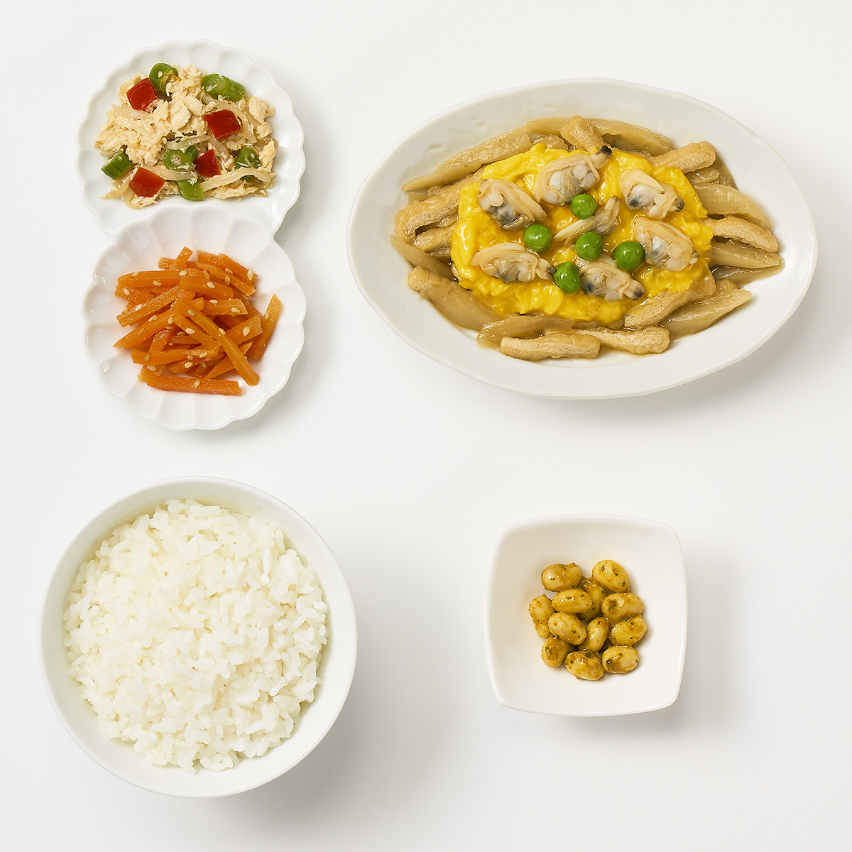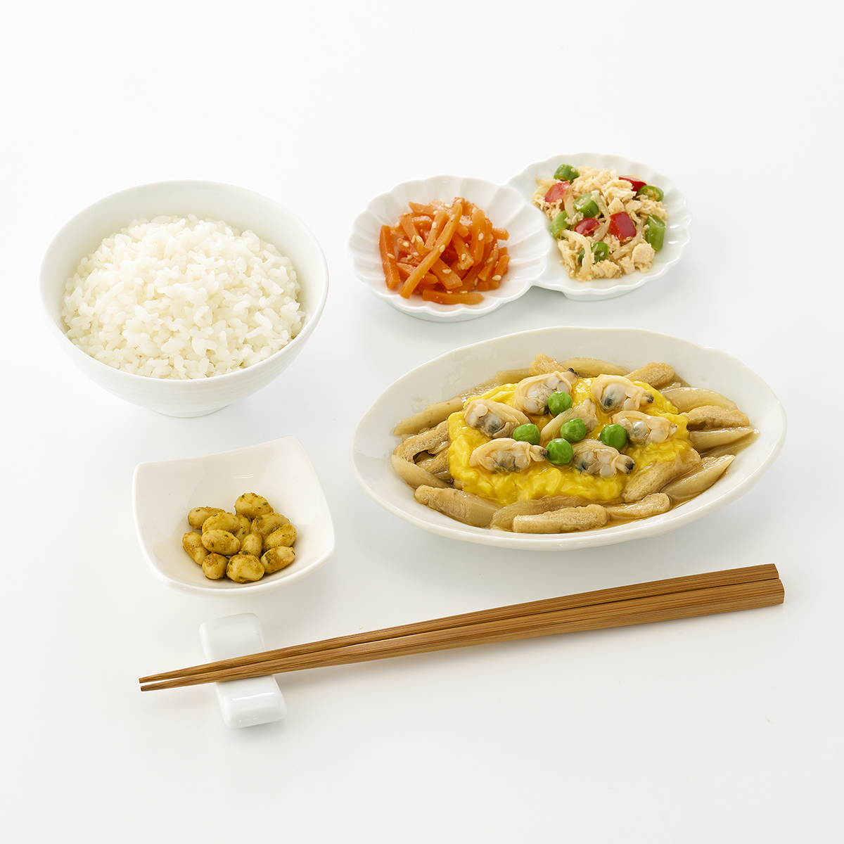 | 原材料名 | 米、卵加工品、ごぼう、ゆであさり、油揚げ、人参、玉ねぎ、緑豆もやし、大豆水煮、蒸し鶏、みりん、醤油、植物油、いんげん、赤ピーマン、グリーンピース、みそだれ、砂糖、ごま、清酒風調味料、かつお節調味料、ごま油、ゼラチン、オリーブ油、カレー粉、コンソメ、パセリ/加工デンプン、増粘剤(加工デンプン、増粘多糖類)、ピロリン酸Na、酸味料、グリシン、pH調整剤、調味料(アミノ酸等)、塩化Ca、酸化防止剤(V.C)、着色料(カラメル、カロチノイド)、(一部に小麦・卵・乳成分・ごま・さば・大豆・鶏肉・ゼラチンを含む) ※あさり等の二枚貝には、かにが共生しています。 | ||