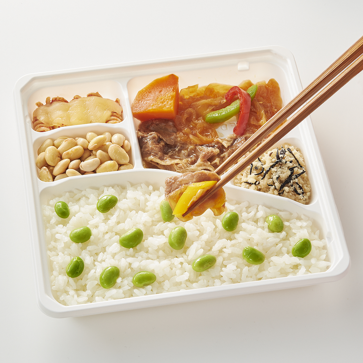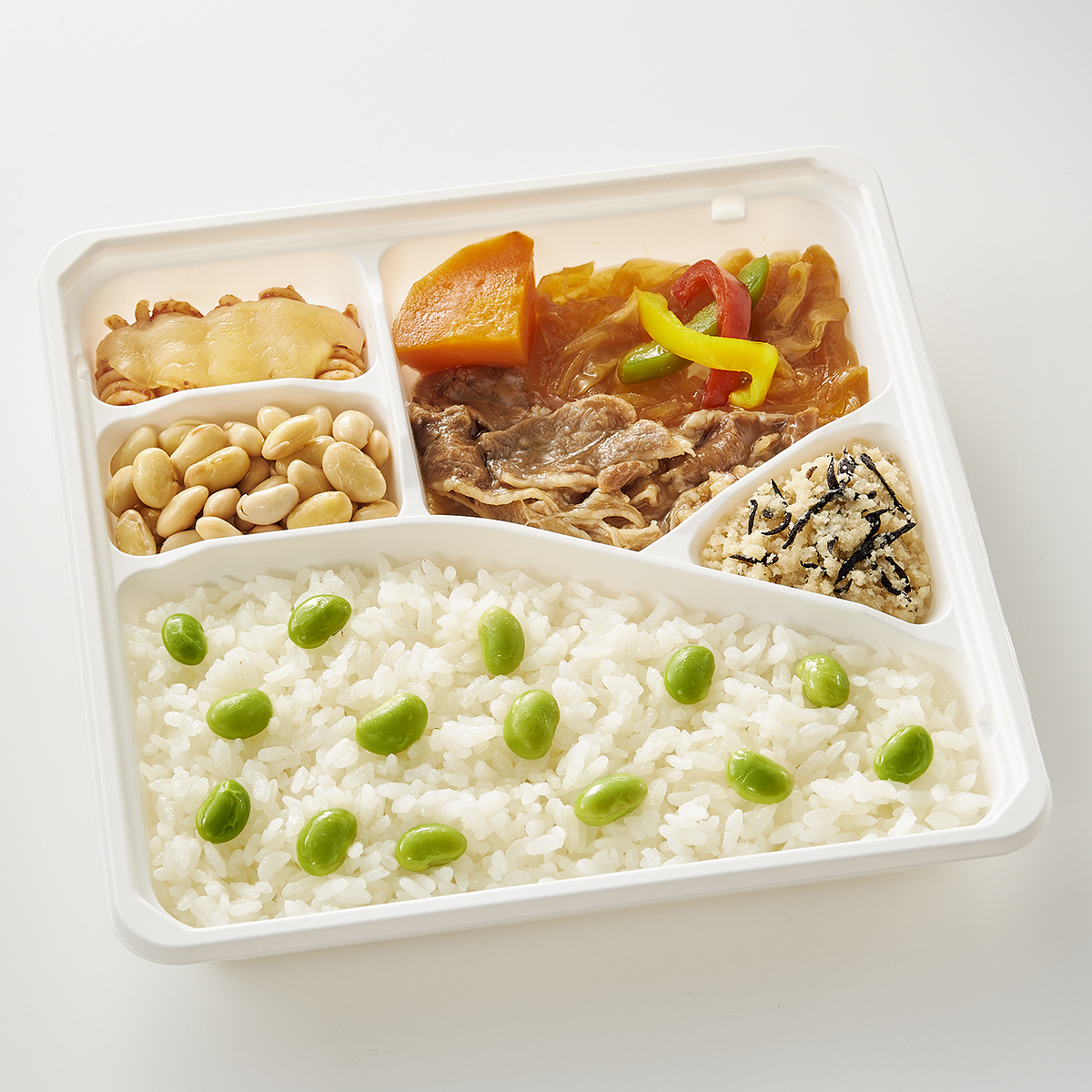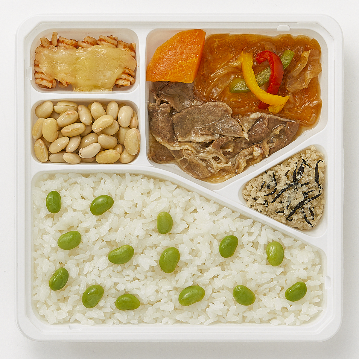 | 原材料名 | うるち米(日本産)、大豆加工品、水煮大豆、ピーマン、玉ねぎ、マカロニ、牛肉(アメリカ産)、人参、枝豆、キャベツ、砂糖、ケチャップ、チーズ、発酵調味料、醤油、植物油、みりん風調味料、おから、ひじき、醤油だし、にんにく、調合ごま油、トウバンジャン、食塩、しょうが/糊料(加工でん粉、増粘多糖類)、セルロース、調味料(アミノ酸等)、乳酸Ca、pH調整剤、酸味料、酸化防止剤(V.E、V.C、チャ抽出物)、(一部に小麦・乳成分・オレンジ・牛肉・ごま・さば・大豆を含む) 原材料配合割合(仕込み時):ピーマン3%玉ねぎ3%牛肉2%人参2%枝豆2%キャベツ1% | ||