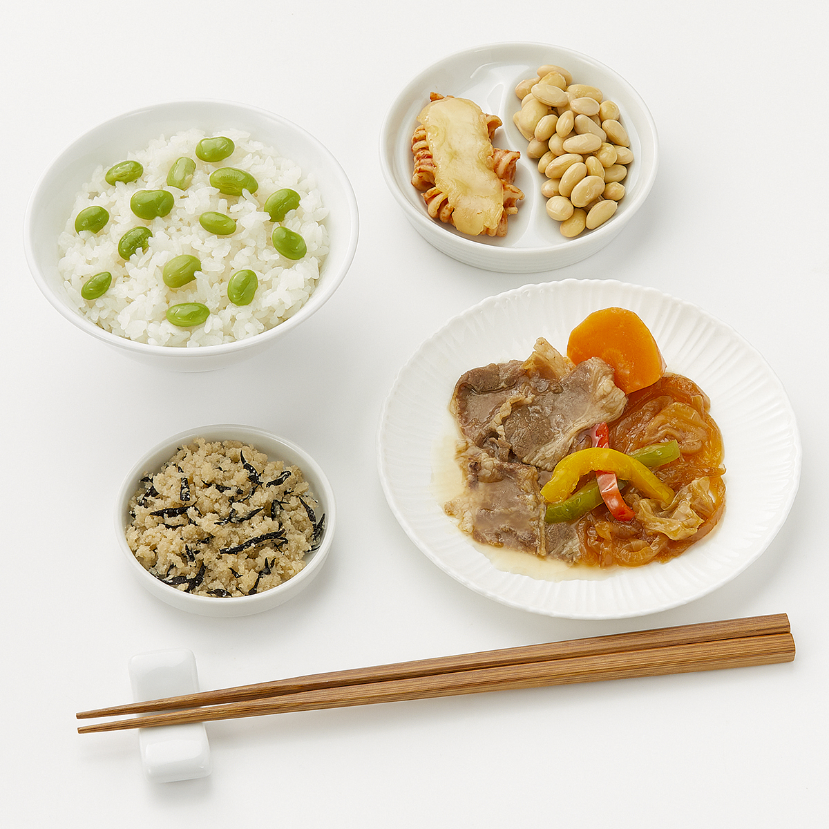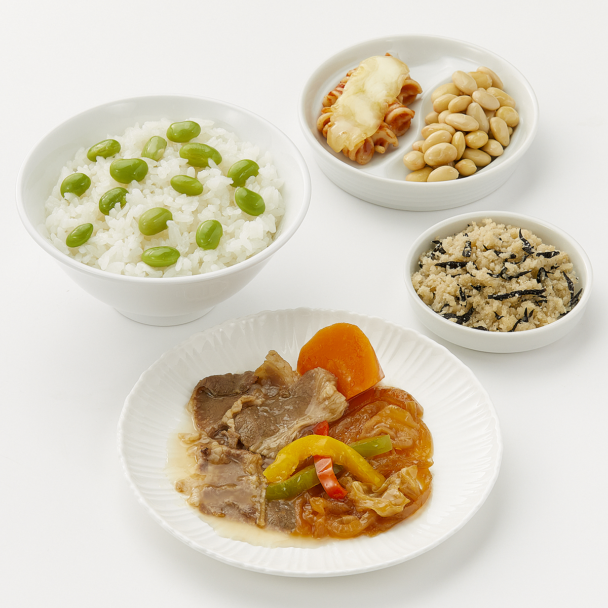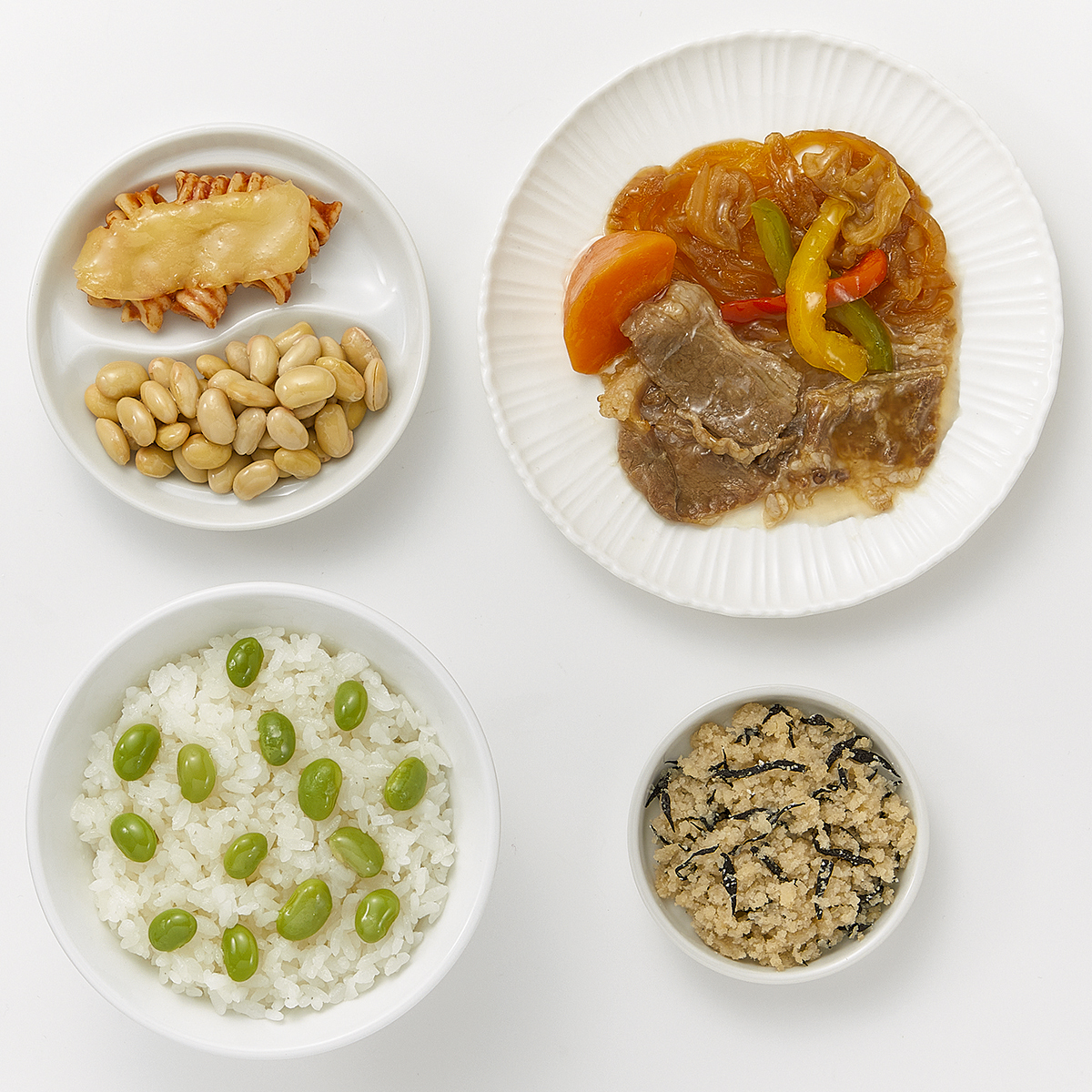 | 原材料名 | うるち米(日本産)、大豆加工品、水煮大豆、ピーマン、玉ねぎ、マカロニ、牛肉(アメリカ産)、人参、枝豆、キャベツ、砂糖、ケチャップ、チーズ、発酵調味料、醤油、植物油、みりん風調味料、おから、ひじき、醤油だし、にんにく、調合ごま油、トウバンジャン、食塩、しょうが/糊料(加工でん粉、増粘多糖類)、セルロース、調味料(アミノ酸等)、乳酸Ca、pH調整剤、酸味料、酸化防止剤(V.E、V.C、チャ抽出物)、(一部に小麦・乳成分・オレンジ・牛肉・ごま・さば・大豆を含む) 原材料配合割合(仕込み時):ピーマン3%玉ねぎ3%牛肉2%人参2%枝豆2%キャベツ1% | ||