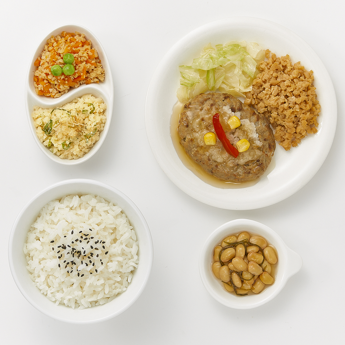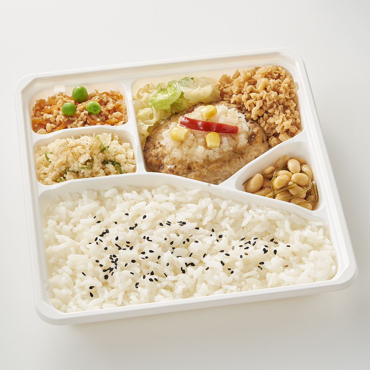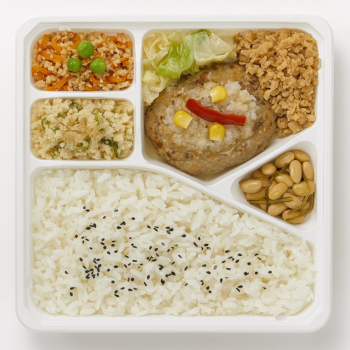 | 原材料名 | 原材料名:うるち米(日本産)、鶏肉ハンバーグ、大豆加工品、水煮大豆、人参、ガラクトマンナン分解物、大根おろし、キャベツ、砂糖、みりん風調味料、植物油、発酵調味料、醤油、ピーマン、おから、ねぎ、加工酢、とうもろこし、グリーンピース、醤油だし、ごま、こんぶ加工品、調合ごま油、かつお削り節、還元でん粉加水分解物/糊料(加工でん粉)、調味料(アミノ酸等)、pH調整剤、リン酸塩(Na)、着色料(ココア)、酸味料、酢酸、酒精、(一部に小麦・乳成分・牛肉・ごま・さば・大豆・鶏肉を含む) 原材料配合割合(仕込み時):鶏肉ハンバーグ16% | ||