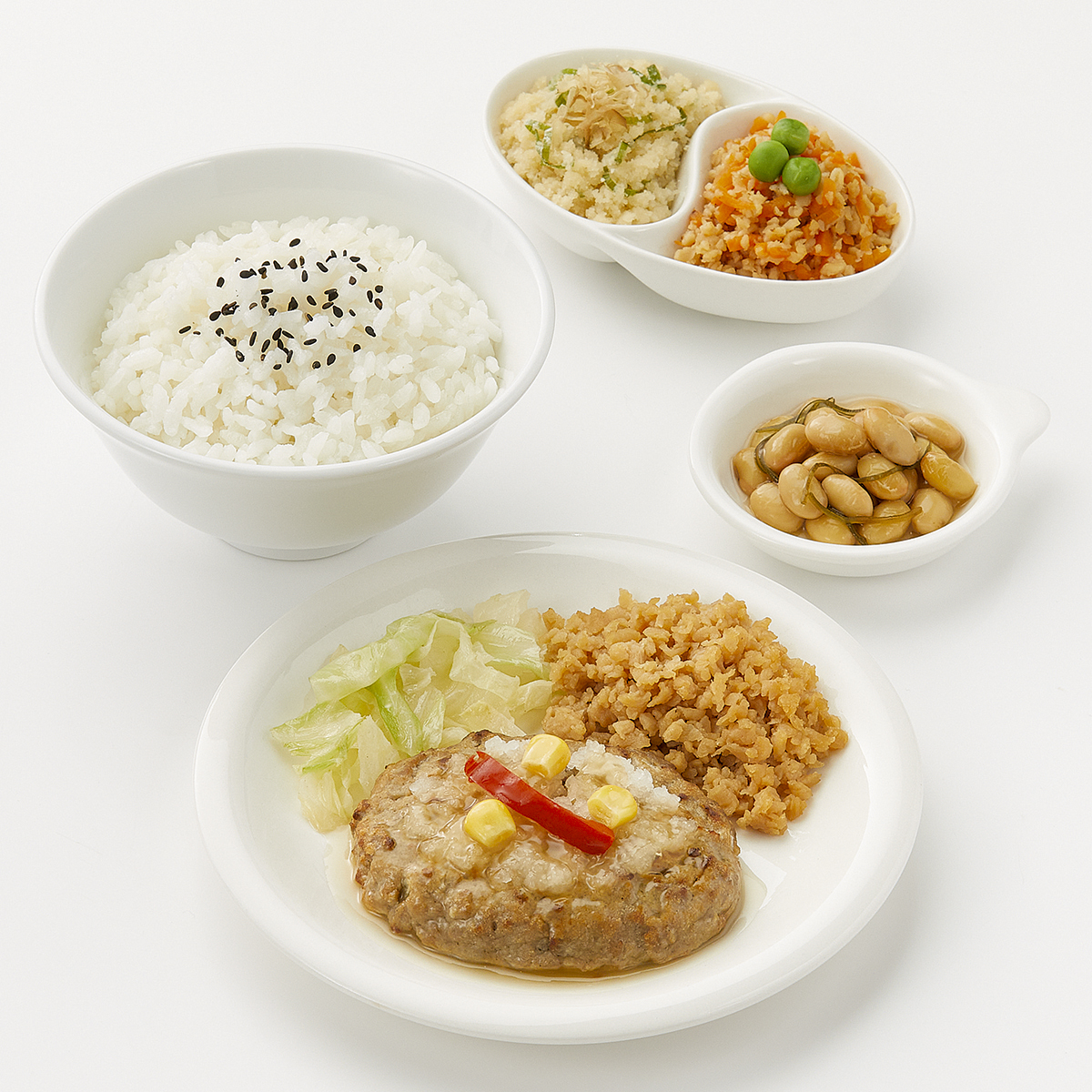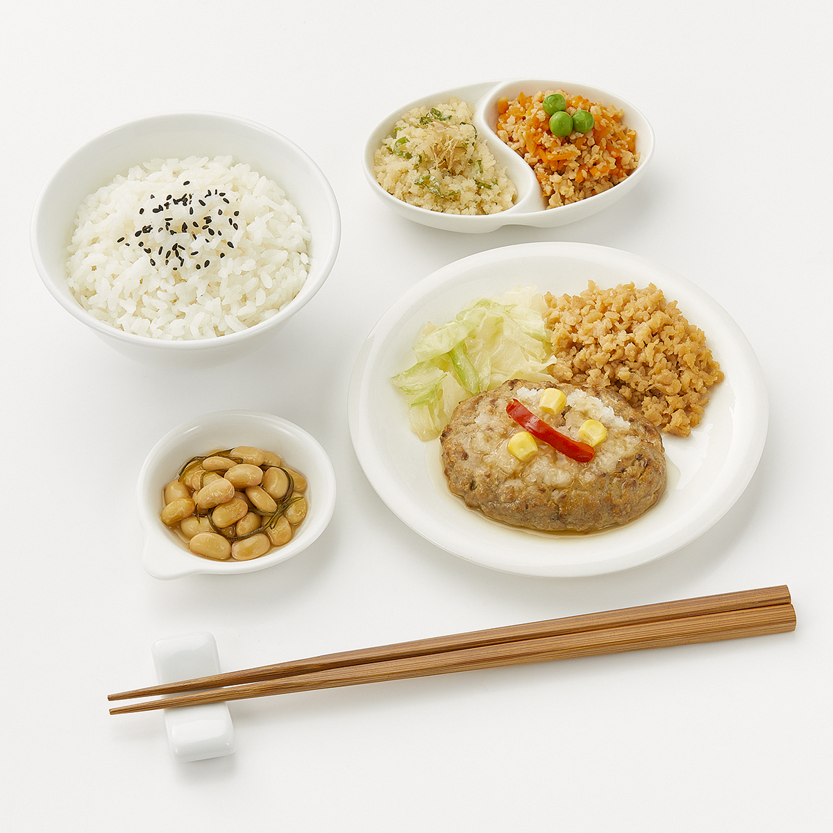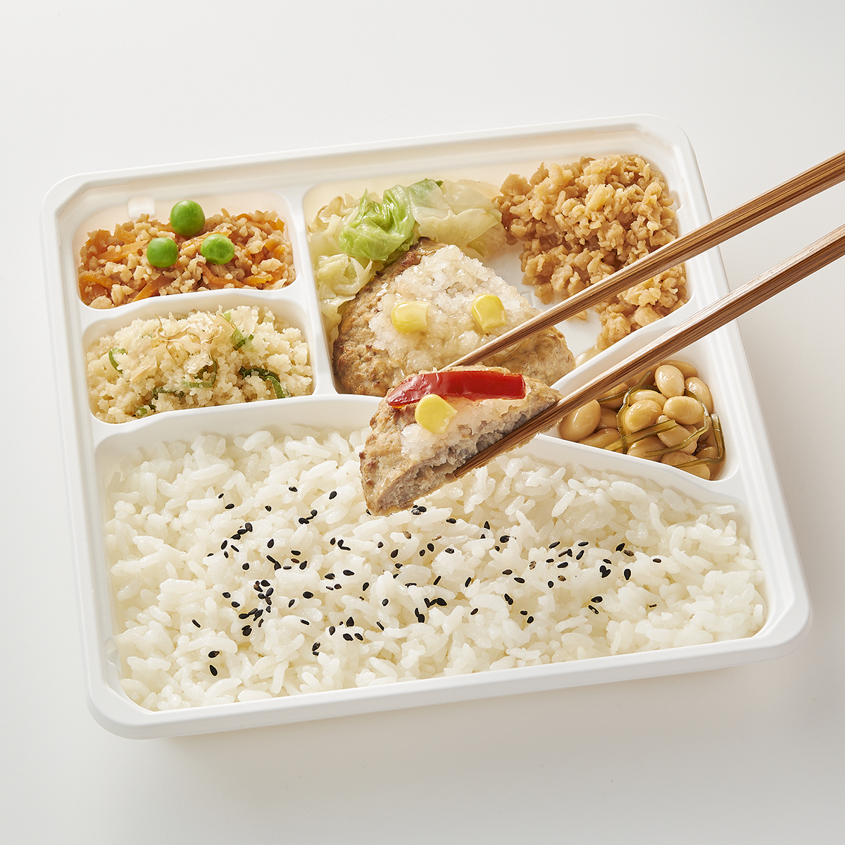 | 原材料名 | 原材料名:うるち米(日本産)、鶏肉ハンバーグ、大豆加工品、水煮大豆、人参、ガラクトマンナン分解物、大根おろし、キャベツ、砂糖、みりん風調味料、植物油、発酵調味料、醤油、ピーマン、おから、ねぎ、加工酢、とうもろこし、グリーンピース、醤油だし、ごま、こんぶ加工品、調合ごま油、かつお削り節、還元でん粉加水分解物/糊料(加工でん粉)、調味料(アミノ酸等)、pH調整剤、リン酸塩(Na)、着色料(ココア)、酸味料、酢酸、酒精、(一部に小麦・乳成分・牛肉・ごま・さば・大豆・鶏肉を含む) 原材料配合割合(仕込み時):鶏肉ハンバーグ16% | ||